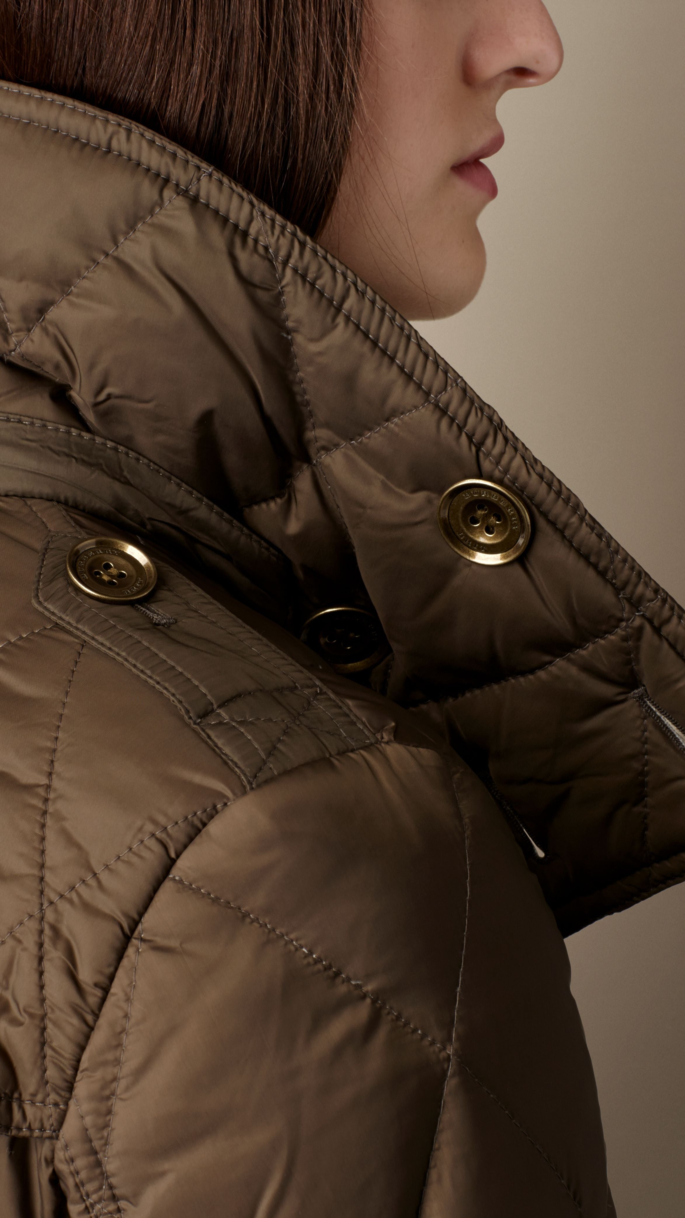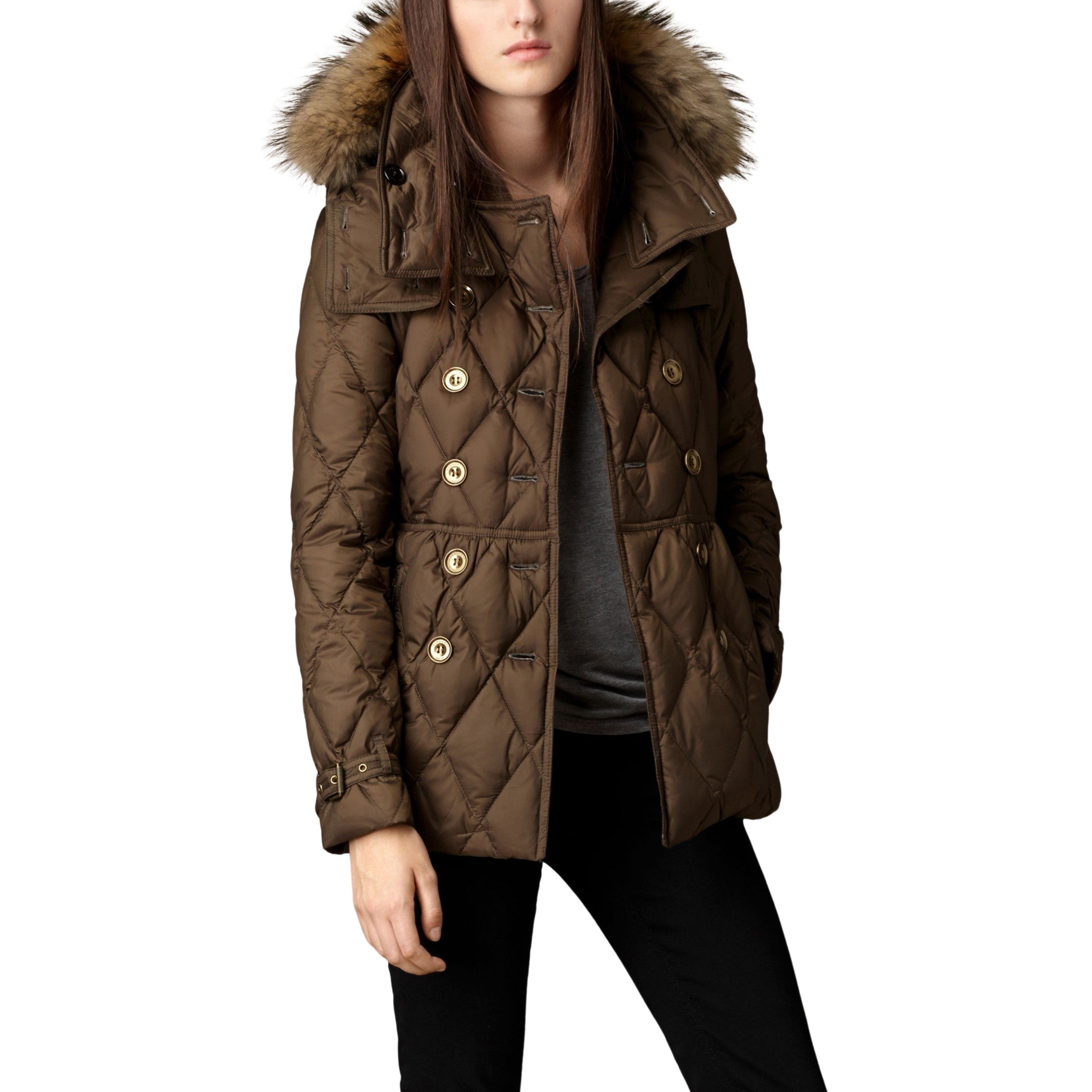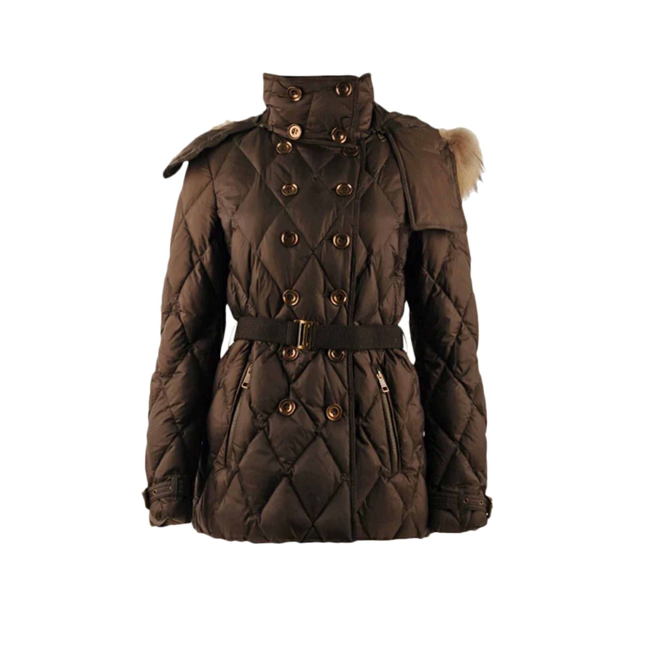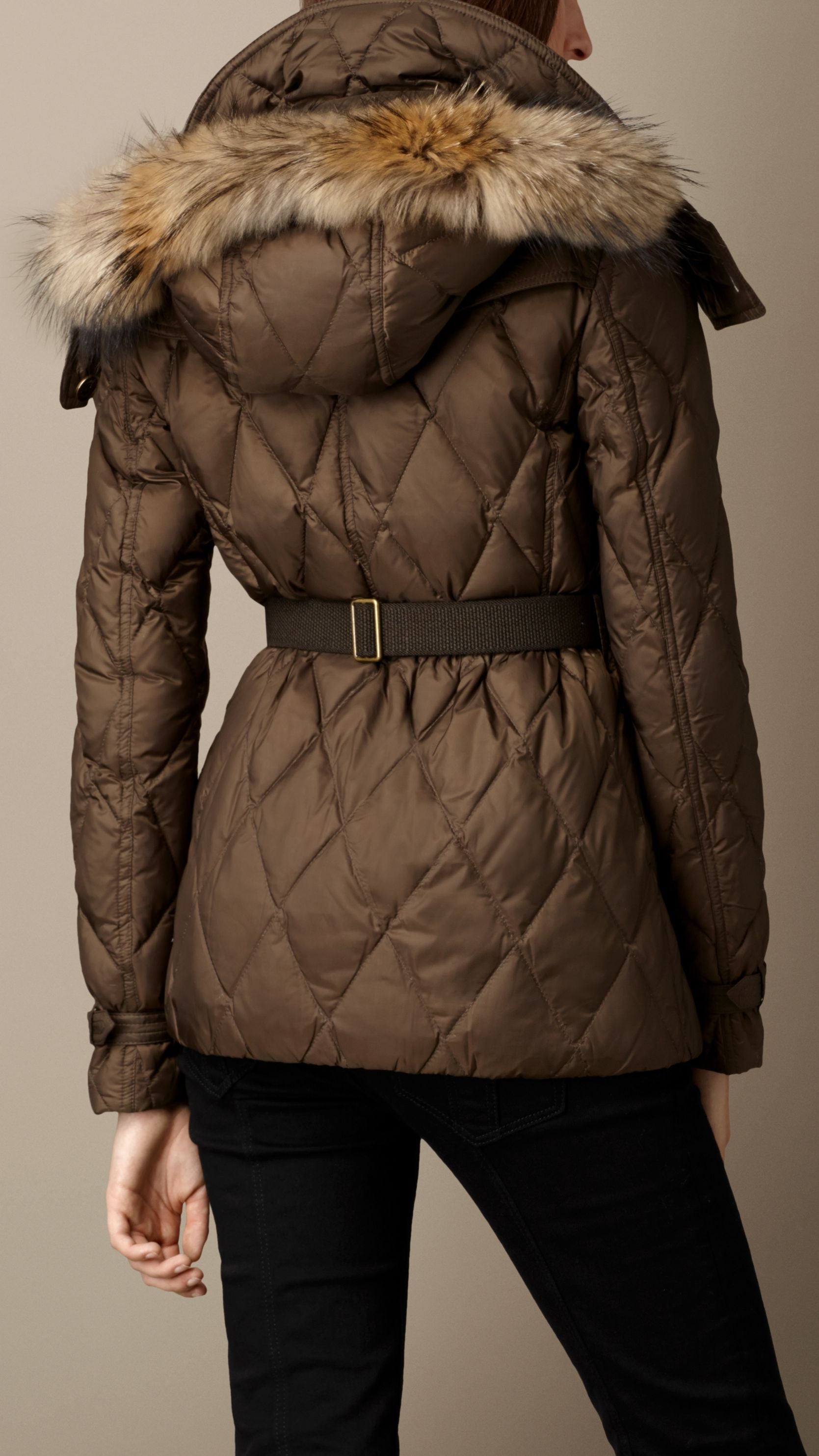 Doudoune longue capitonnée rembourrée en duvet avec capuche amovible et bordure en fourrure de raton laveur.