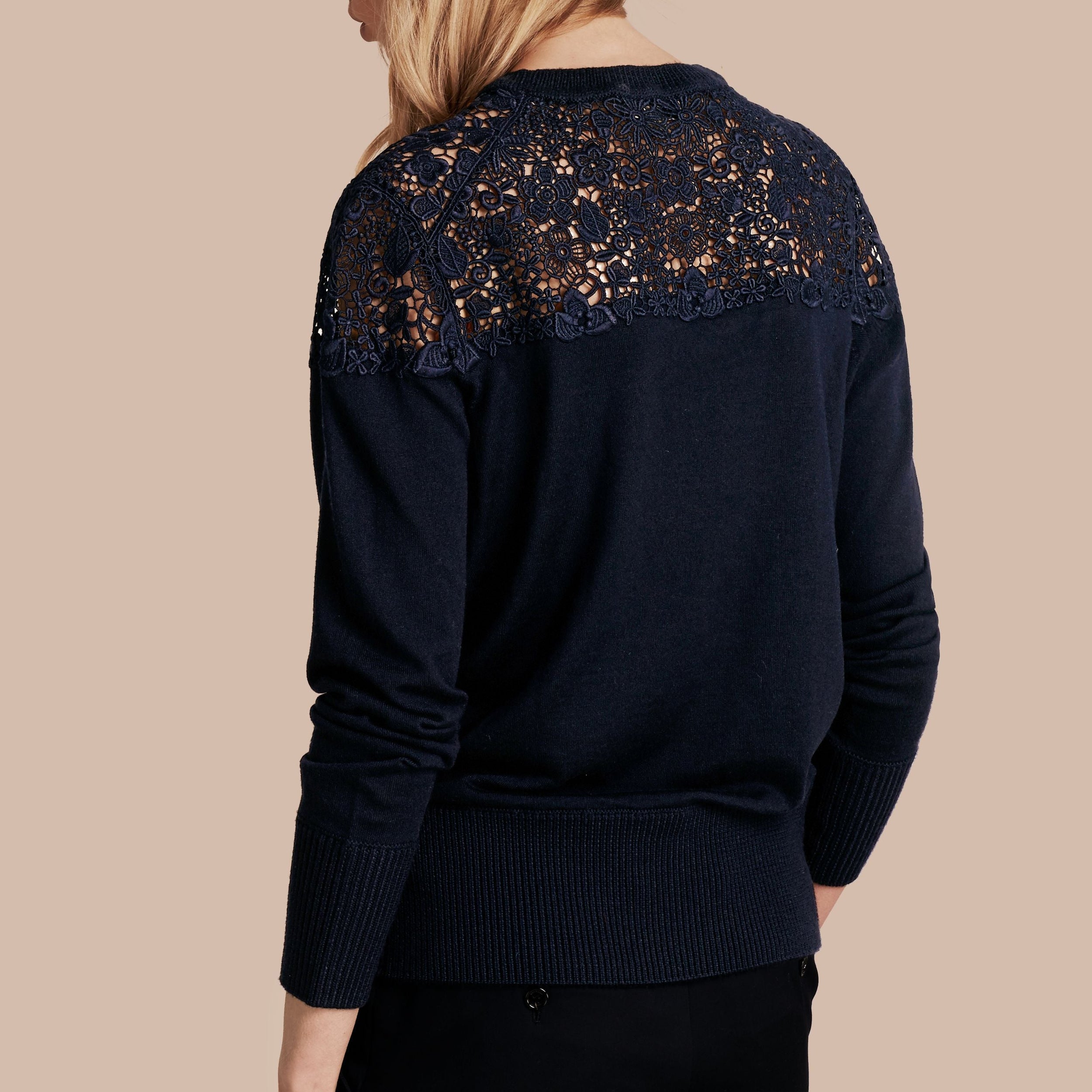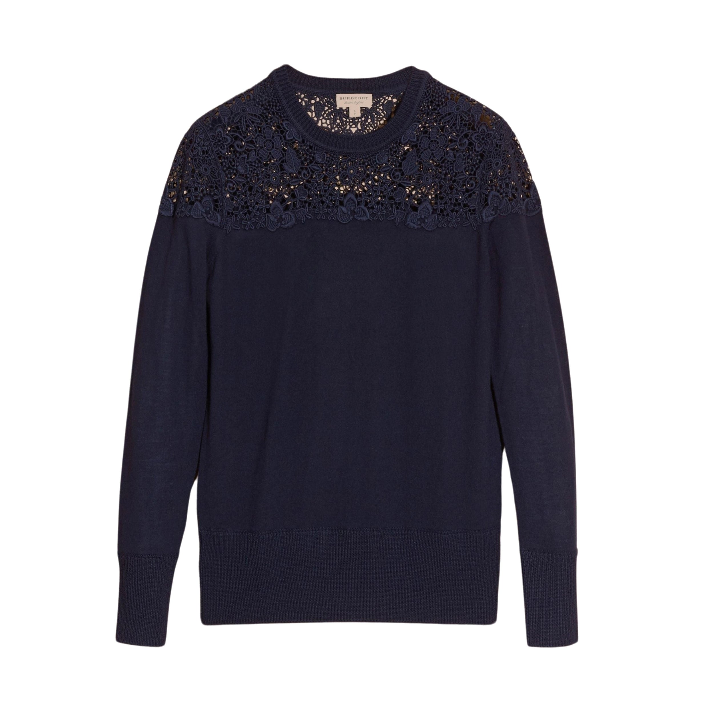 Pull à col ras du cou de coupe décontractée, tissé en laine mérinos douce, avec empiècement en dentelle florale italienne. Portez-le rentré dans une jupe ou par-dessus un pantalon.