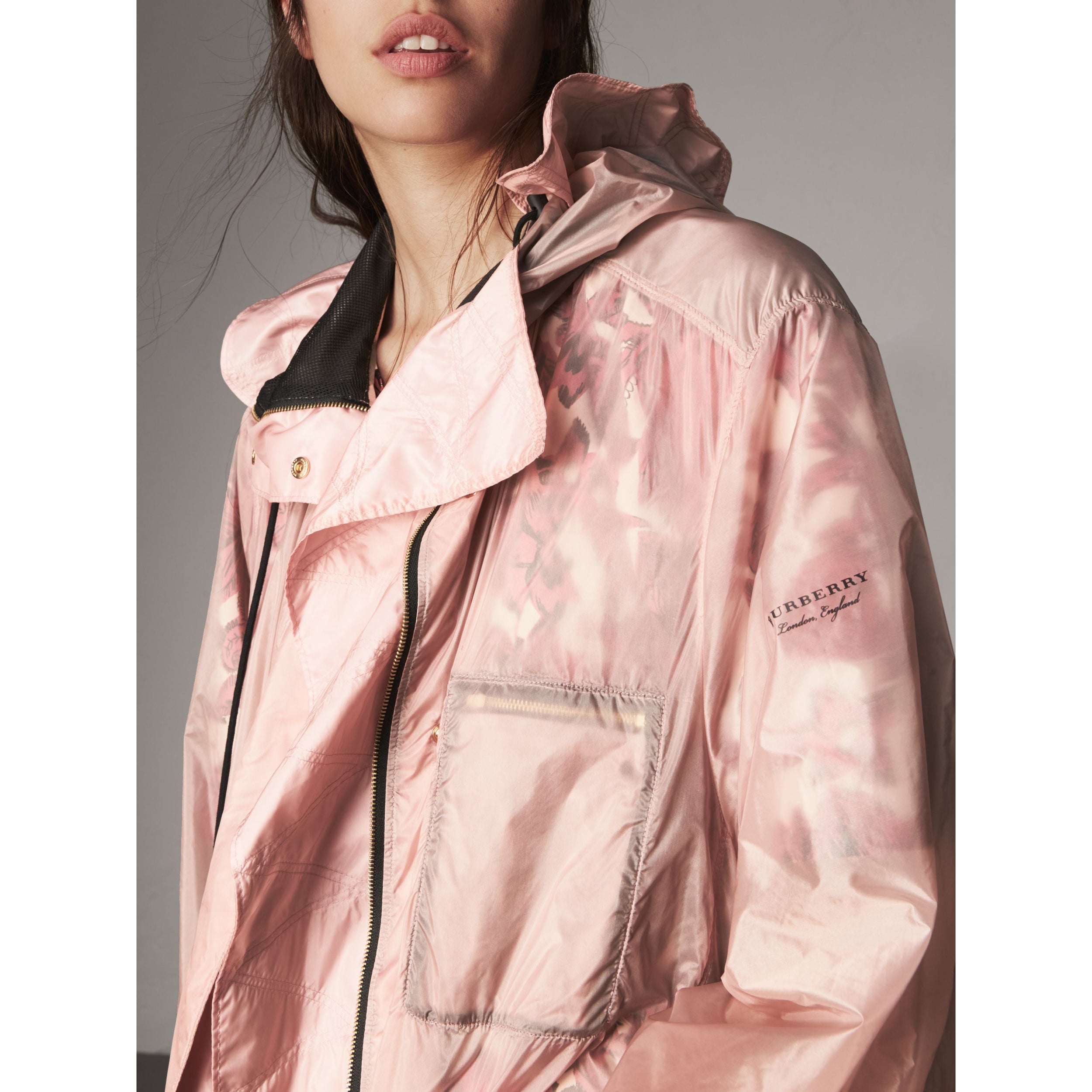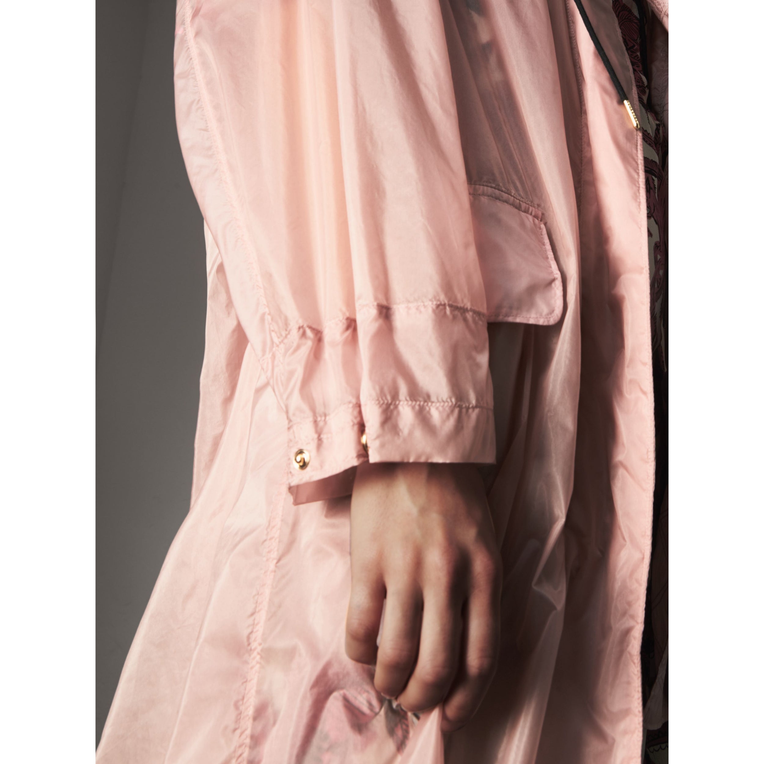 Parka légère de coupe oversize dotée d'une capuche. La pièce imperméable est agrémentée de passepoils ton sur ton sur la capuche doublée de filet ainsi que sur l'encolure. Elle présente plusieurs poches à l'avant et un cordon de serrage à la base.