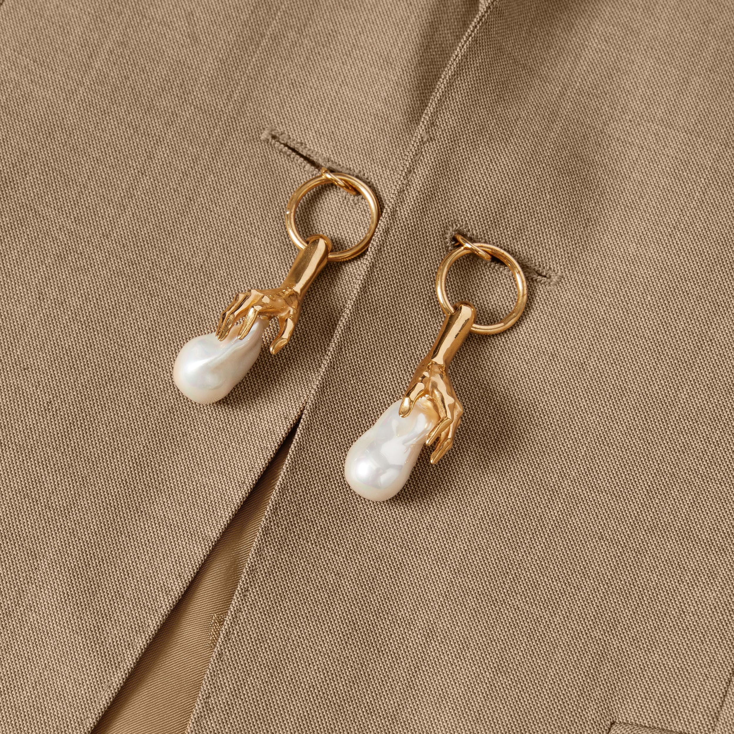Ce blazer en laine et cachemire est orné d'un fermoir à maillon composé d'une main plaquée or et de perles en verre, inspiré des chaînes de montre.