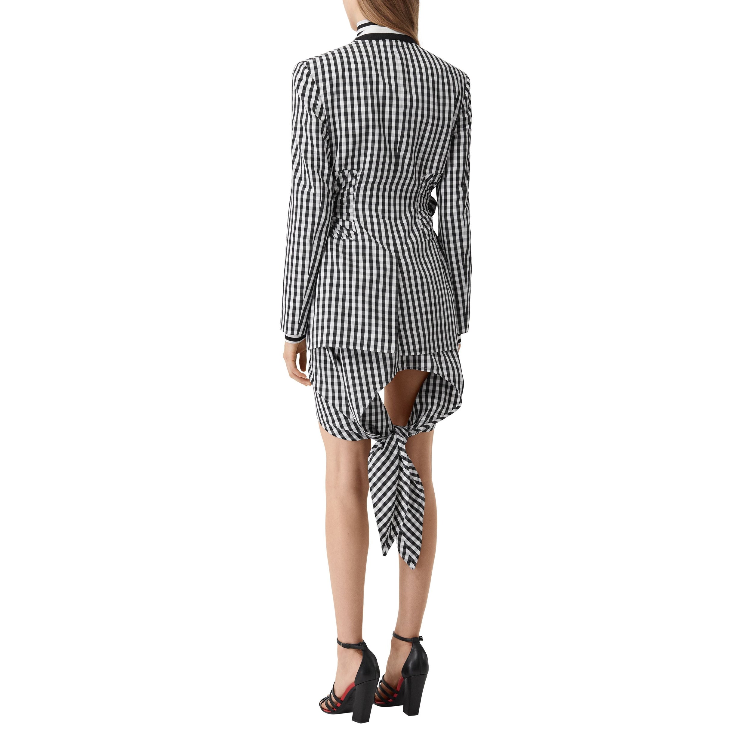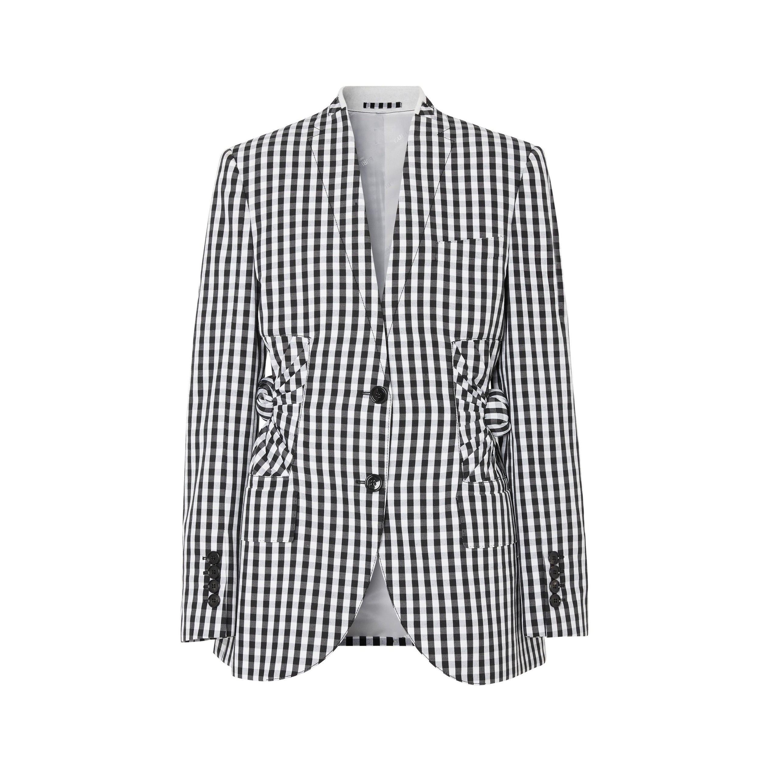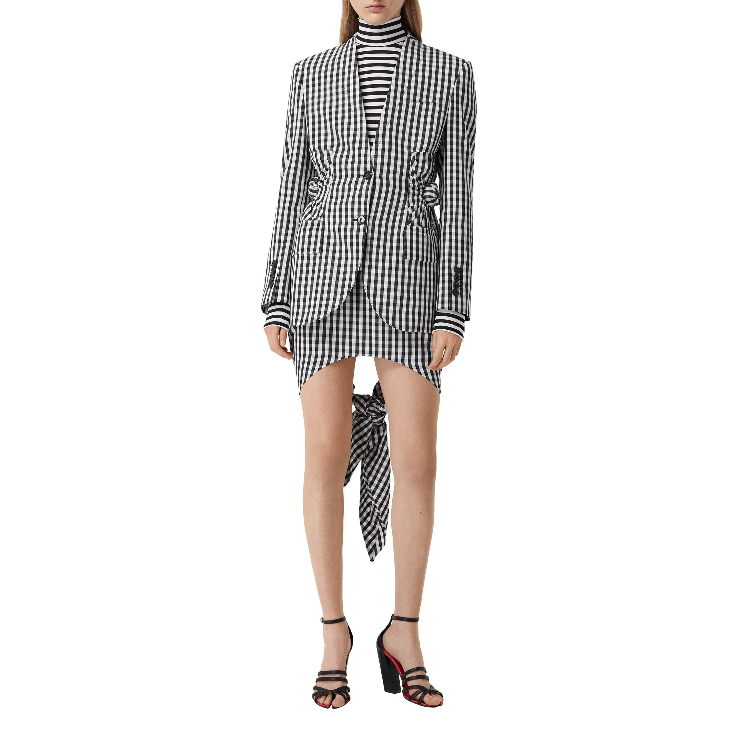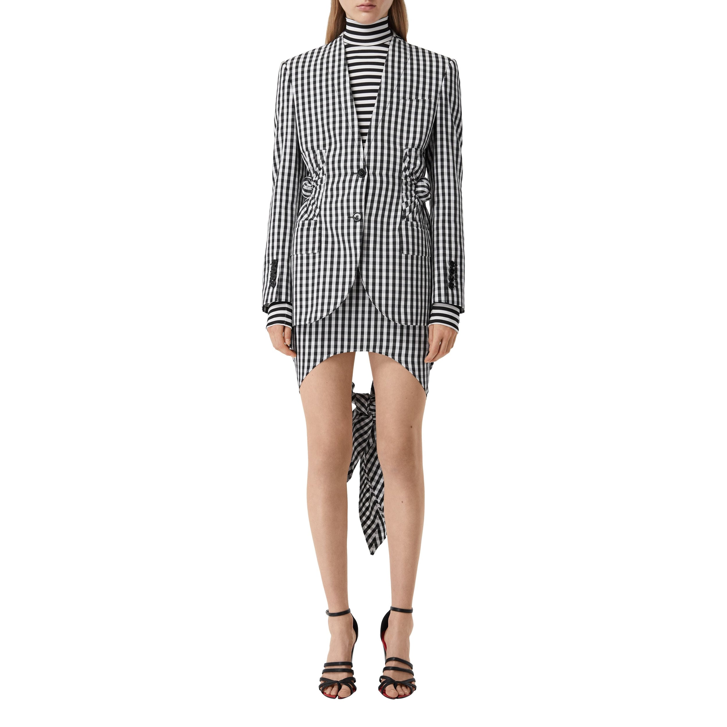 Ce blazer sans col confectionné en Italie en laine technique vichy est agrémenté de détails froncés à la main cintrant la taille.