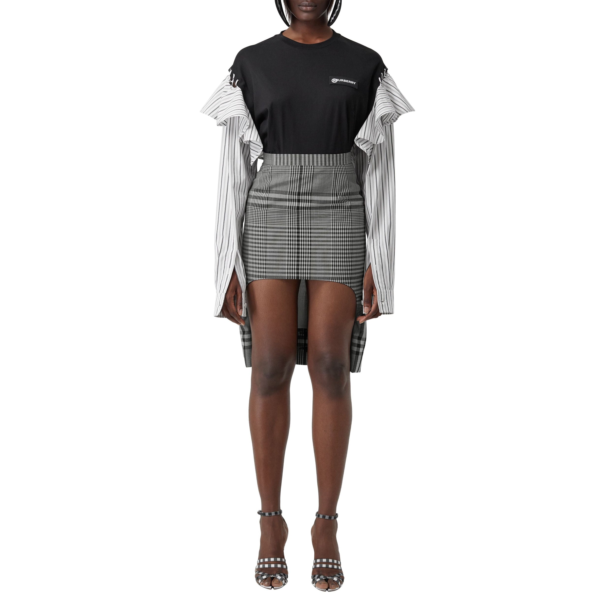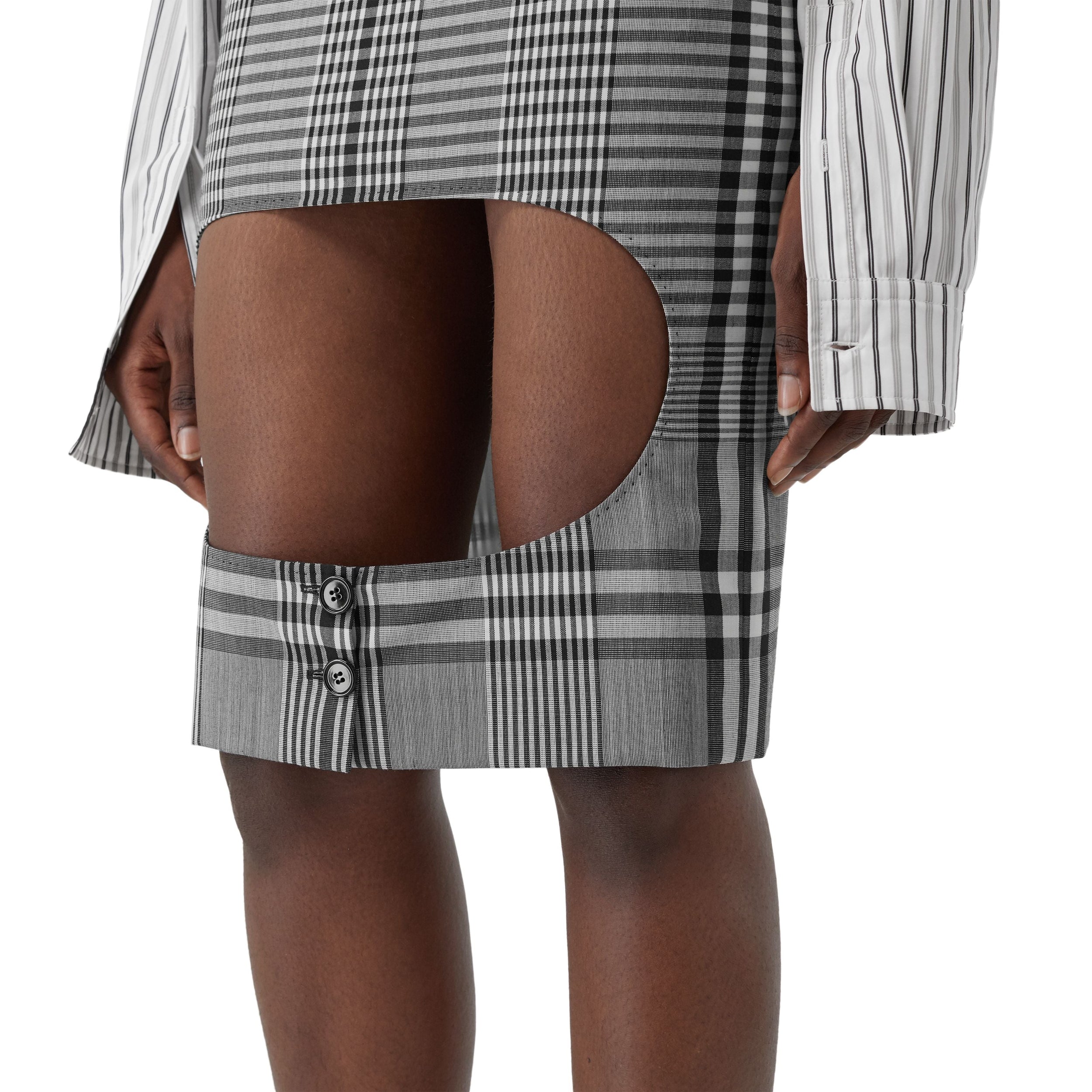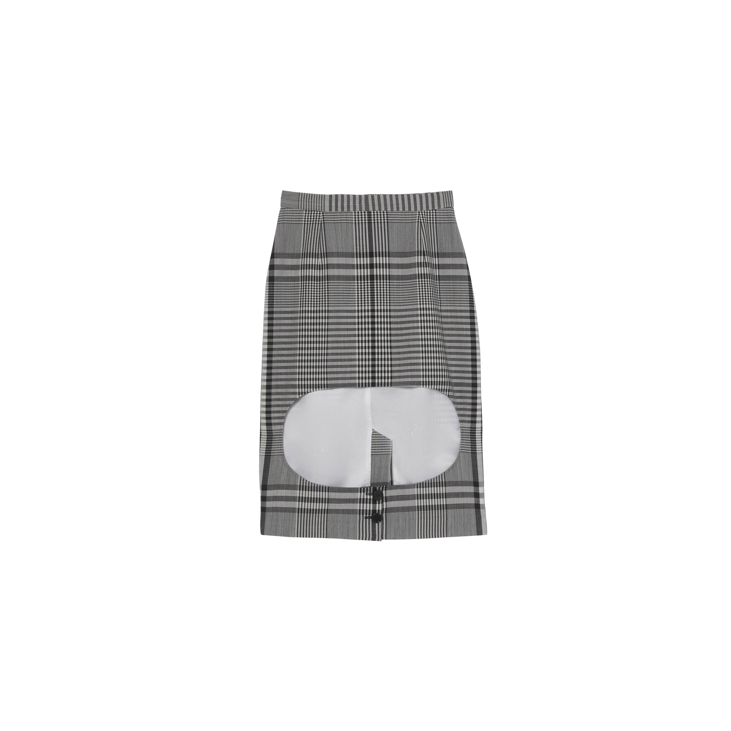 Jupe tailleur en laine technique à motif check, revisitée d'une découpe à large ouverture.