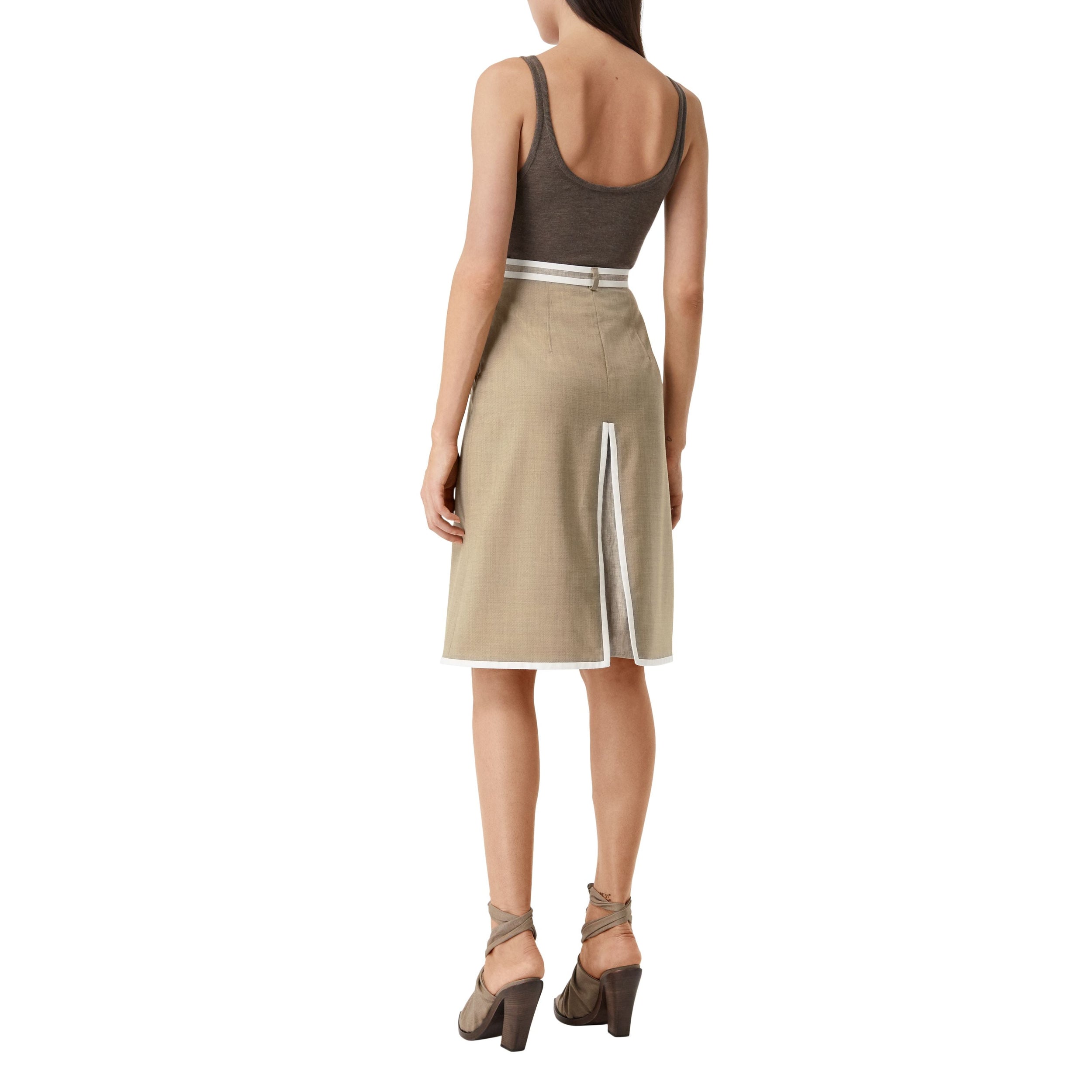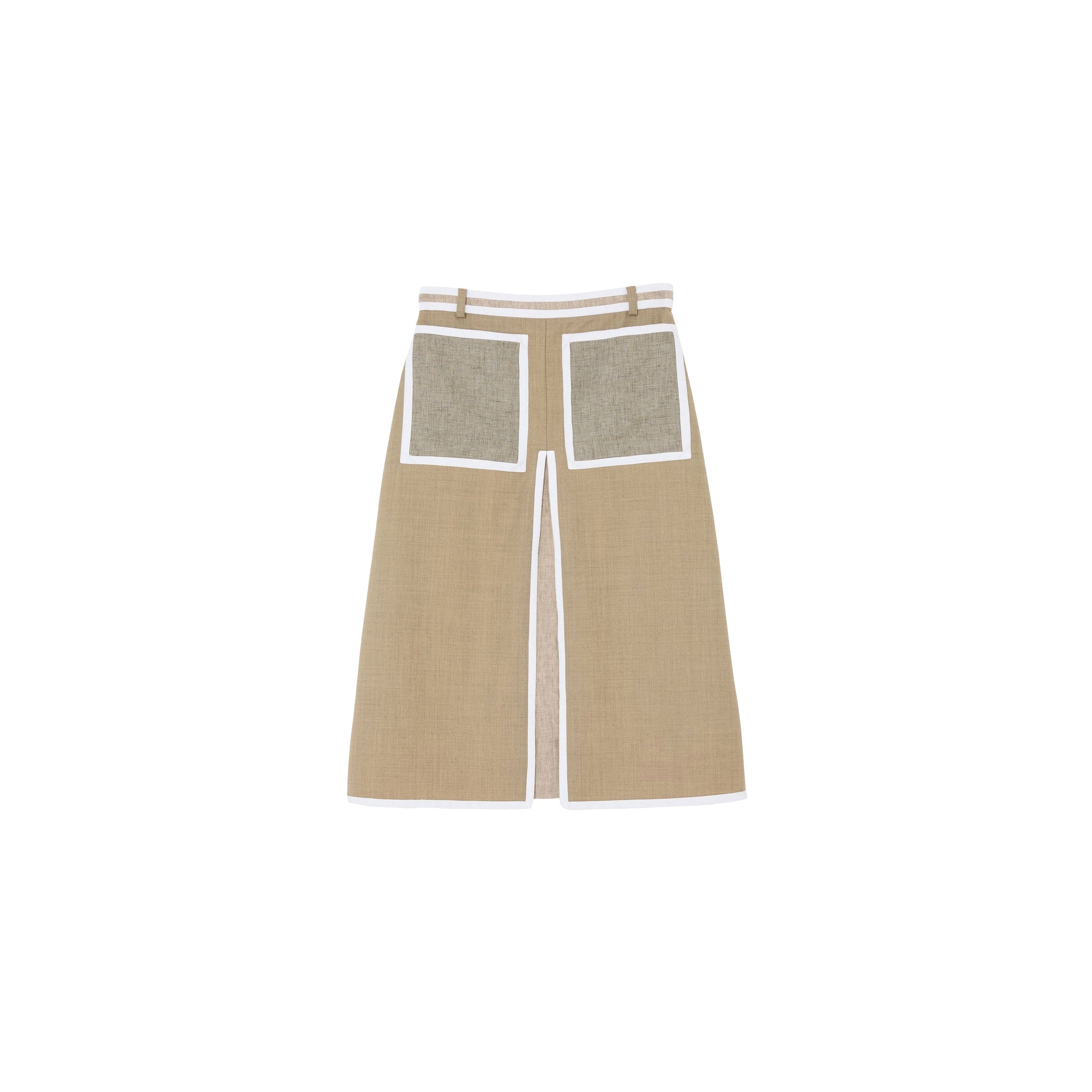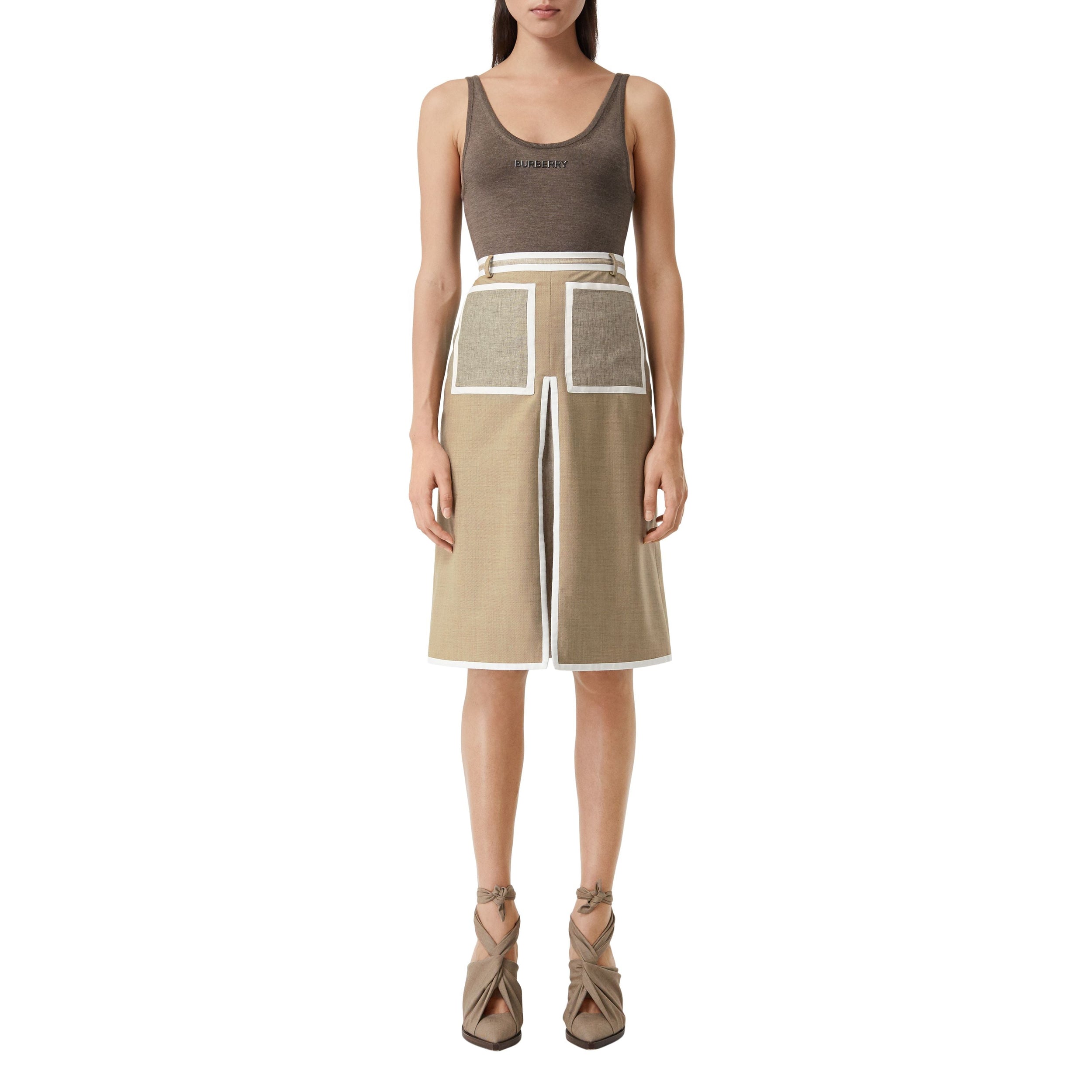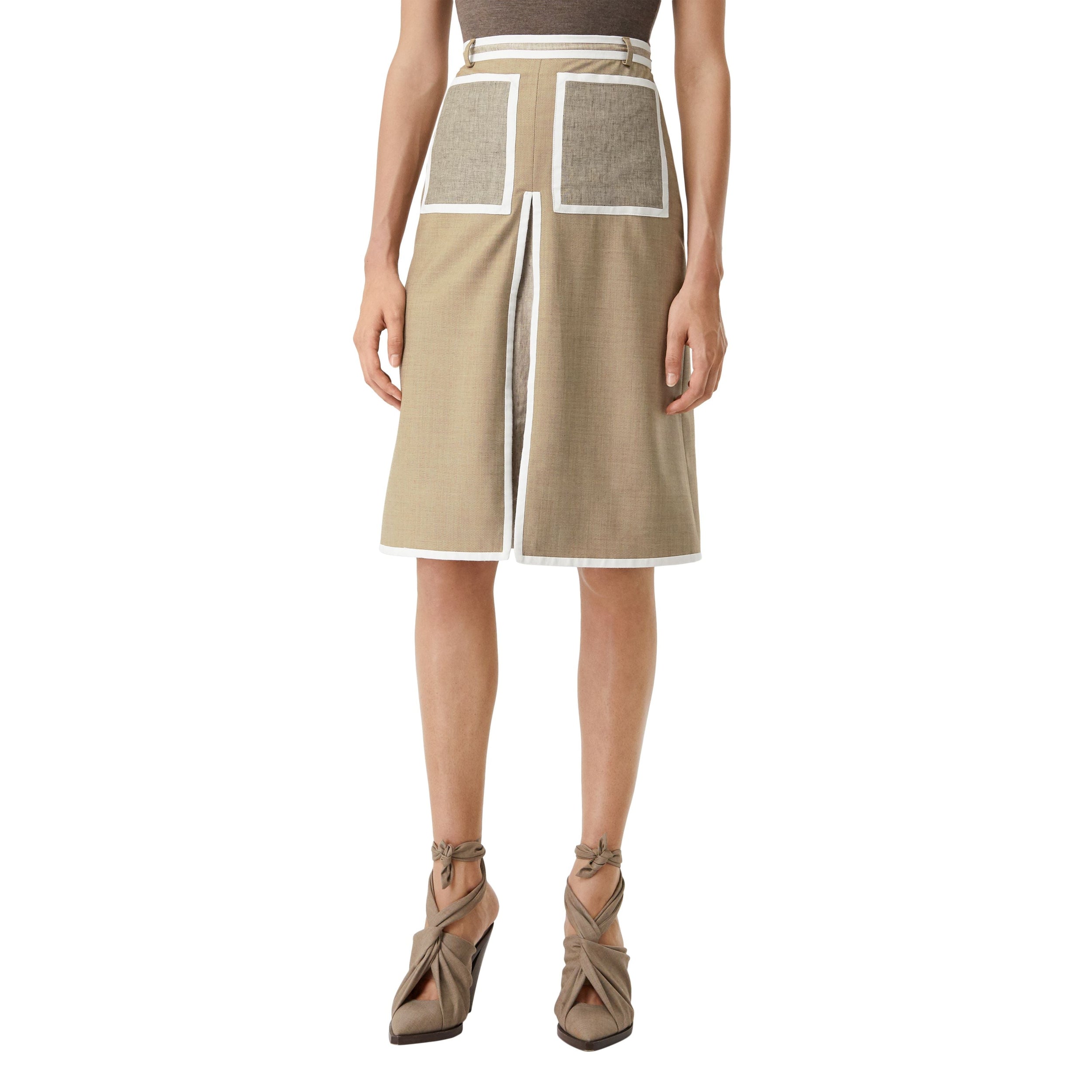 Cette jupe trapèze se compose de panneaux ton sur ton en laine, cachemire et lin. La pièce est agrémentée de plis ronds et de poches plaquées.