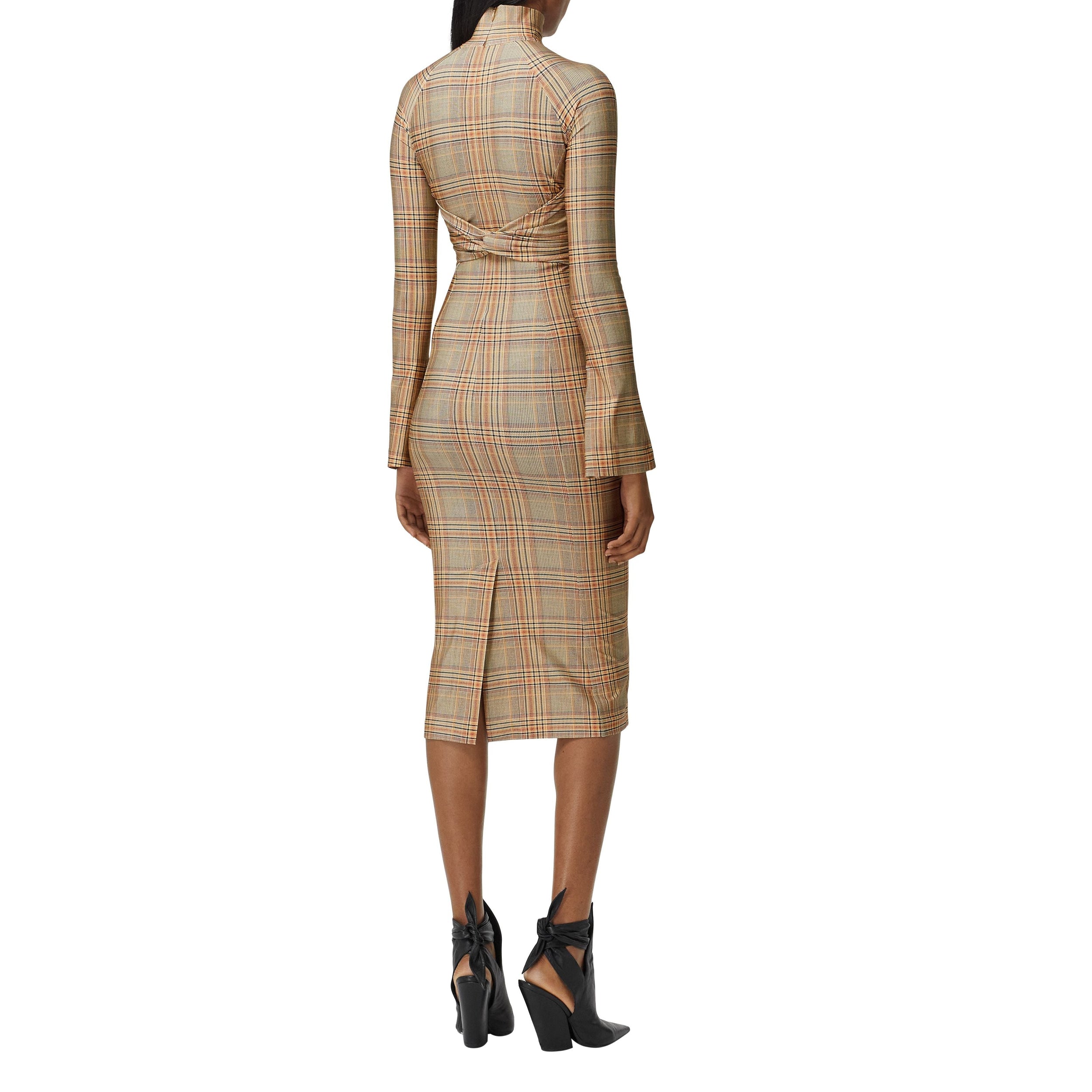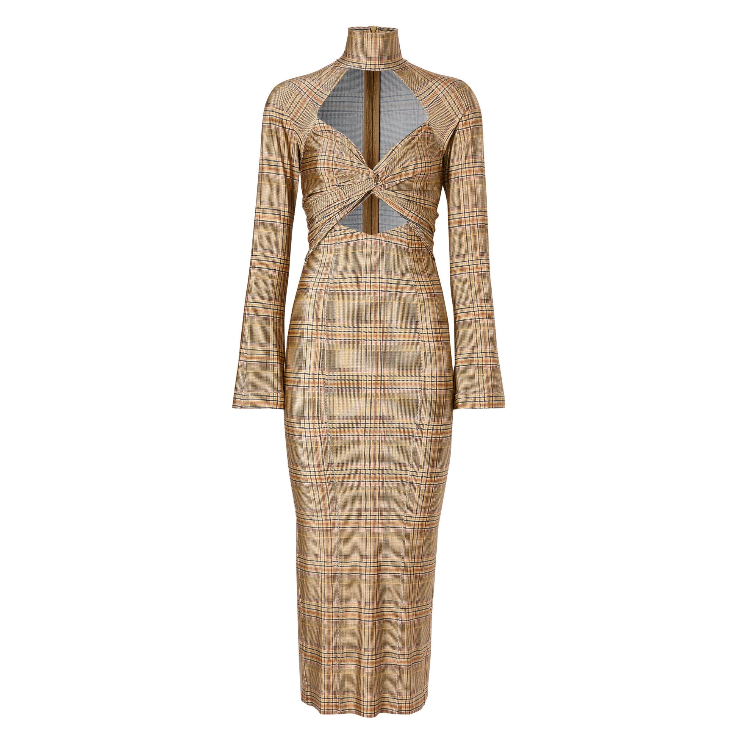 Cette robe à col montant et manches longues est confectionnée en jersey stretch, pour une silhouette sculptée. La pièce est sublimée de notre imprimé à motif check ainsi que d'une découpe et de détails froncés.