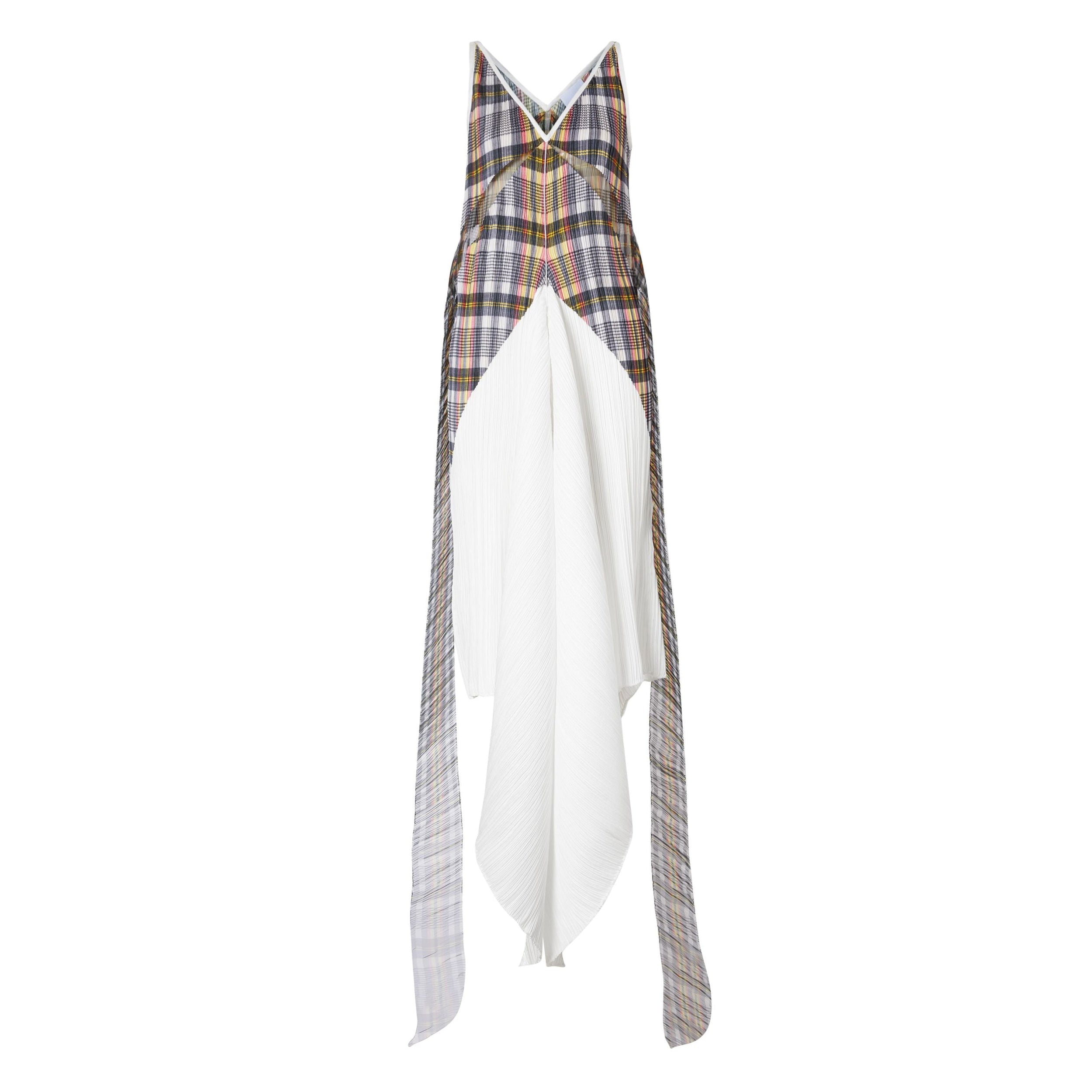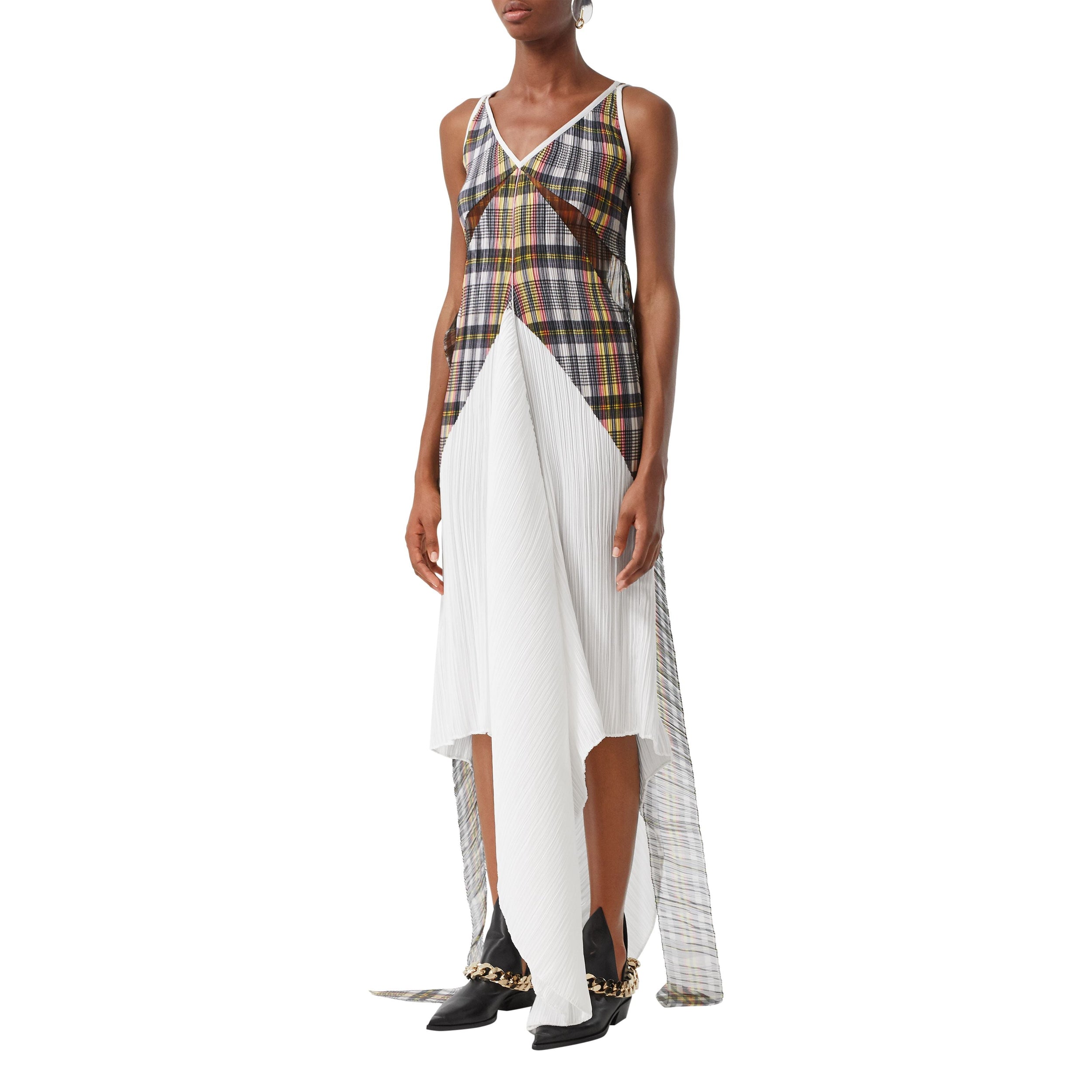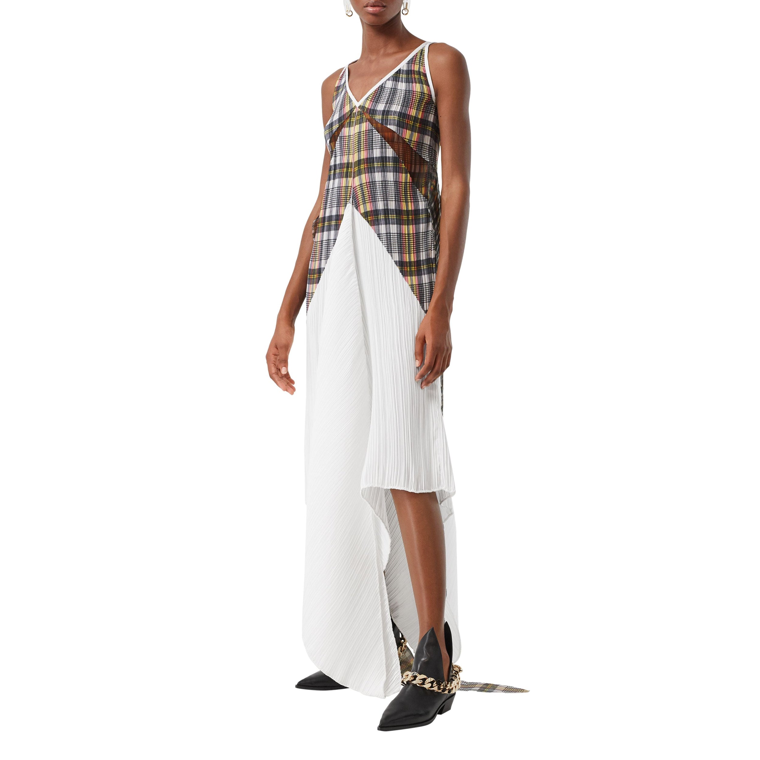 Robe plissée ultralongue en satin léger, agrémentée d'un corsage à motif check et de liens en organza surdimensionnés.