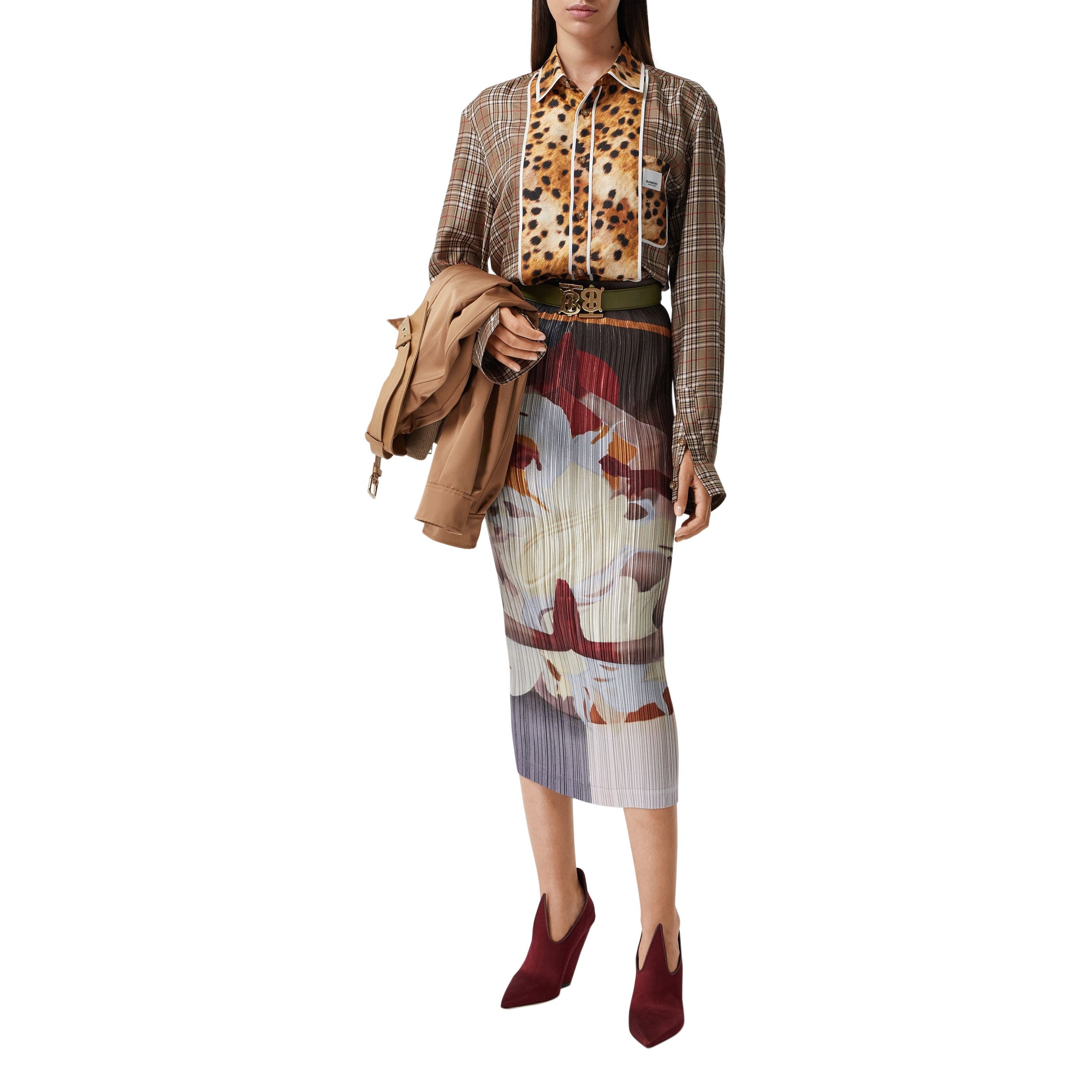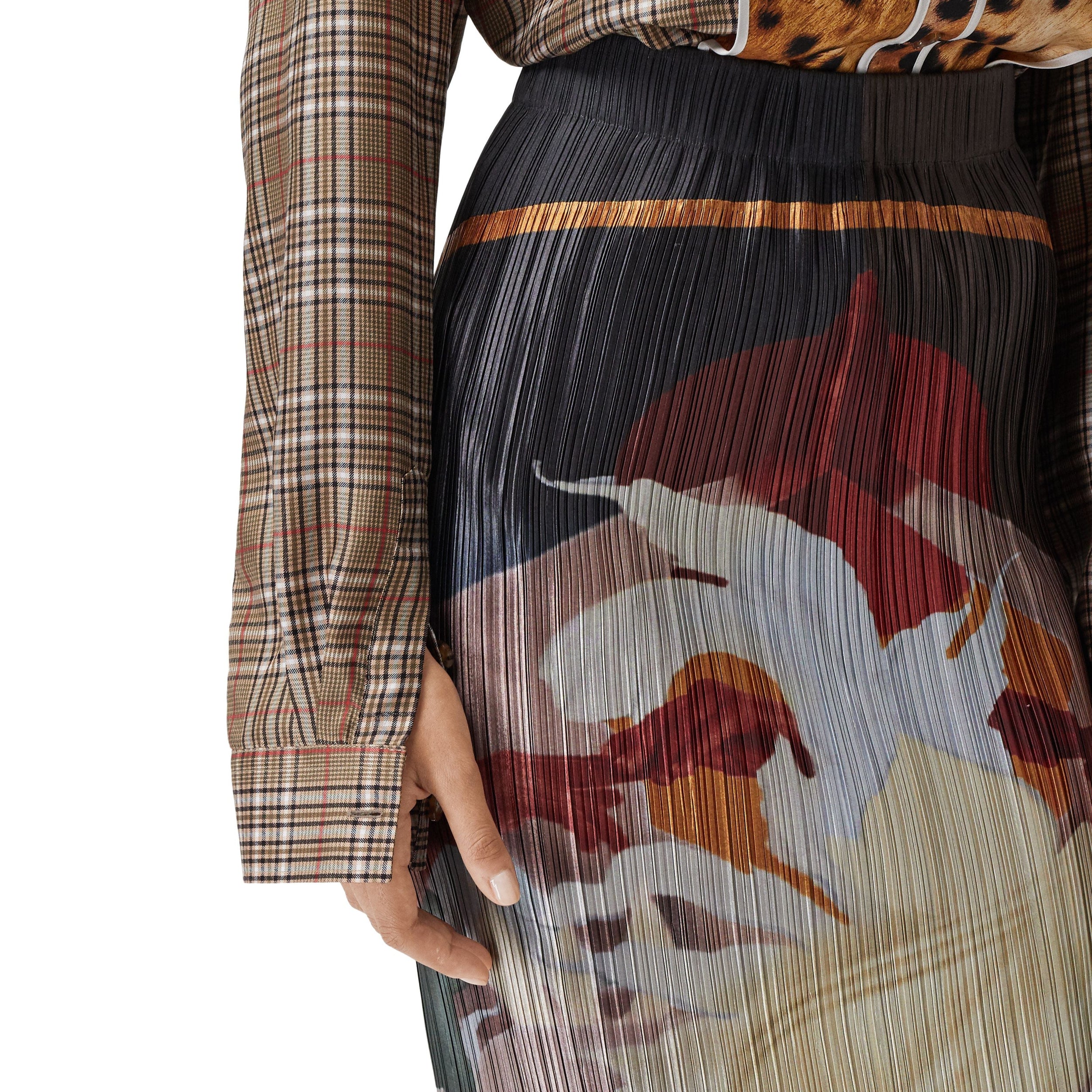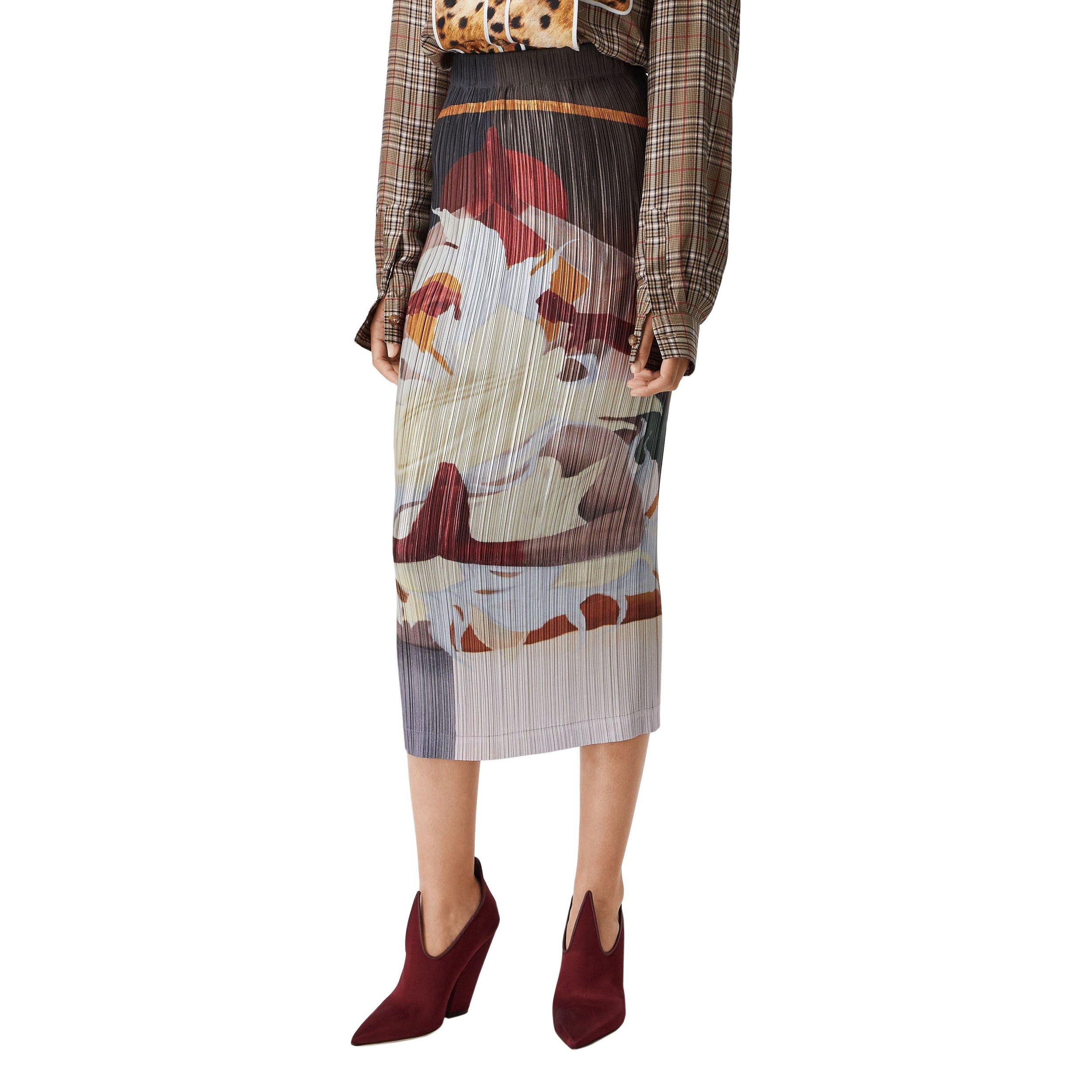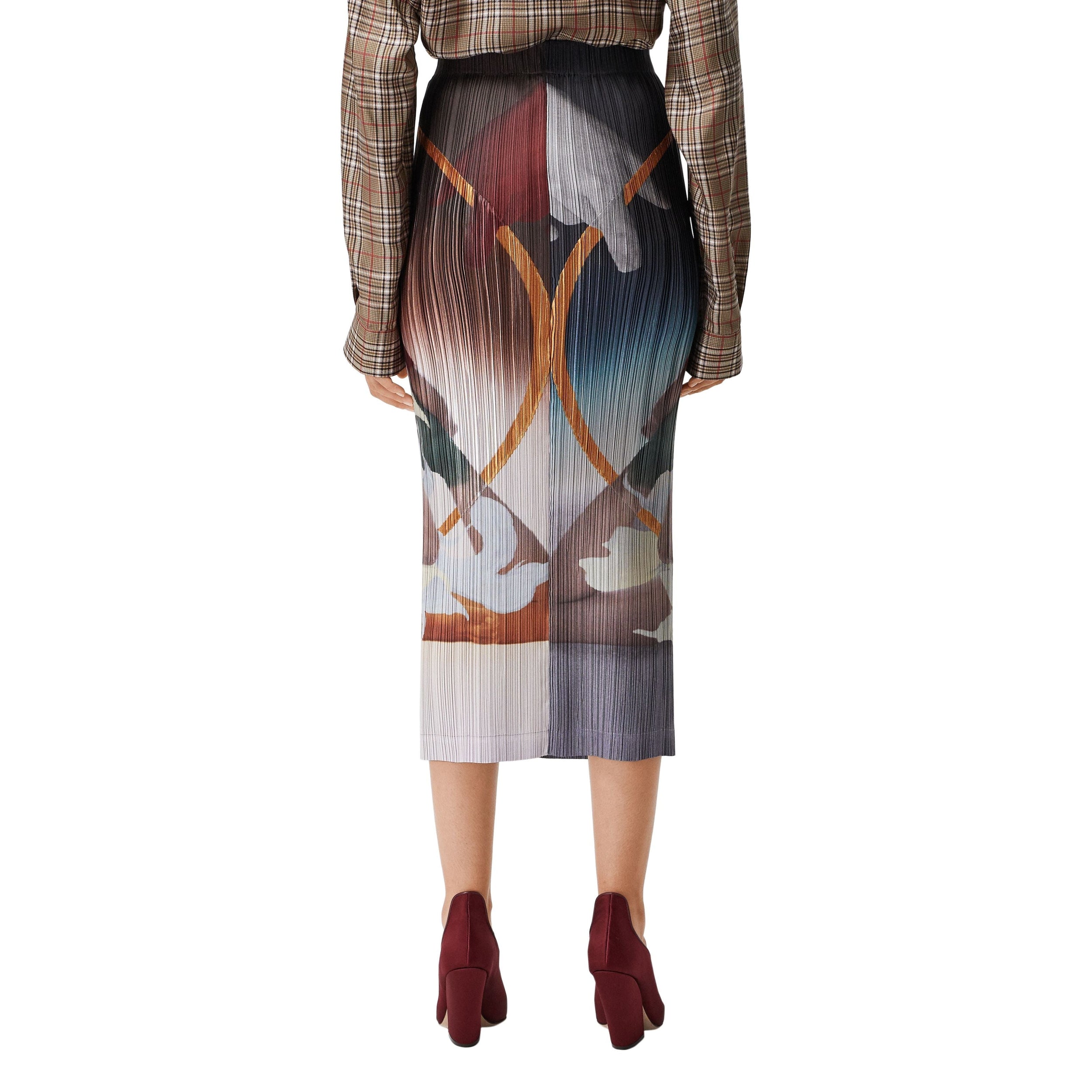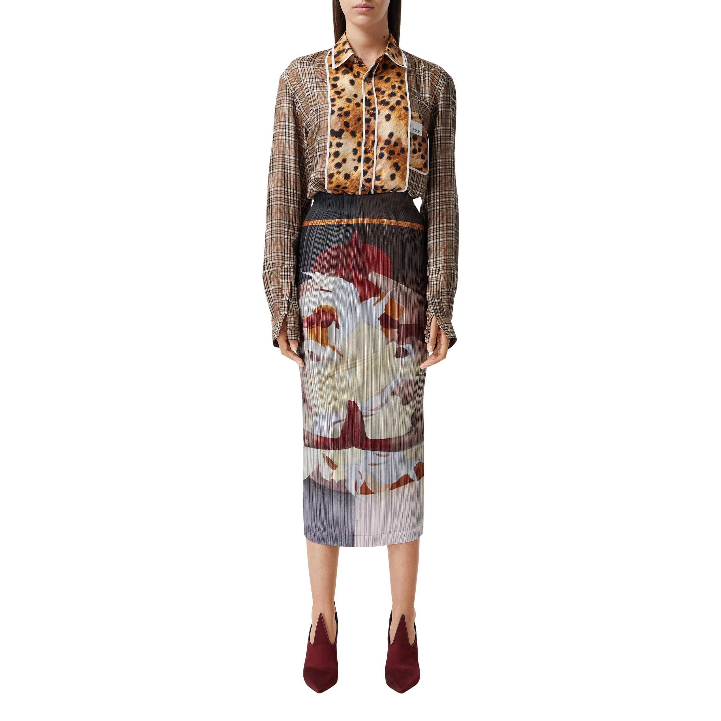 Cette jupe plissée en satin arbore un imprimé zen aux nuances intenses. La pièce a été créée dans nos ateliers de Londres.