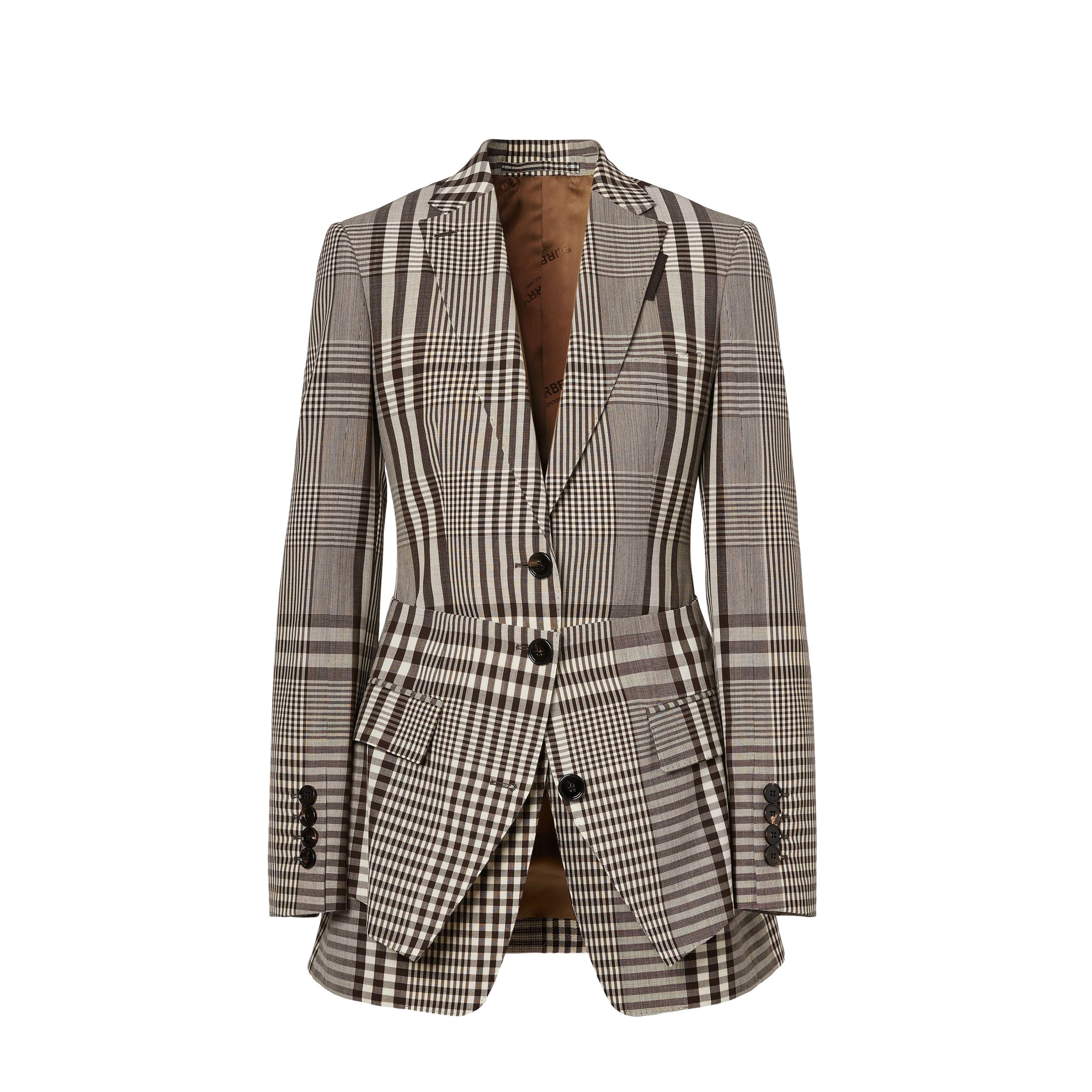 Cette veste tailleur en laine technique à motif check est confectionnée en Italie. La pièce est agrémentée d'une basque assortie.