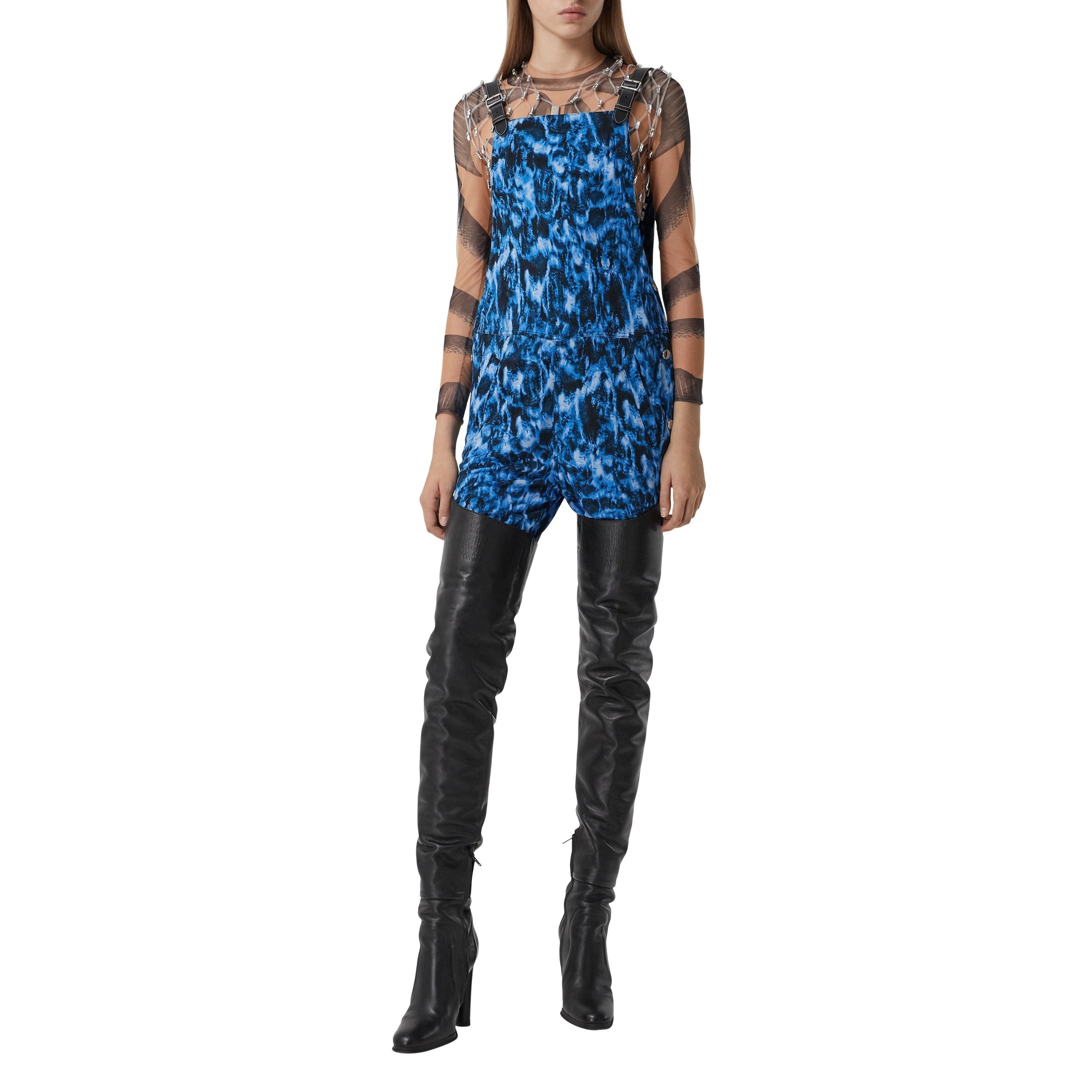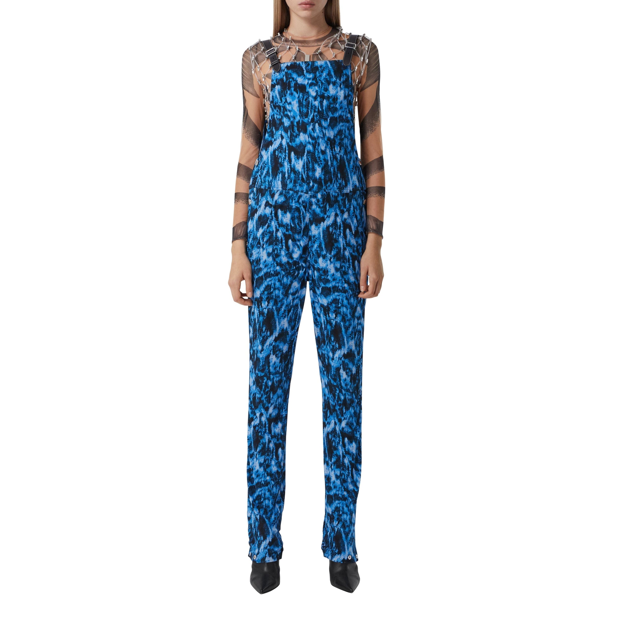 Cette salopette en jersey inspirée des vêtements de marin est sublimée de notre imprimé vaguelette. La pièce est dotée de bretelles en cuir surpiqué et de sous-pieds.