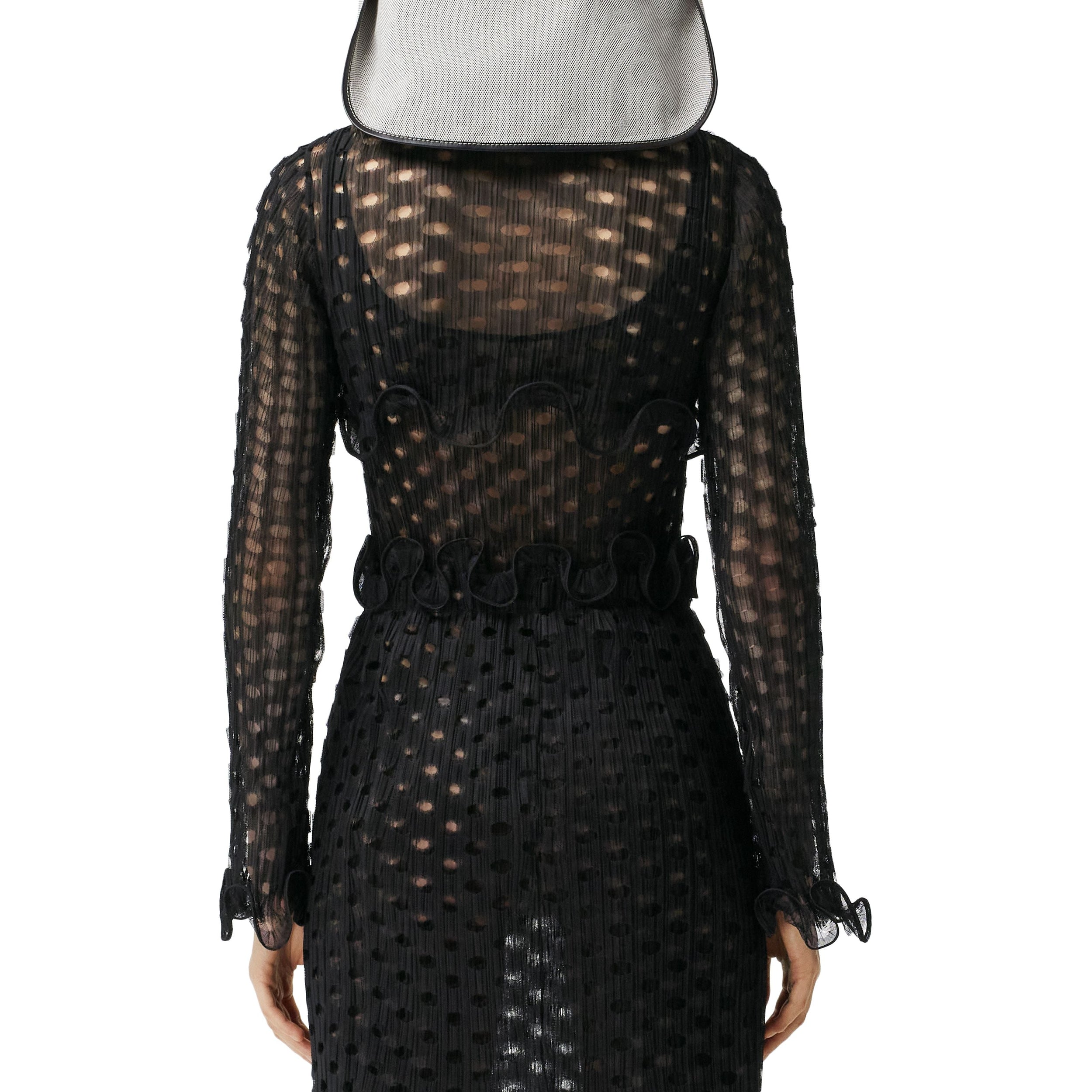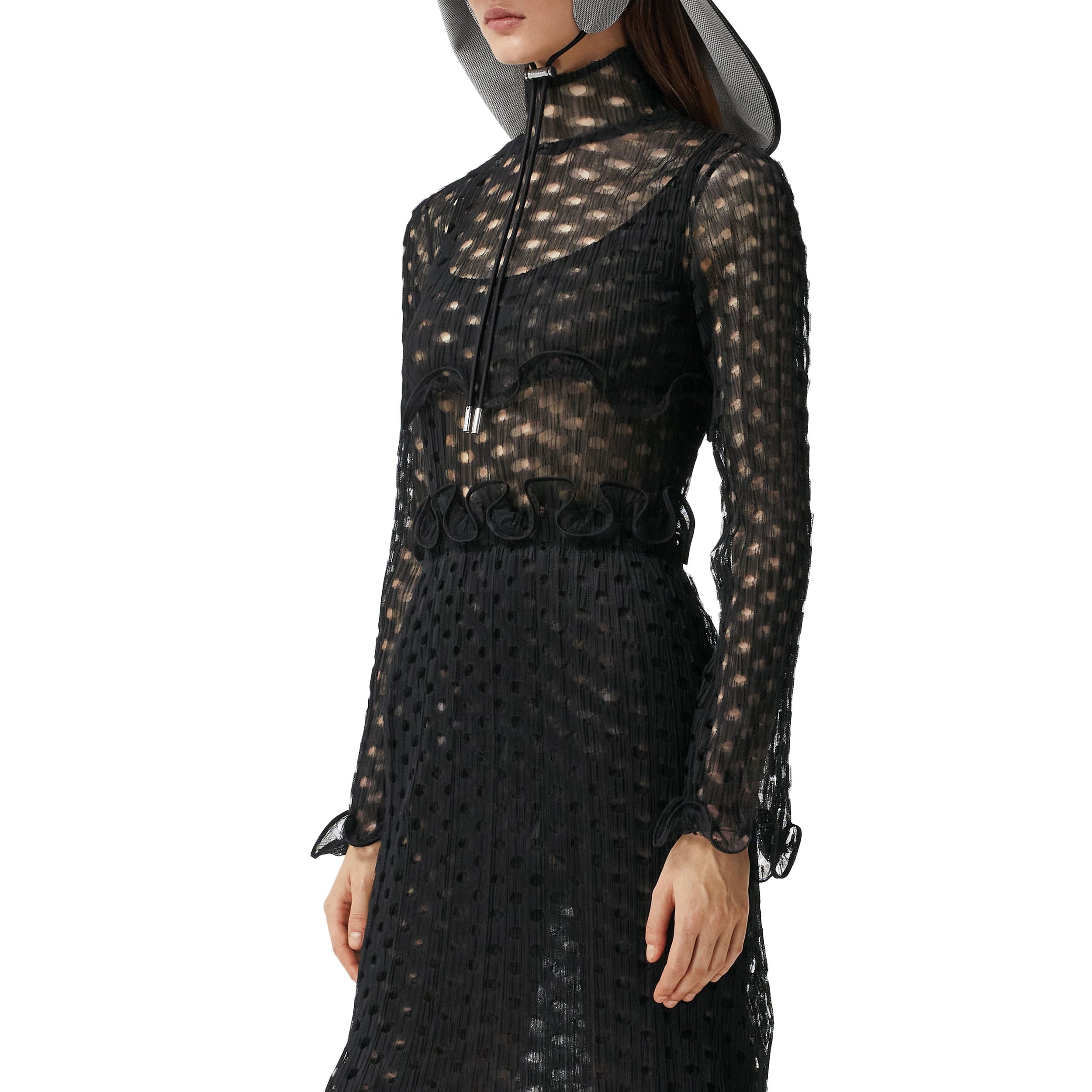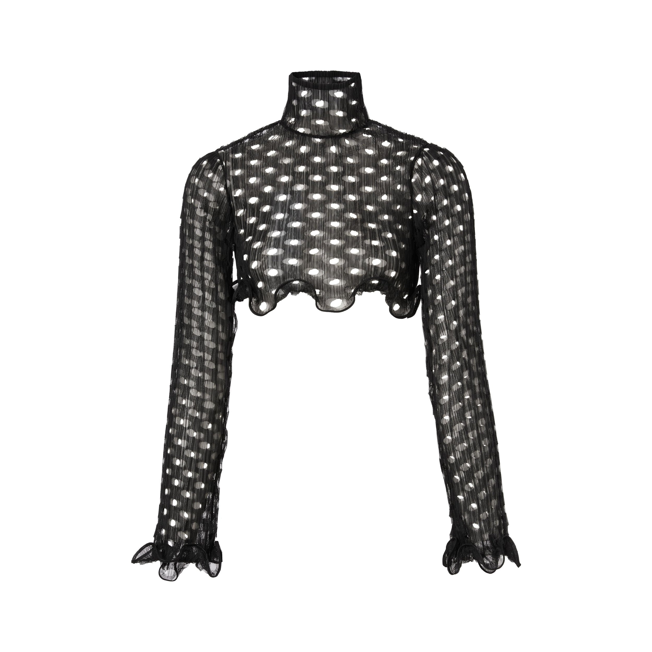 Ce haut court à col montant est confectionné en tulle découpé au laser et agrémenté de volants de crinoline.