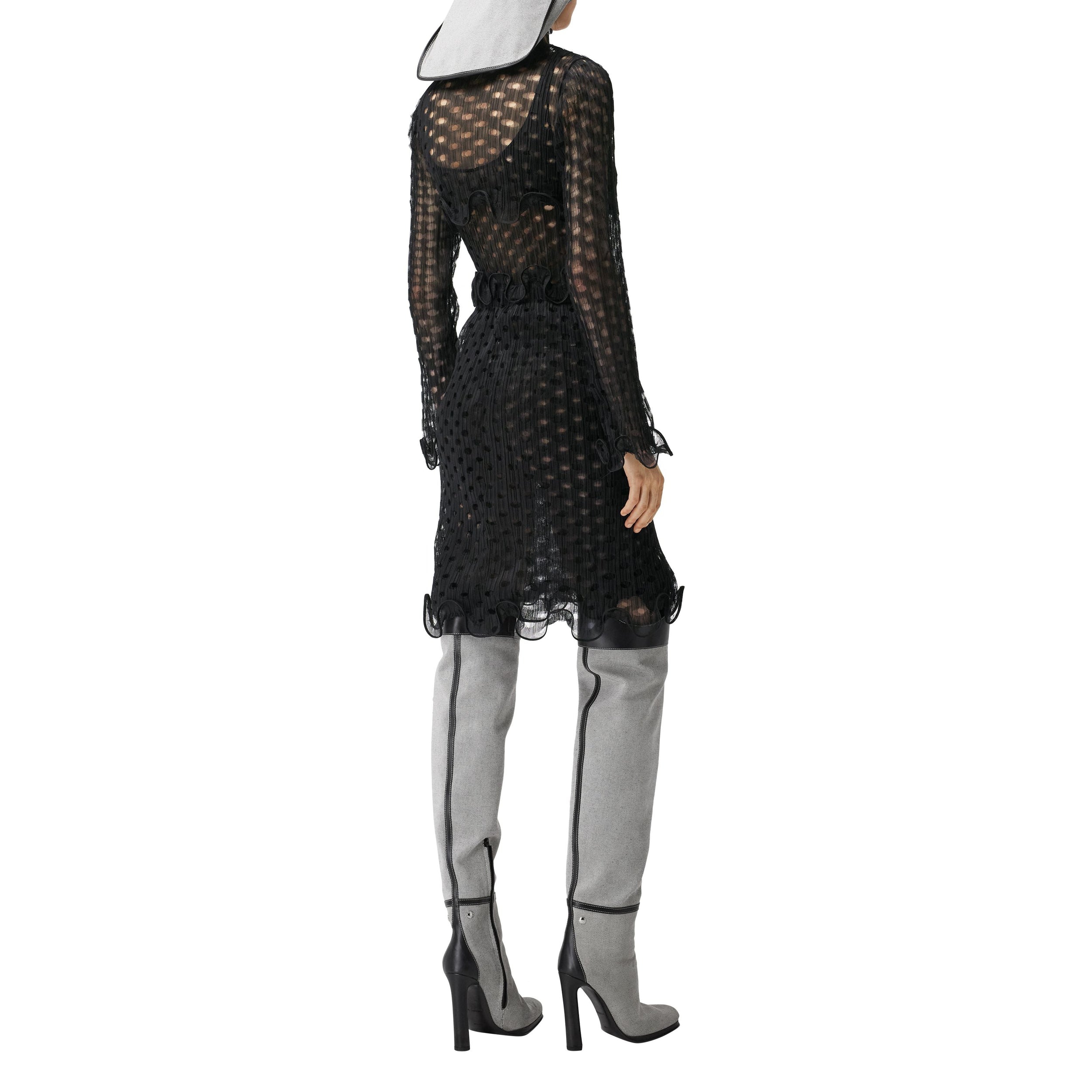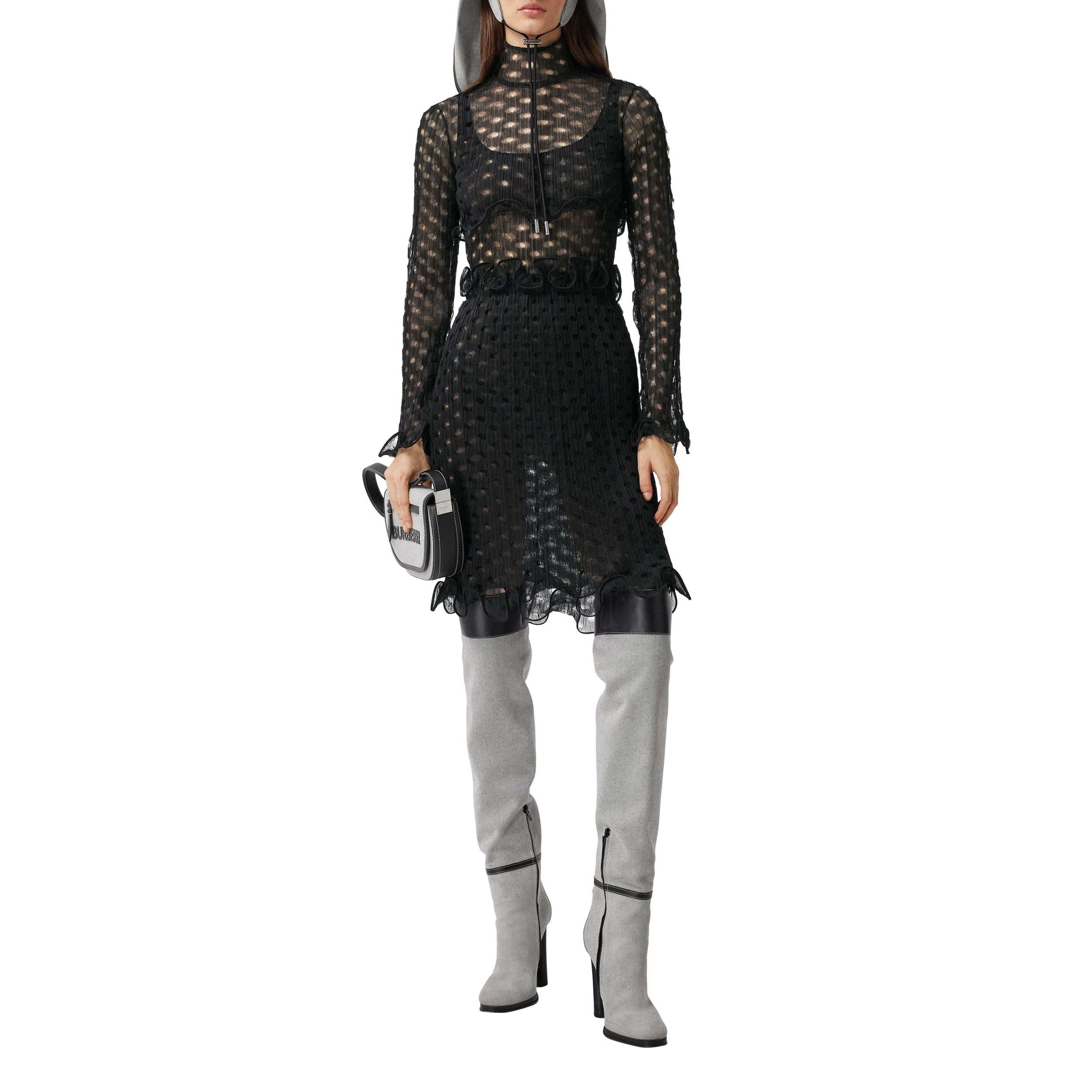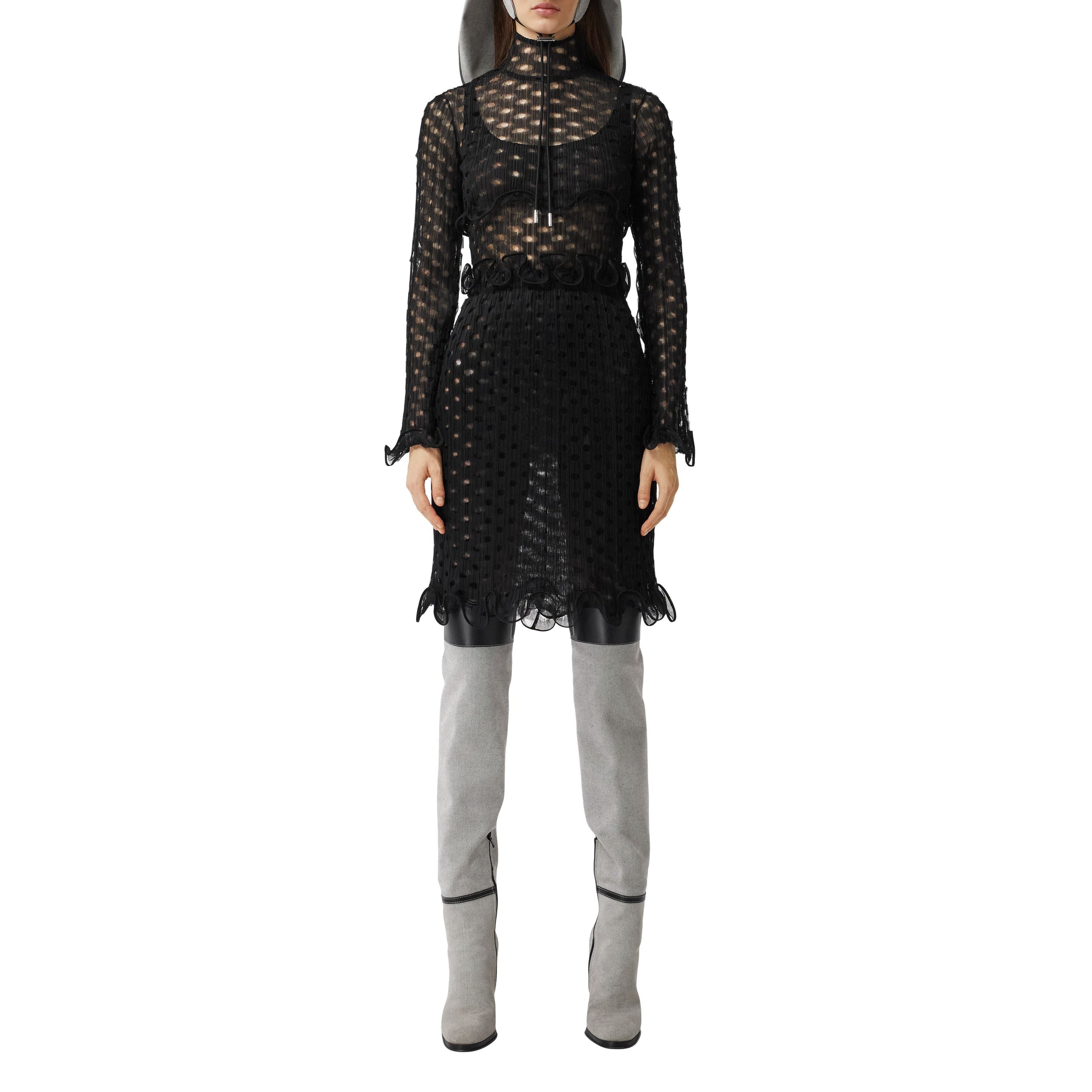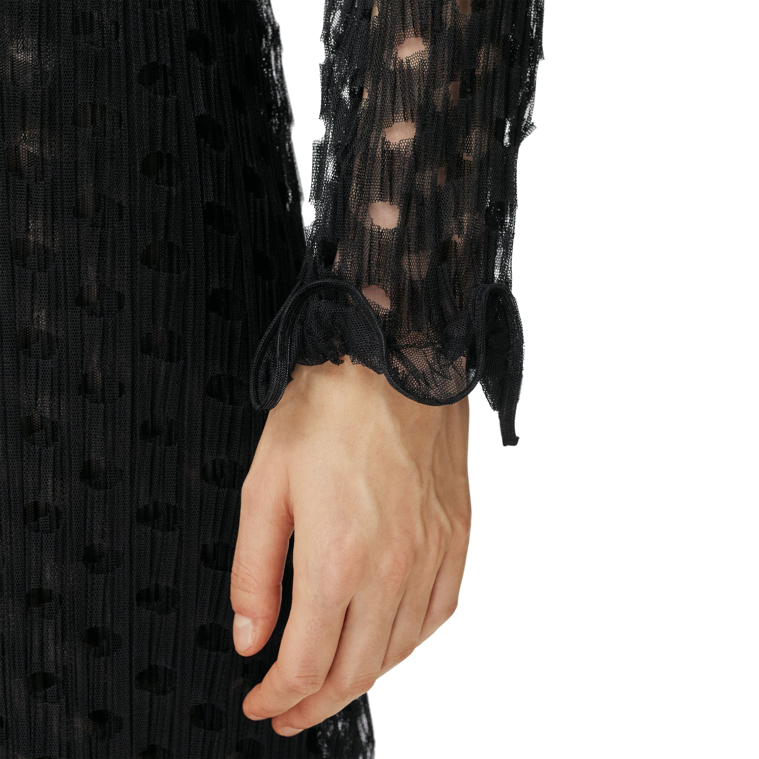 Ce haut court à col montant est confectionné en tulle découpé au laser et agrémenté de volants de crinoline.
