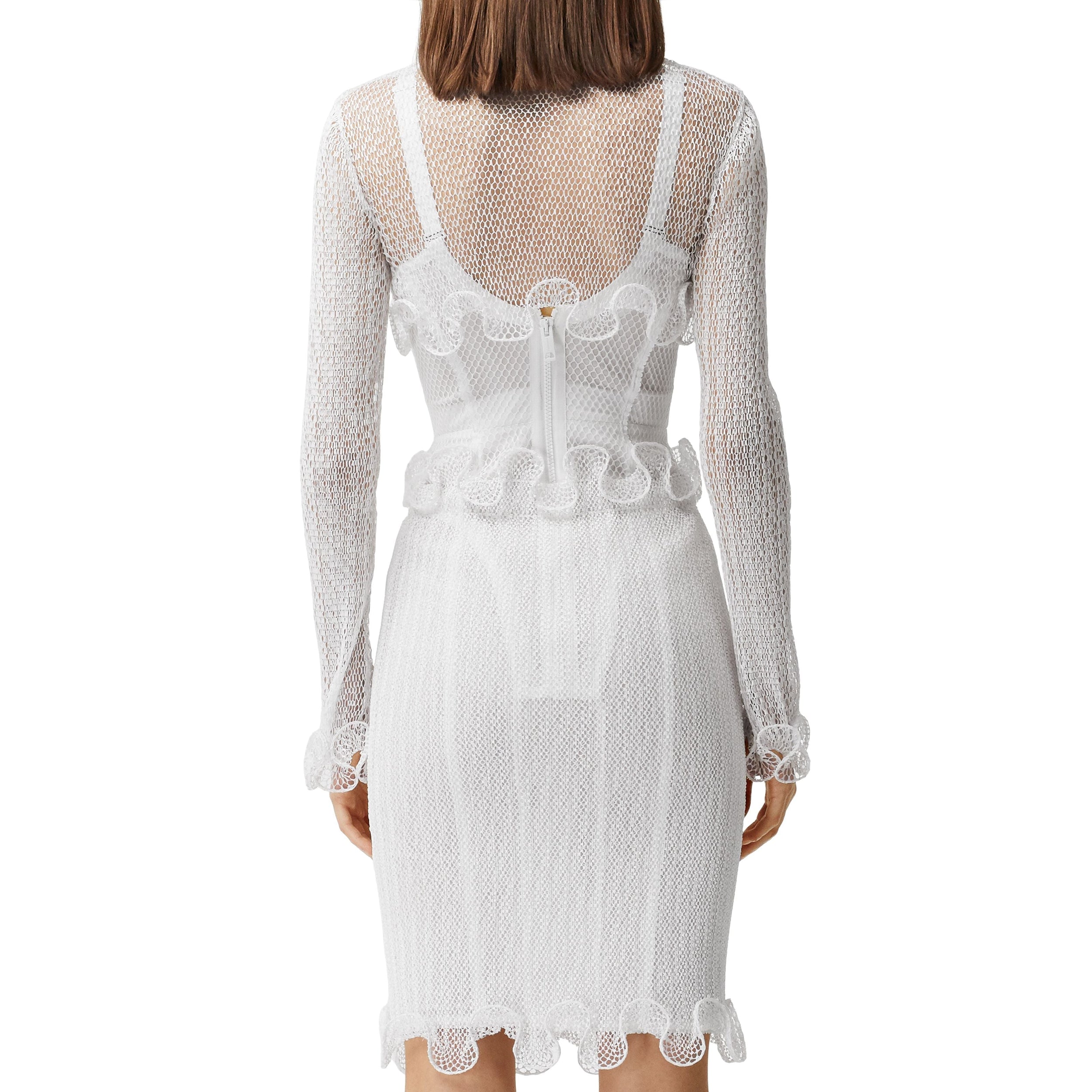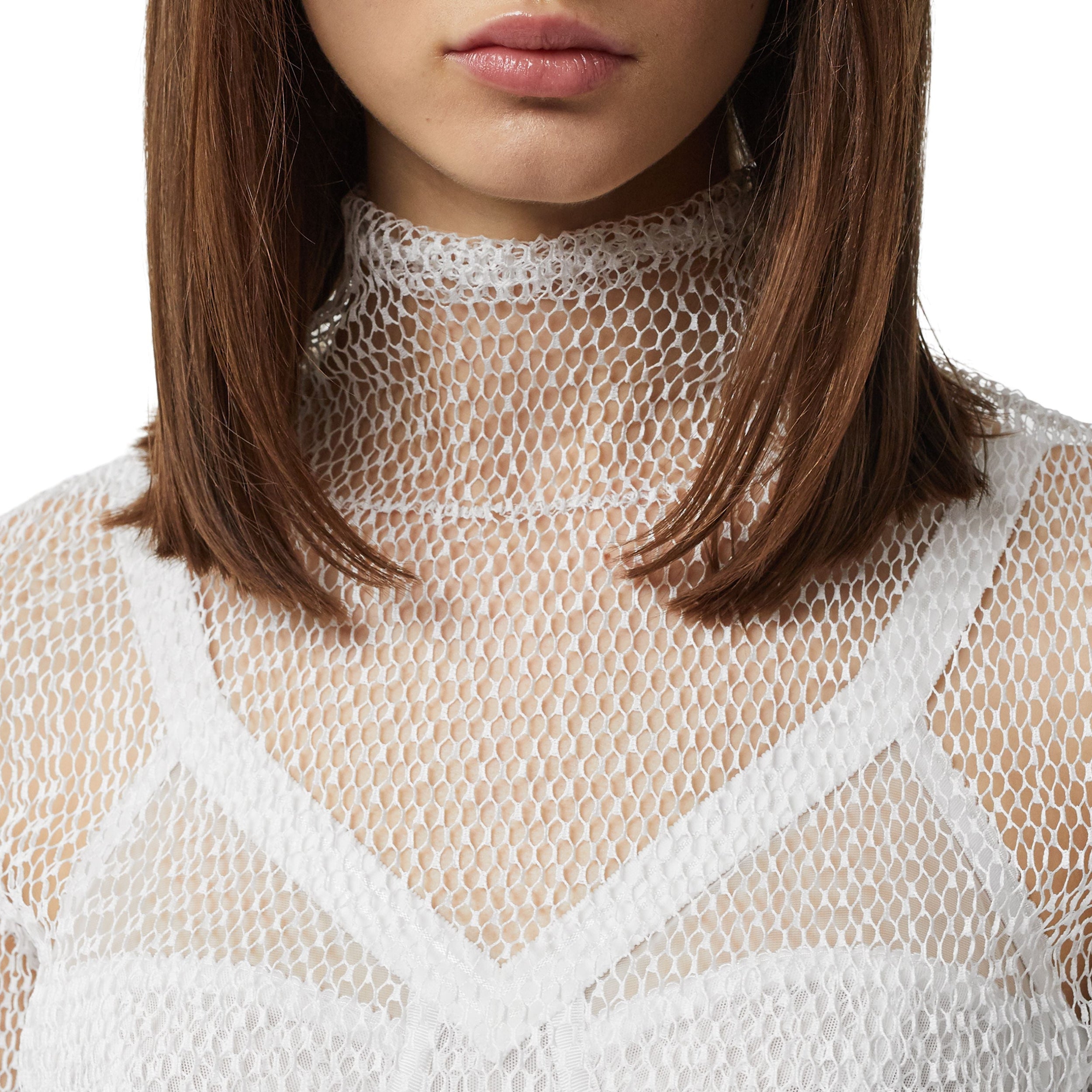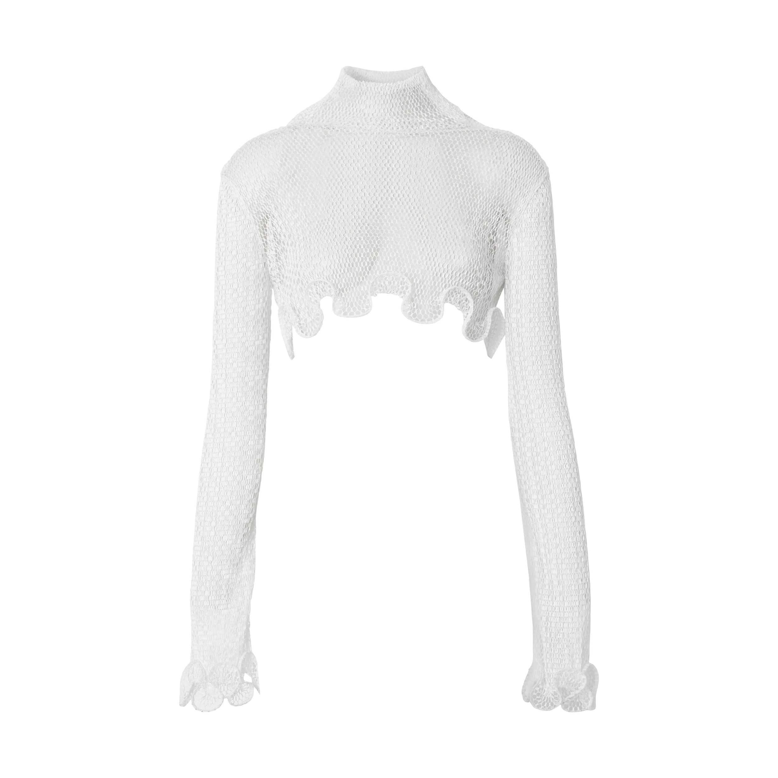 Ce haut court à col montant est confectionné en résille et arbore une coupe près du corps ainsi que des volants au niveau des manches et de la base.