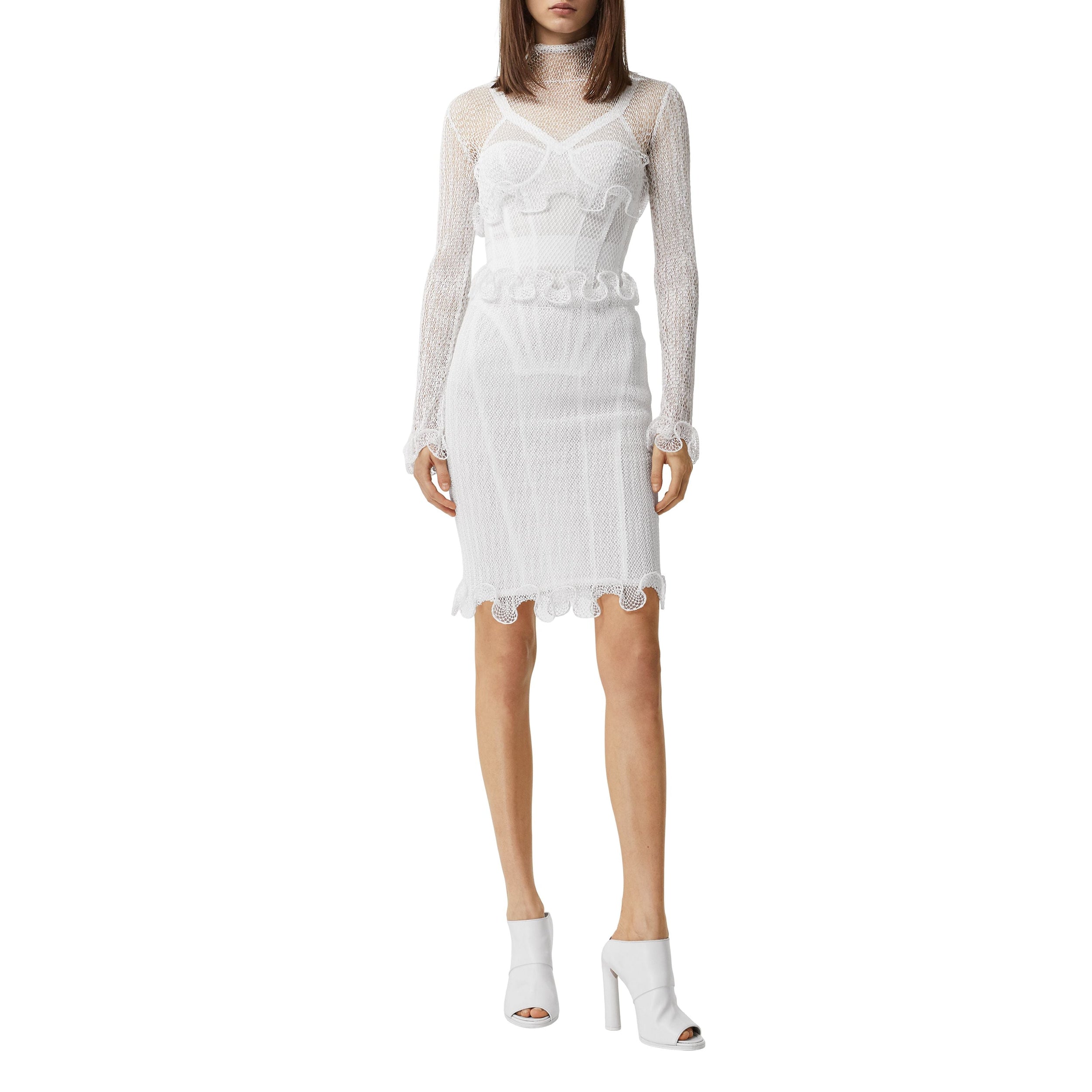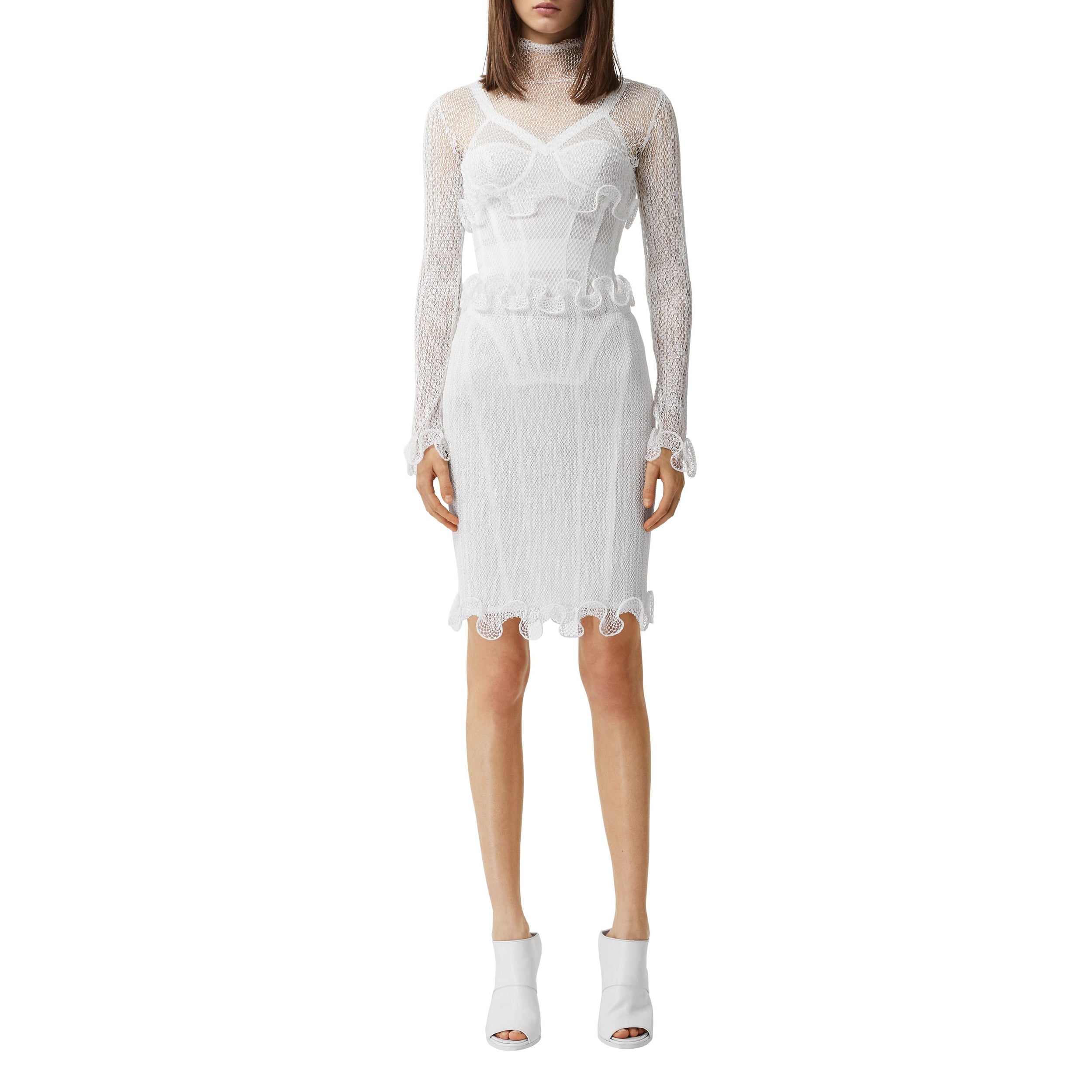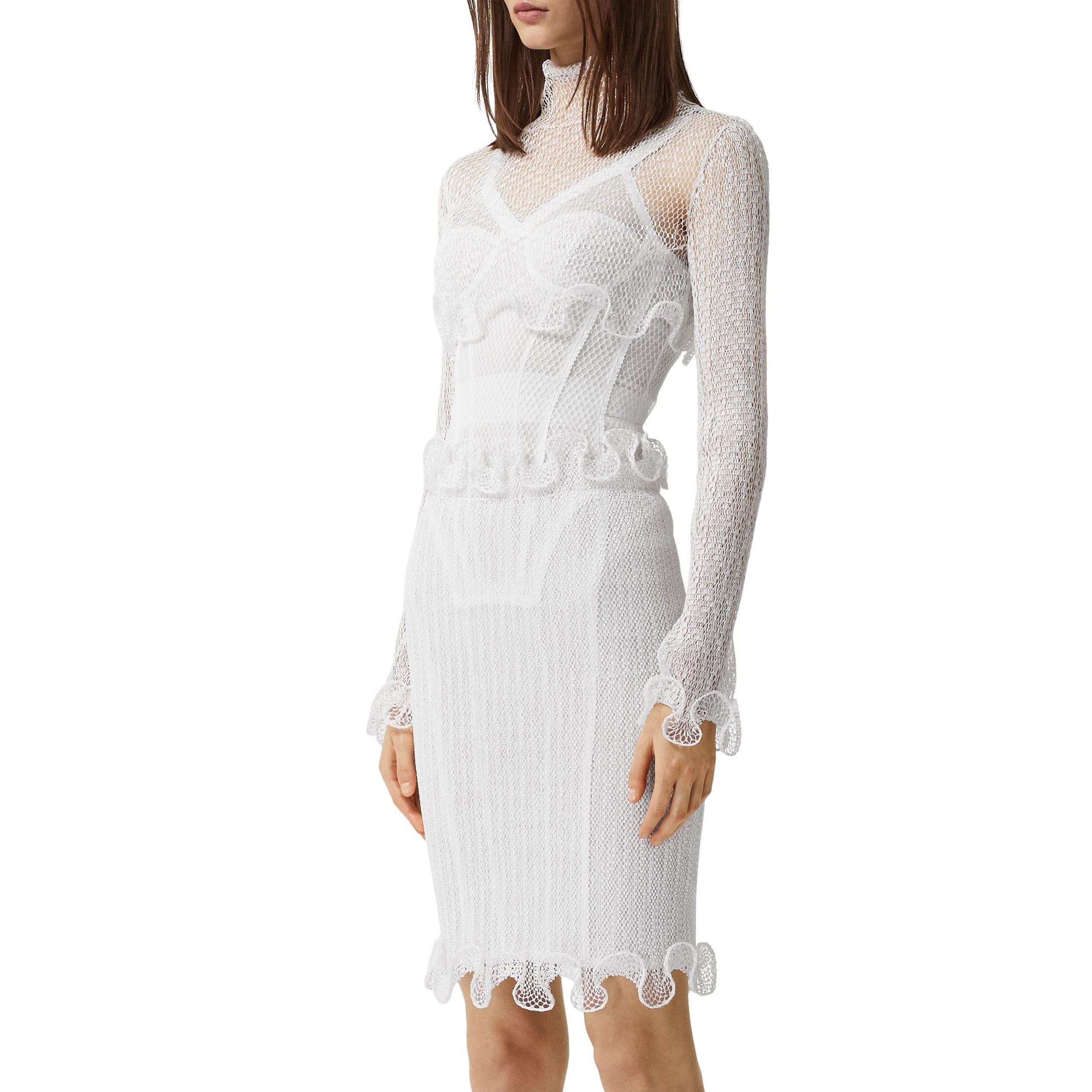 Ce haut court à col montant est confectionné en résille et arbore une coupe près du corps ainsi que des volants au niveau des manches et de la base.