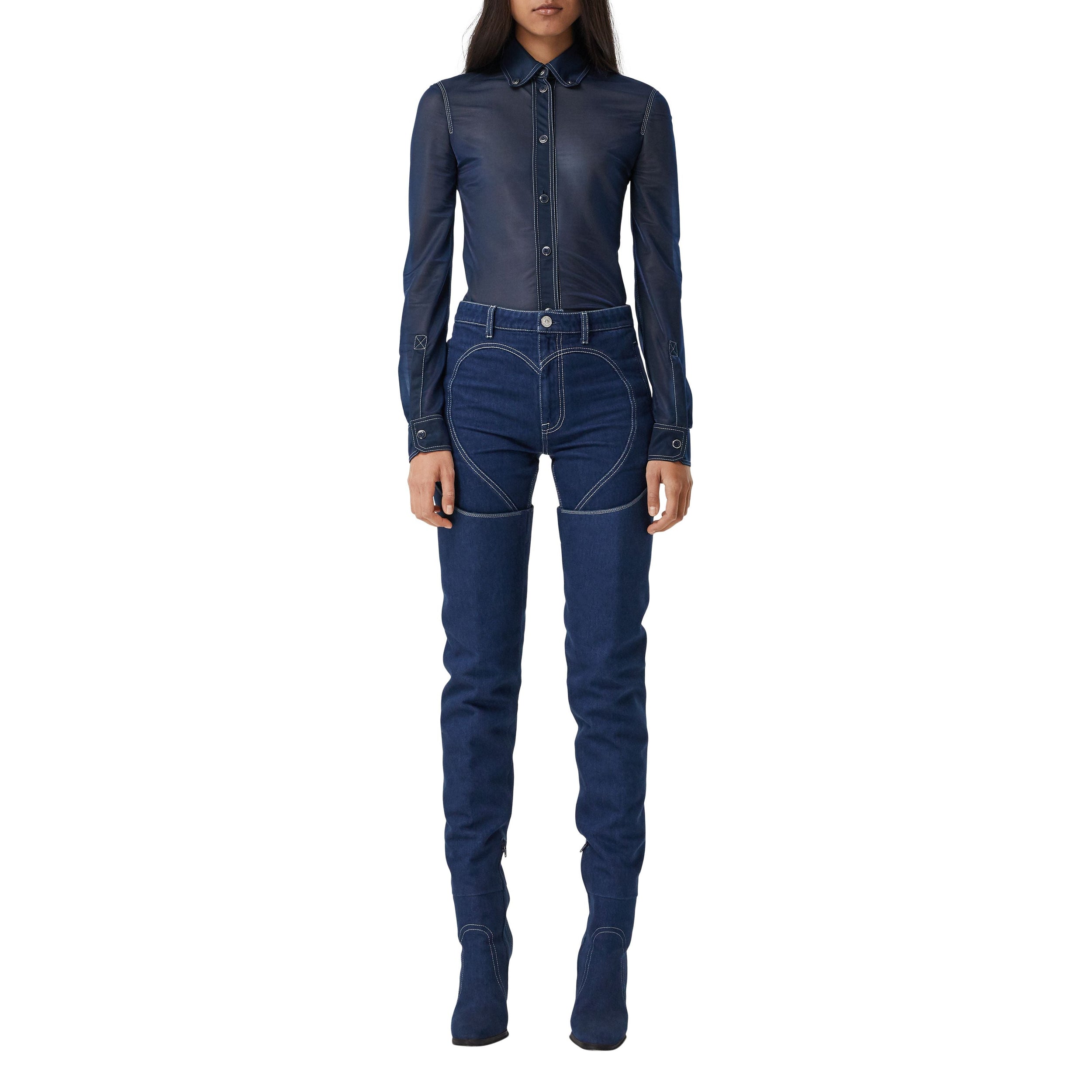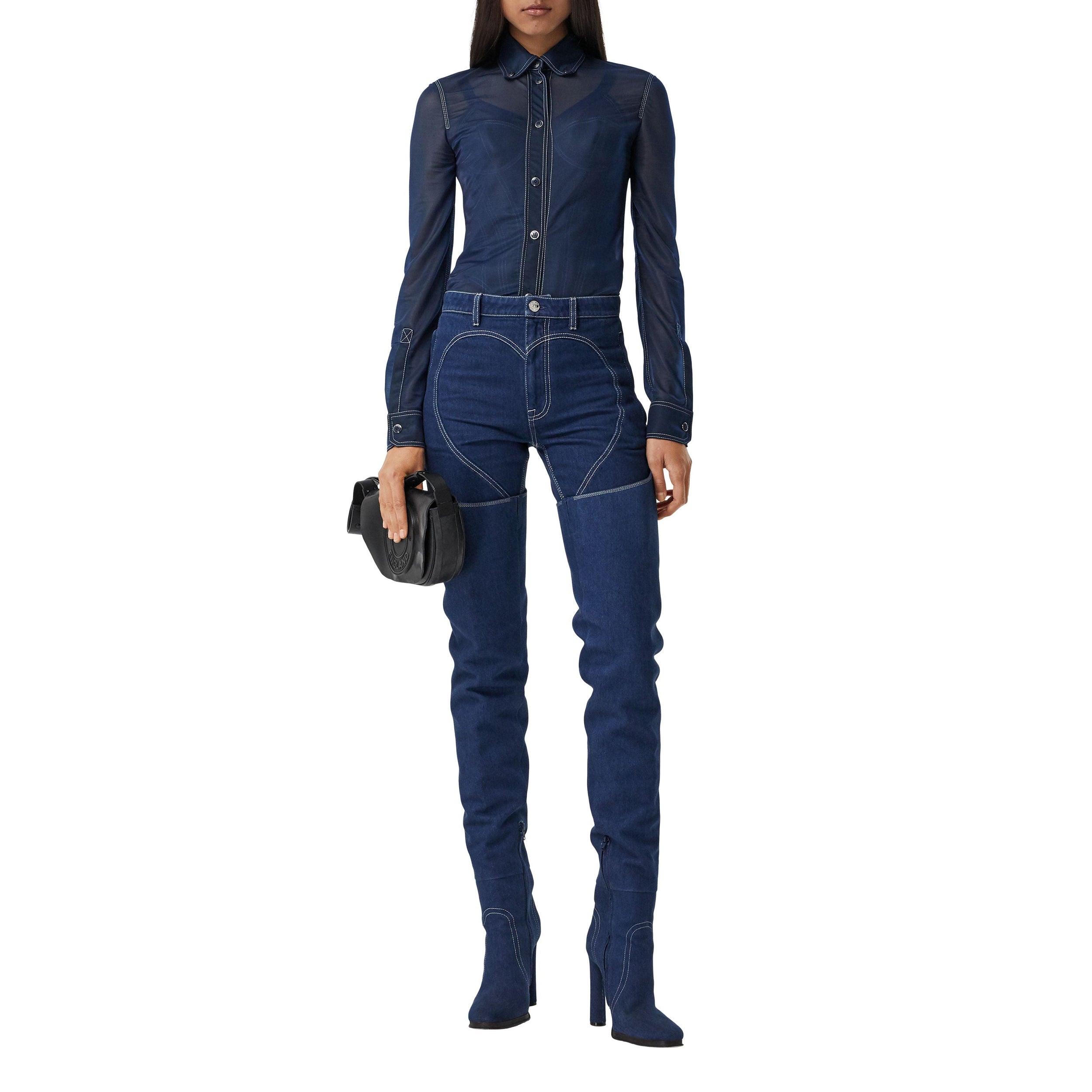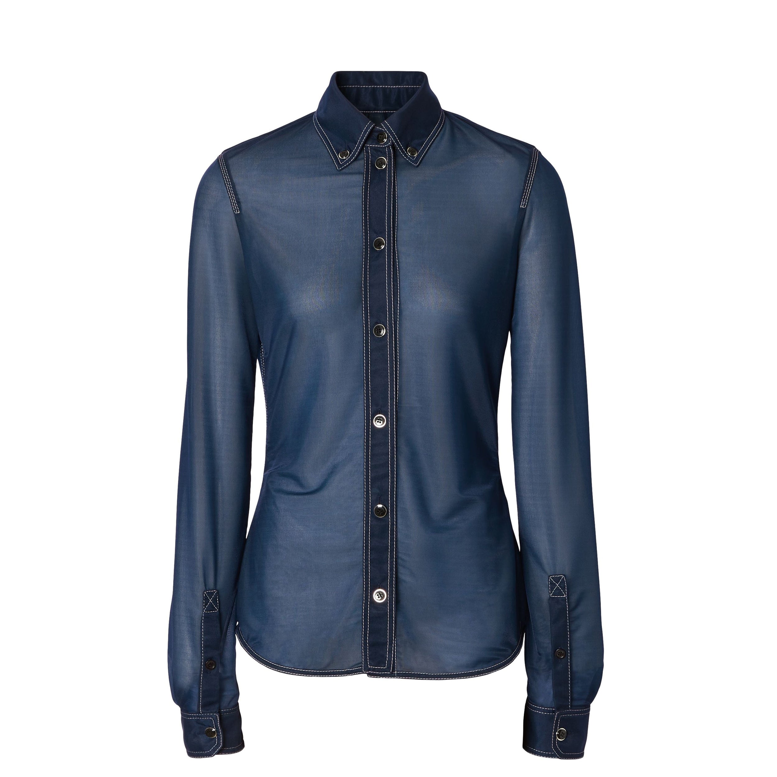 Cette chemise ajustée confectionnée en jersey stretch diaphane est agrémentée d'un col boutonné et de surpiqûres de couleur différente.