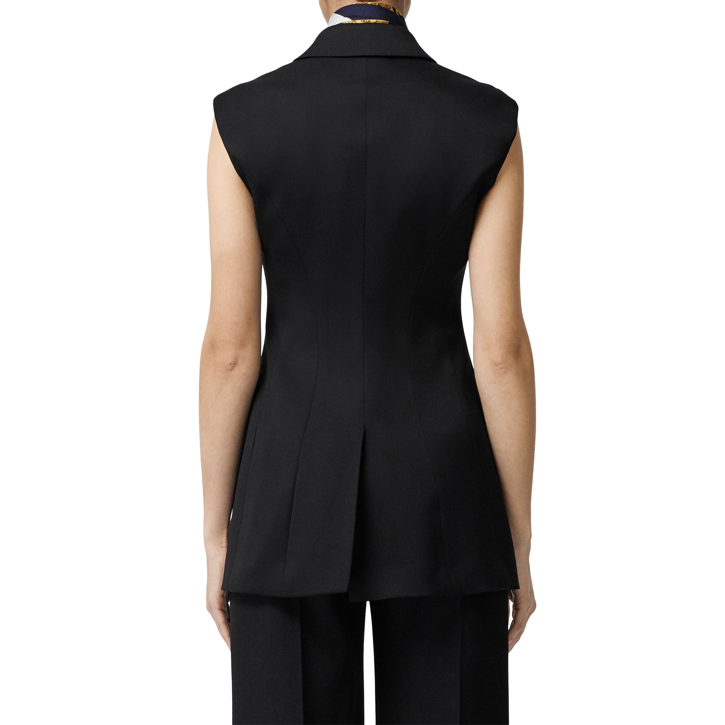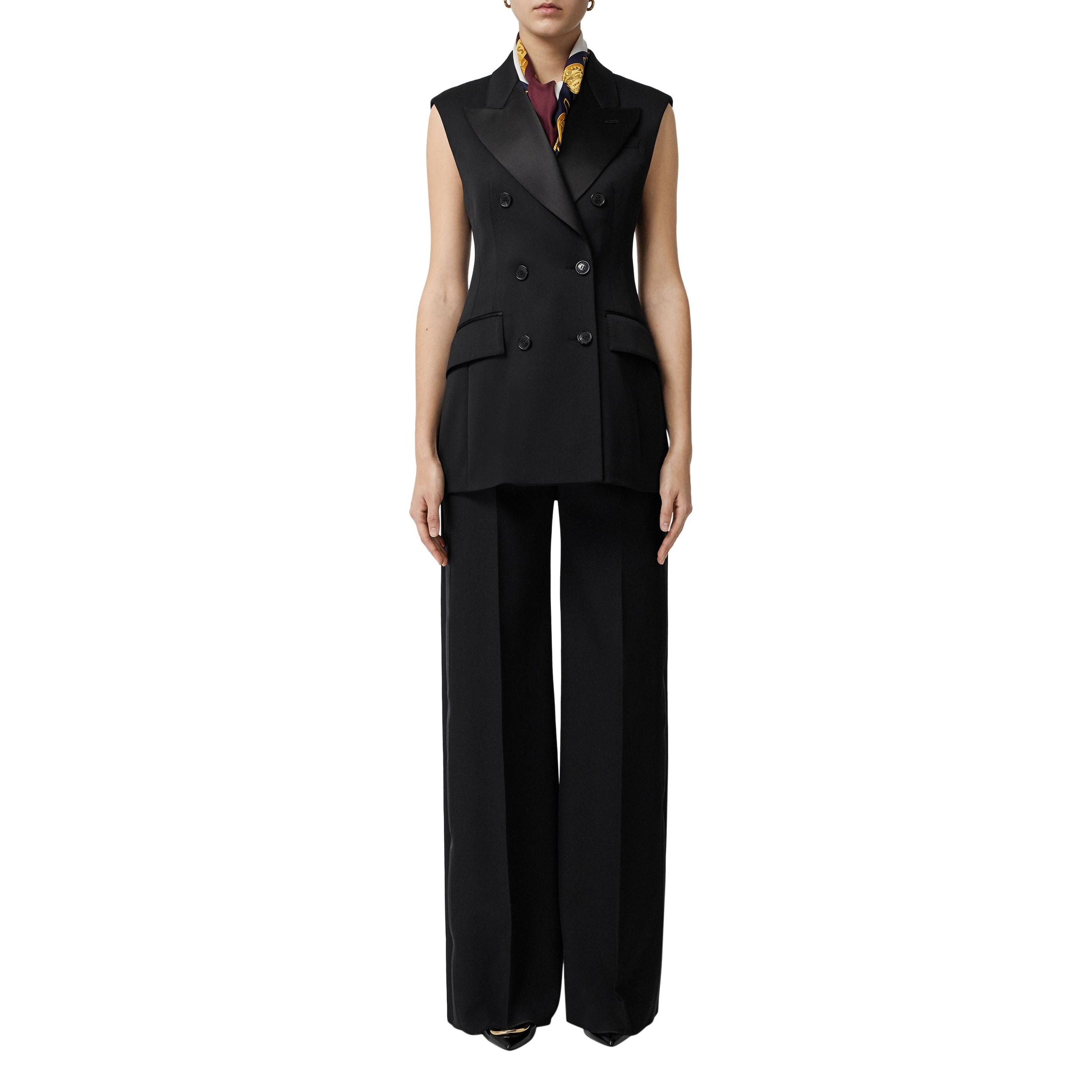 Cette veste cintrée sans manches en laine extensible est agrémentée de revers en pointe surdimensionnés recouverts de satin de soie.