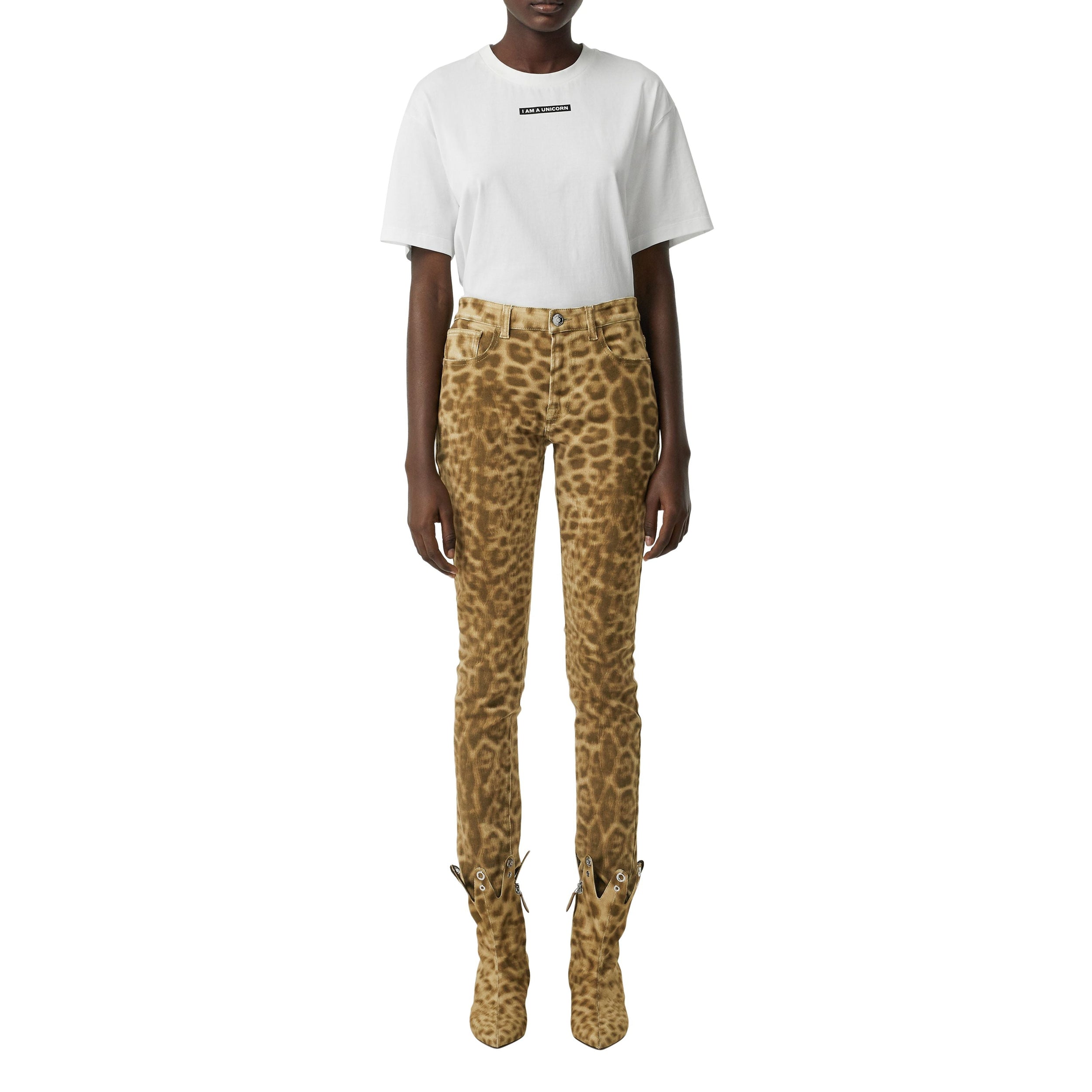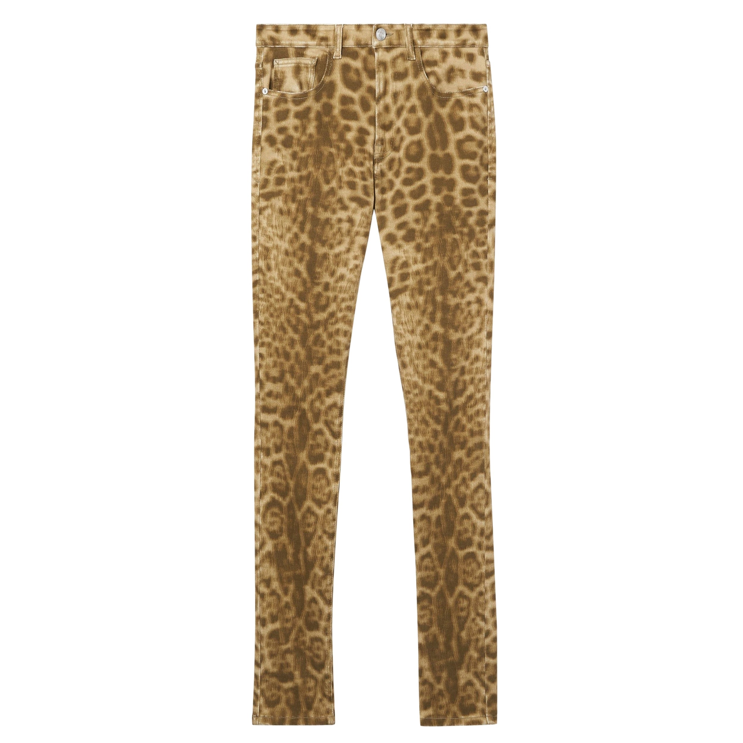 Jean droit en denim japonais tissé avec une pointe de stretch, agrémenté d'un imprimé léopard.