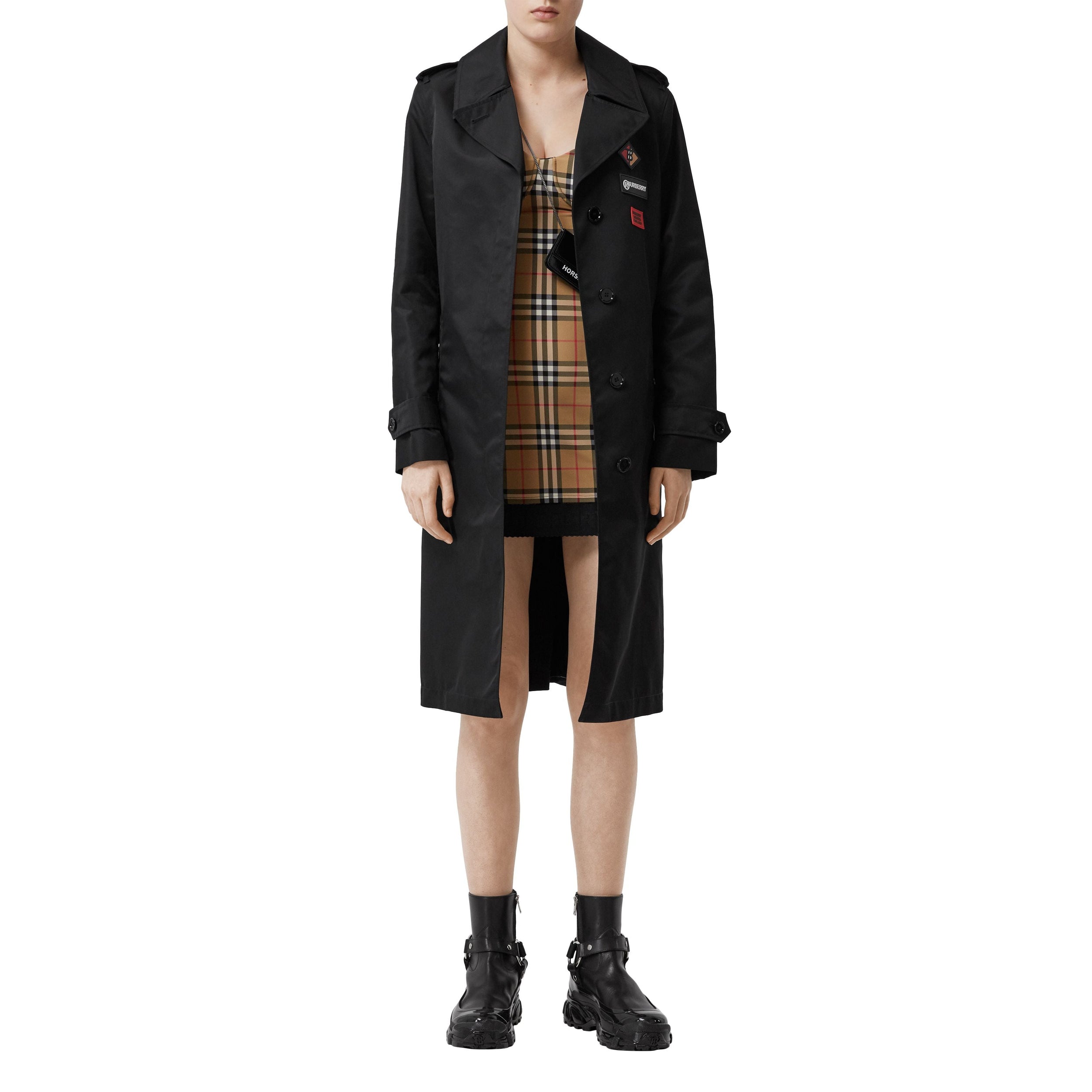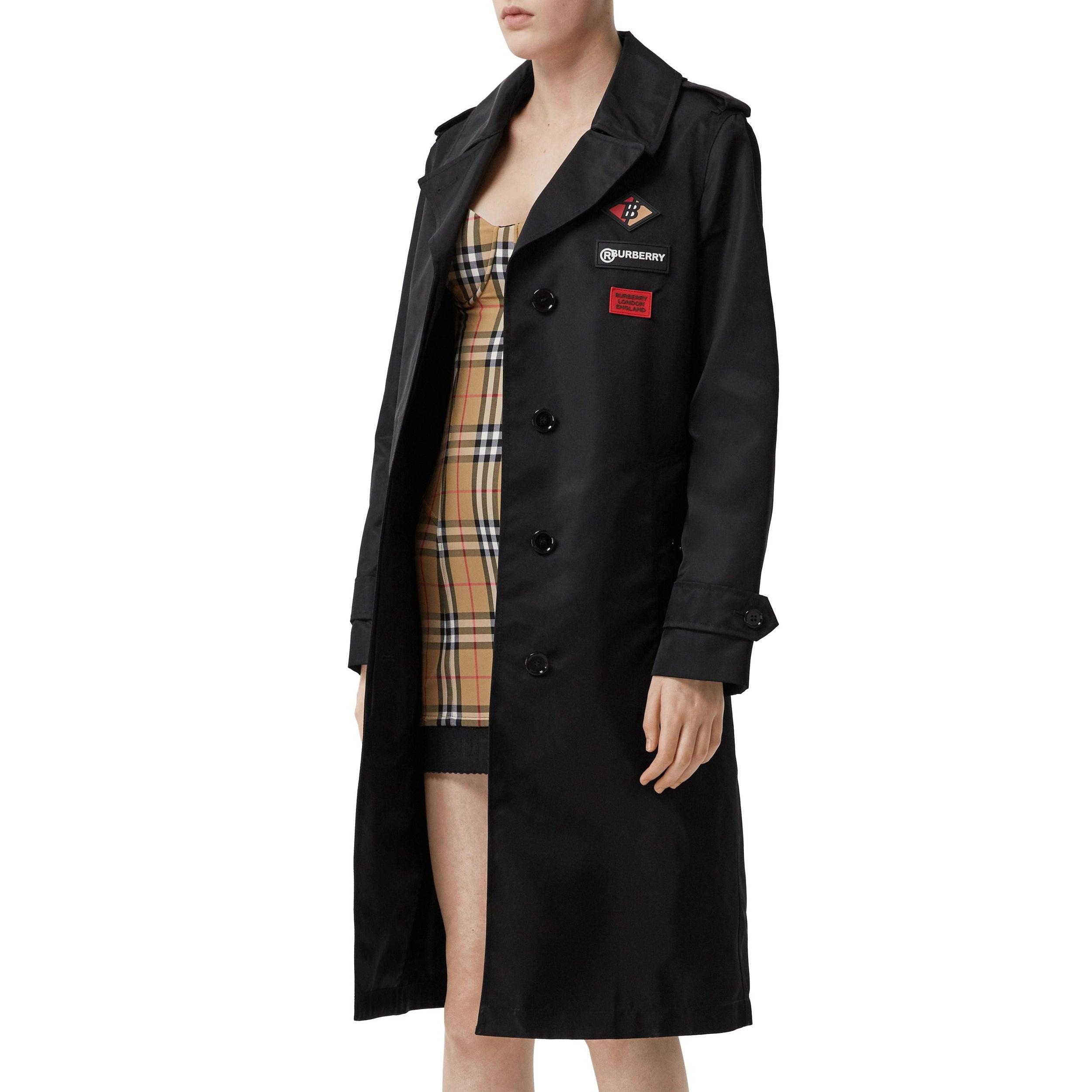 Ce Trench résistant aux intempéries est confectionné en sergé de nylon et agrémenté d'appliqués composés de logos du défilés. La silhouette épurée présente une longue fente au dos.