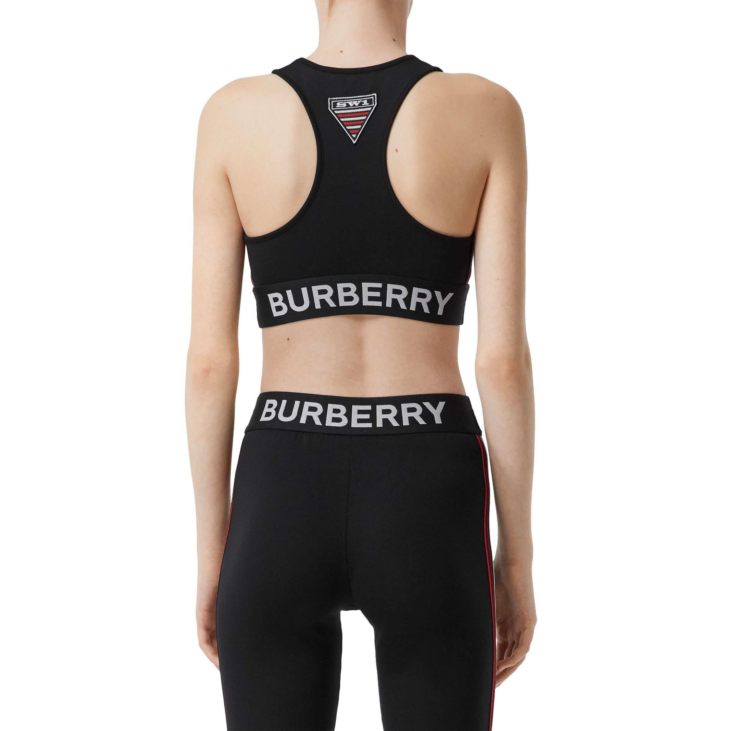 Brassière à dos nageur en jersey stretch, ponctuée de rayures et de logos appliqués inspirés de la culture britannique des années 1990.