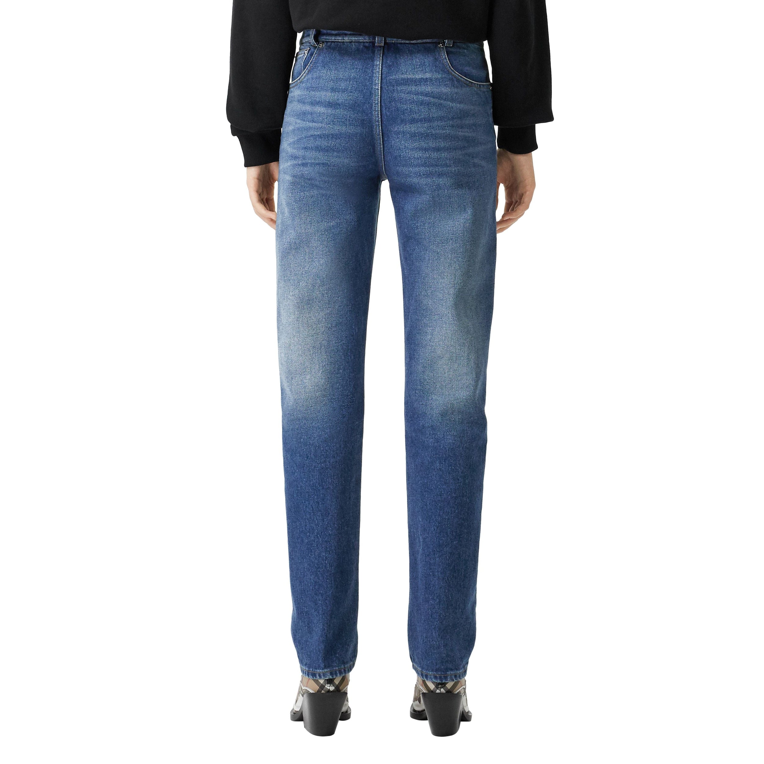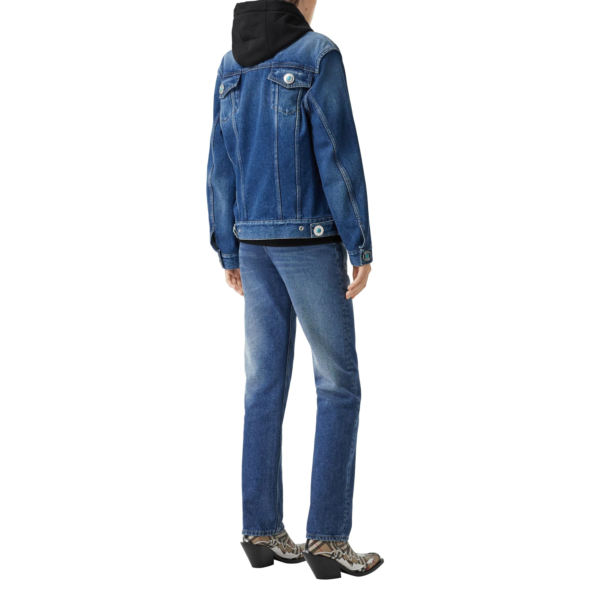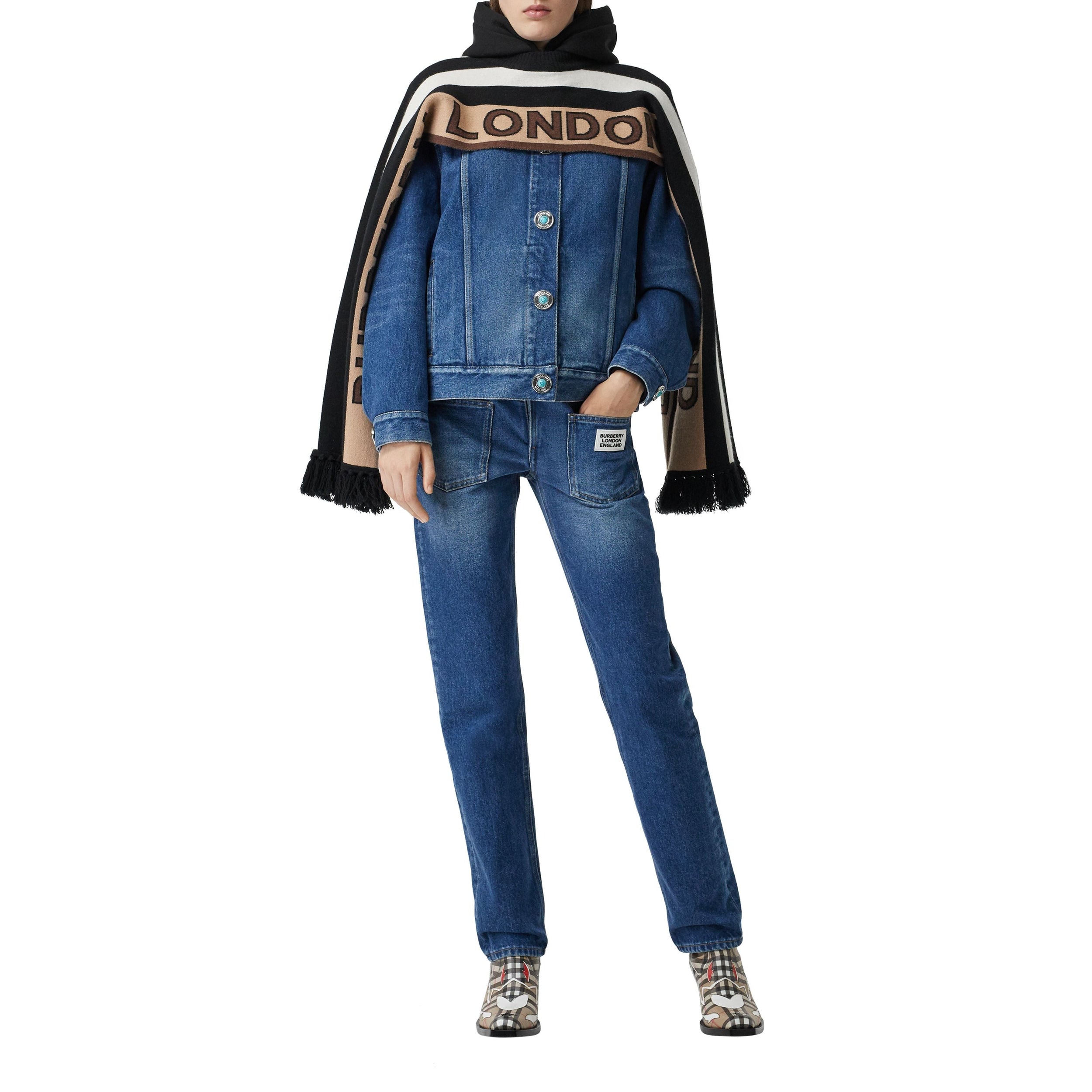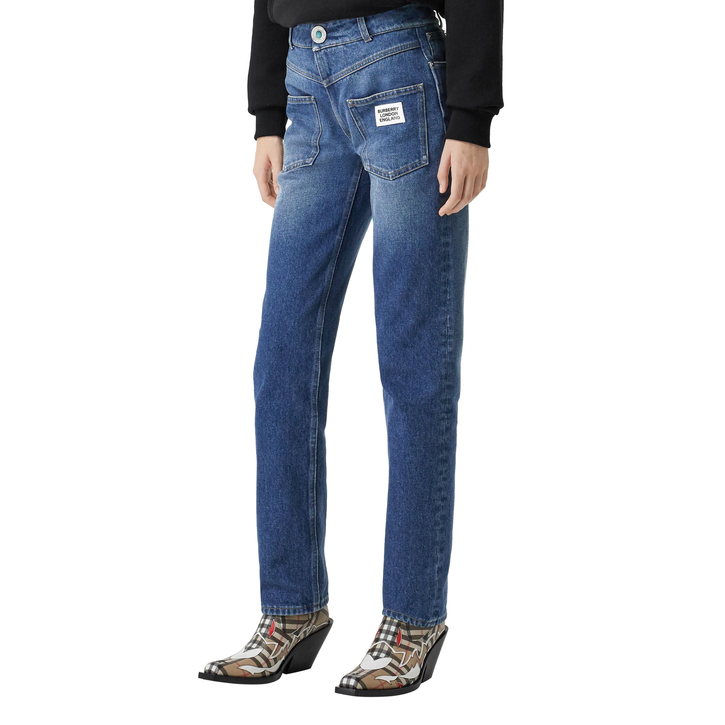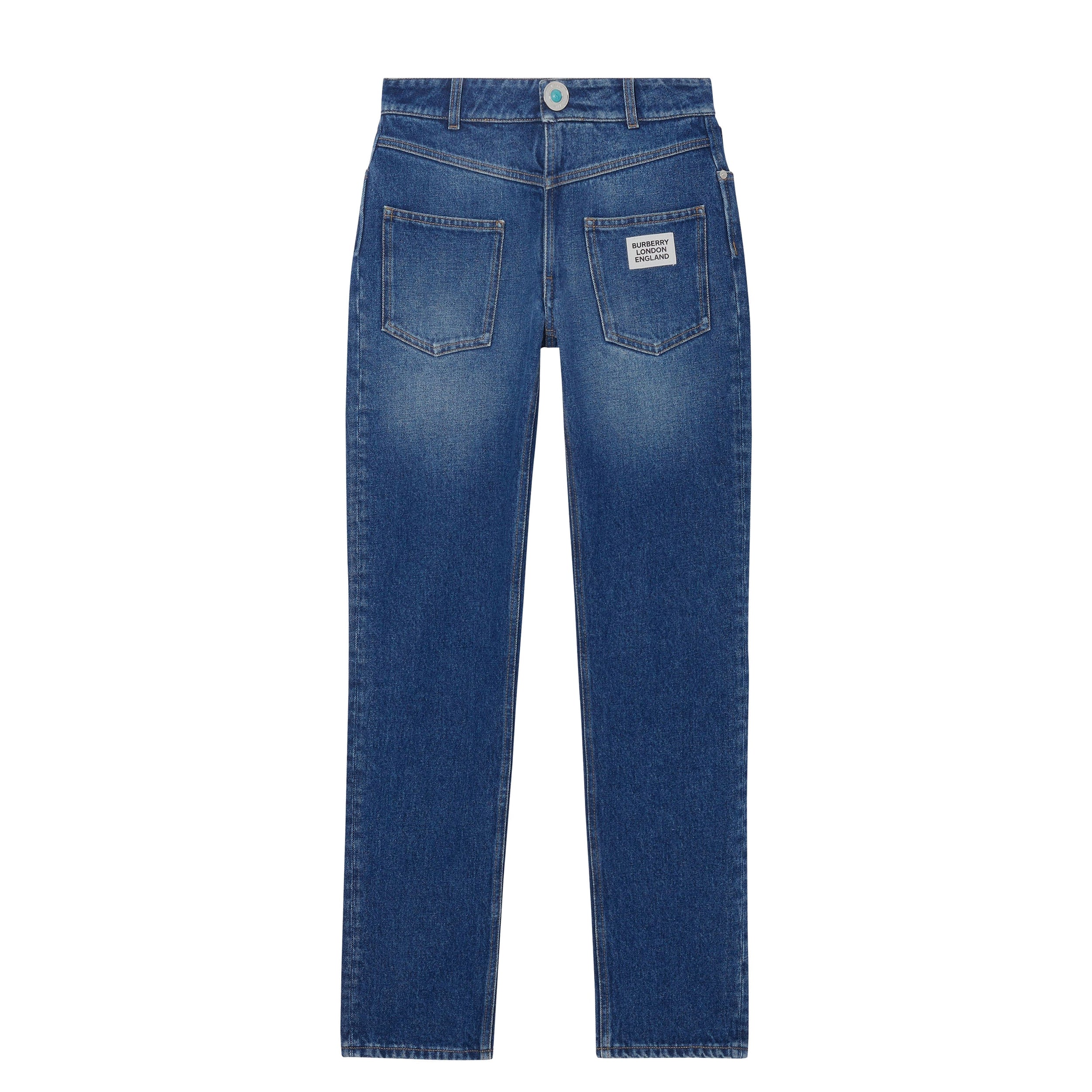 Jean droit revisité de poches déstructurées et arborant un bouton orné d'un lapis-lazuli.