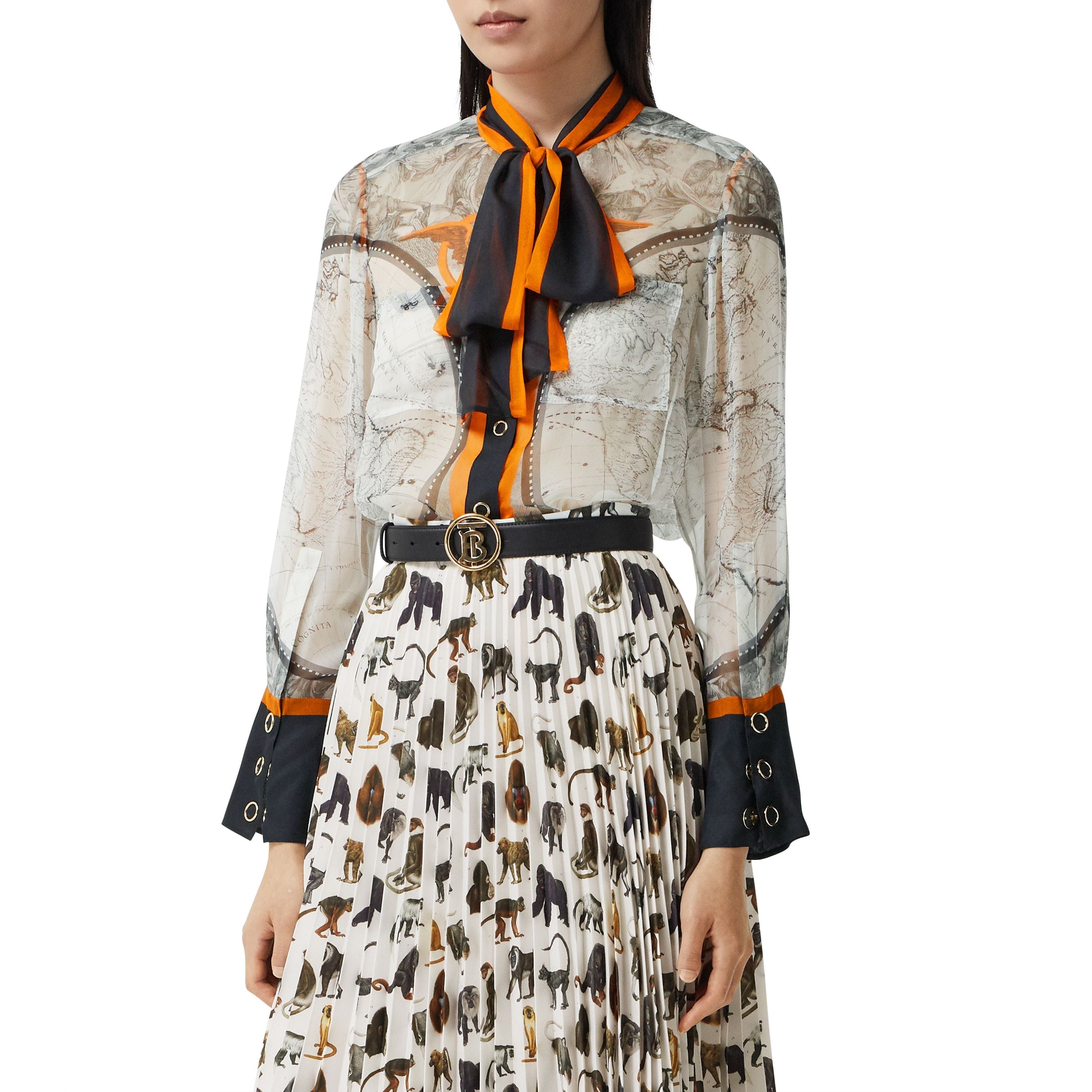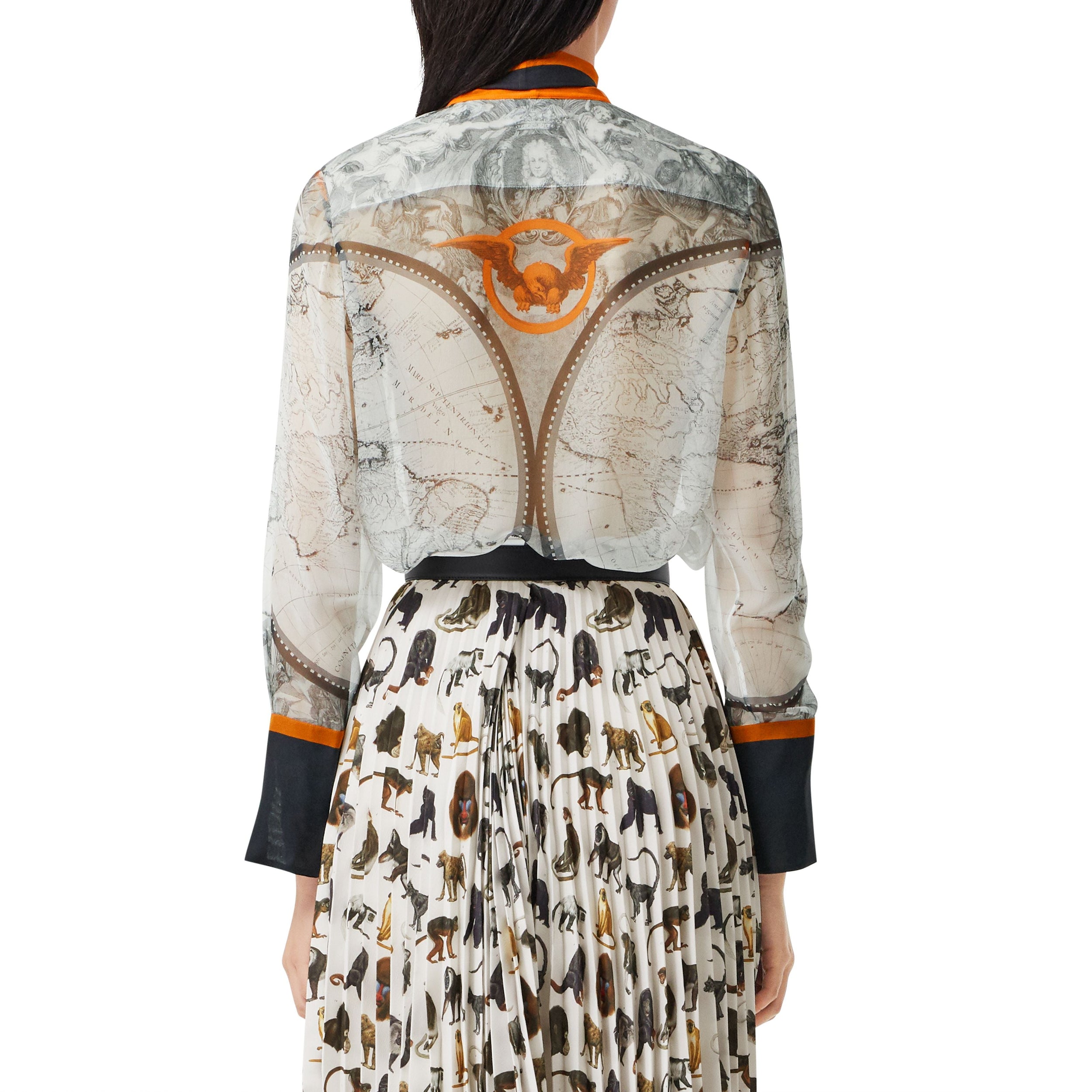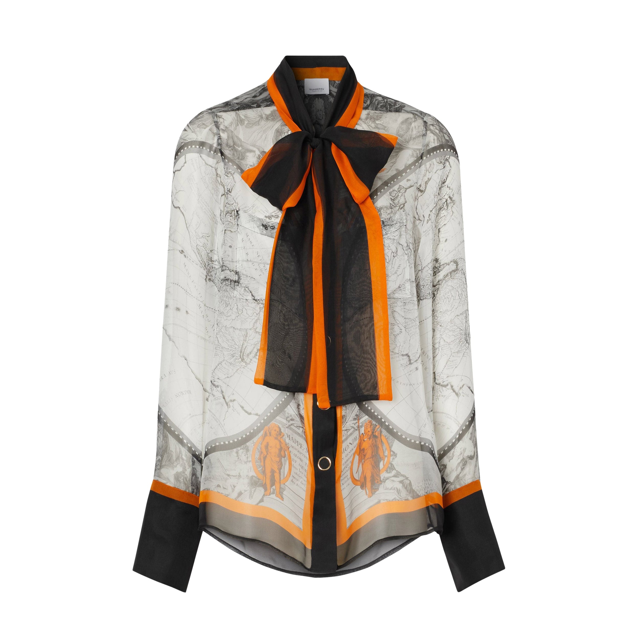 Chemisier à col lavallière en mousseline de soie tissée en Italie, orné d'un imprimé représentant une carte du monde du XVIIIe siècle revisitée.