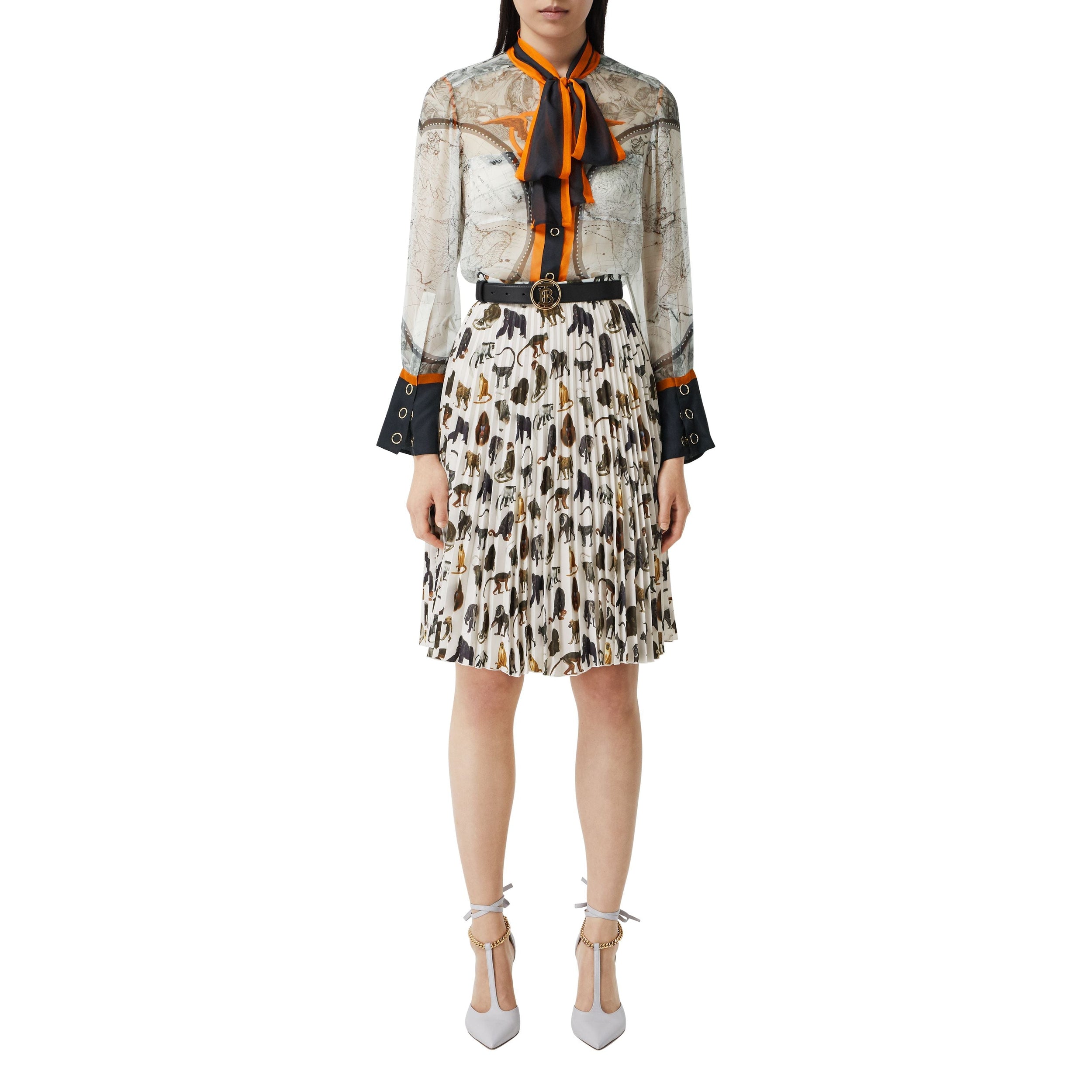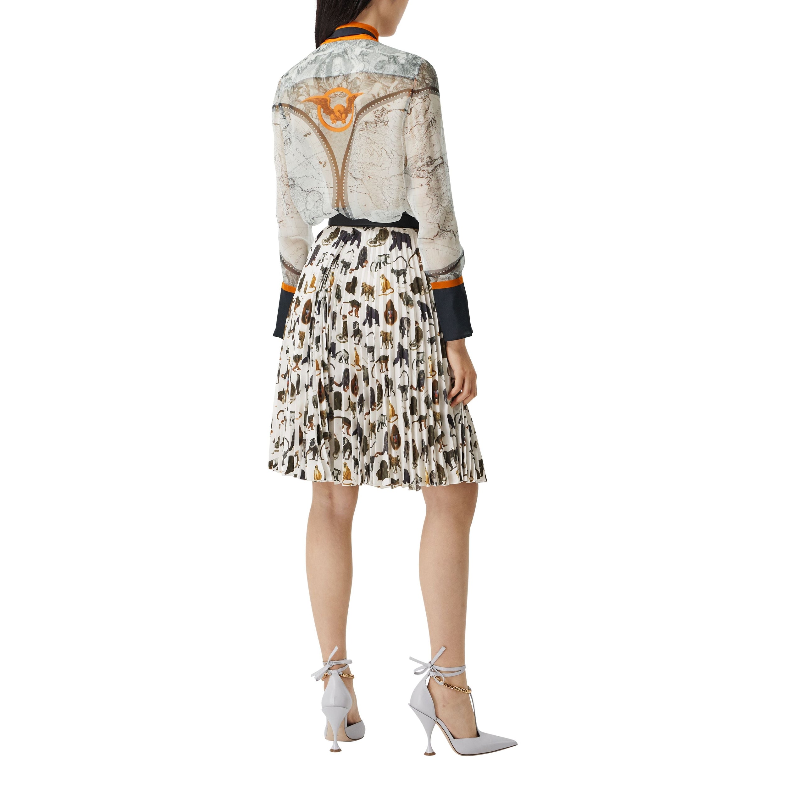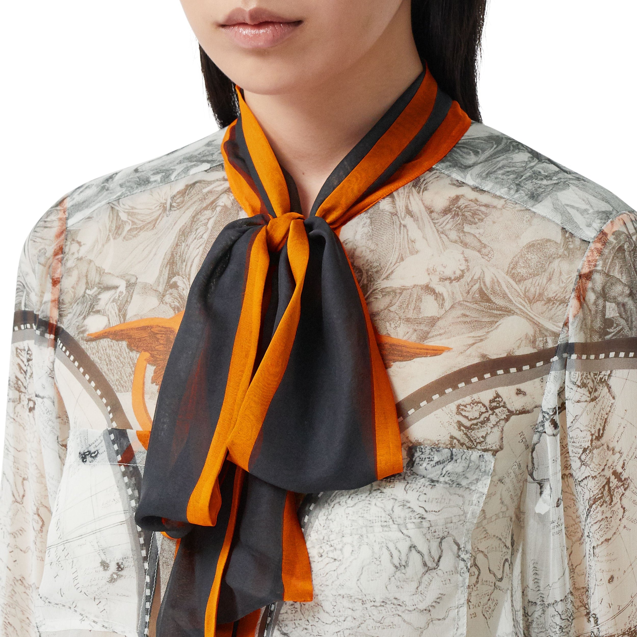 Chemisier à col lavallière en mousseline de soie tissée en Italie, orné d'un imprimé représentant une carte du monde du XVIIIe siècle revisitée.