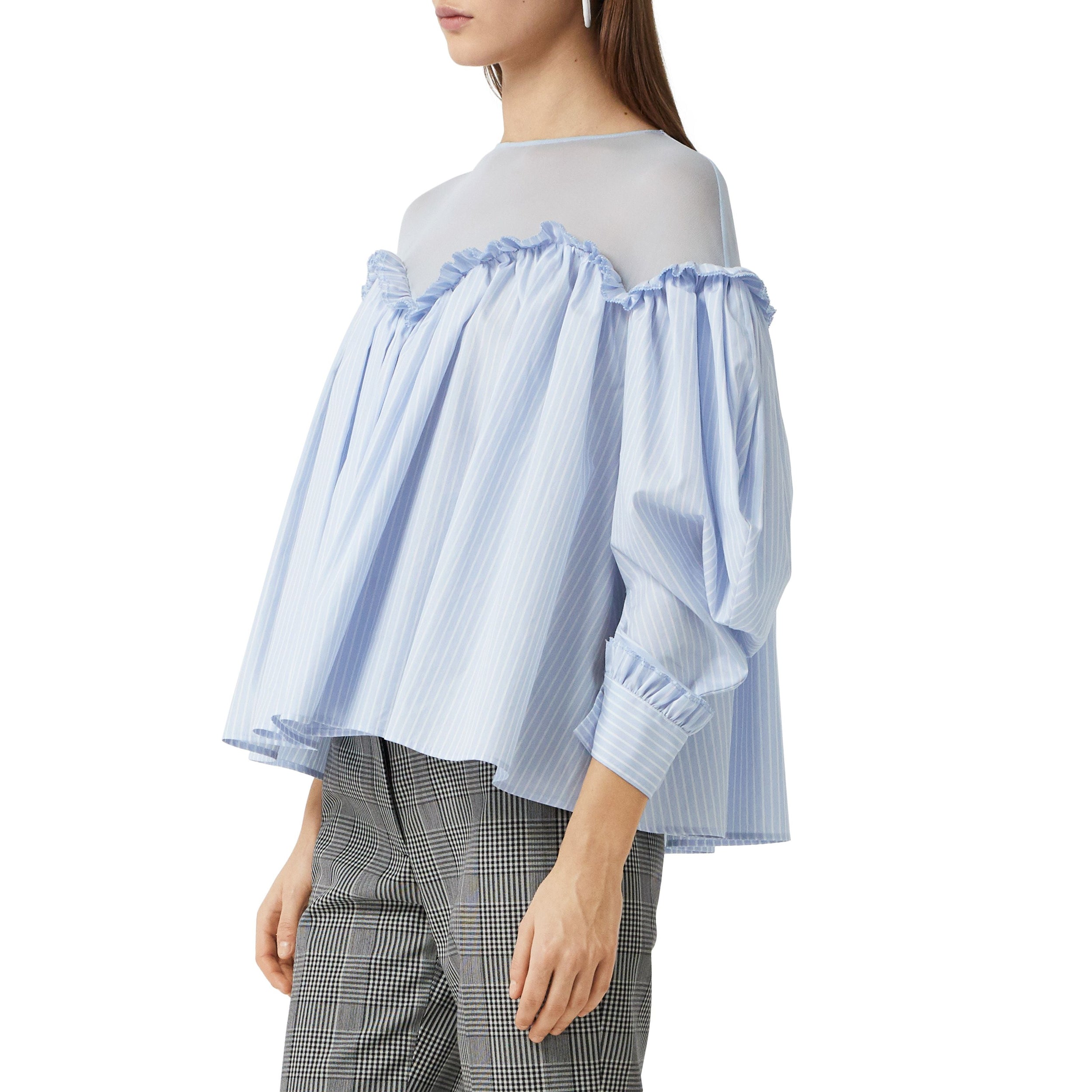 Ce chemisier volumineux en coton rayé tissé en Italie est agrémenté d'un empiècement en jersey pour une touche de contraste. La pièce est dotée de manches bouffantes froncées et de volants.
