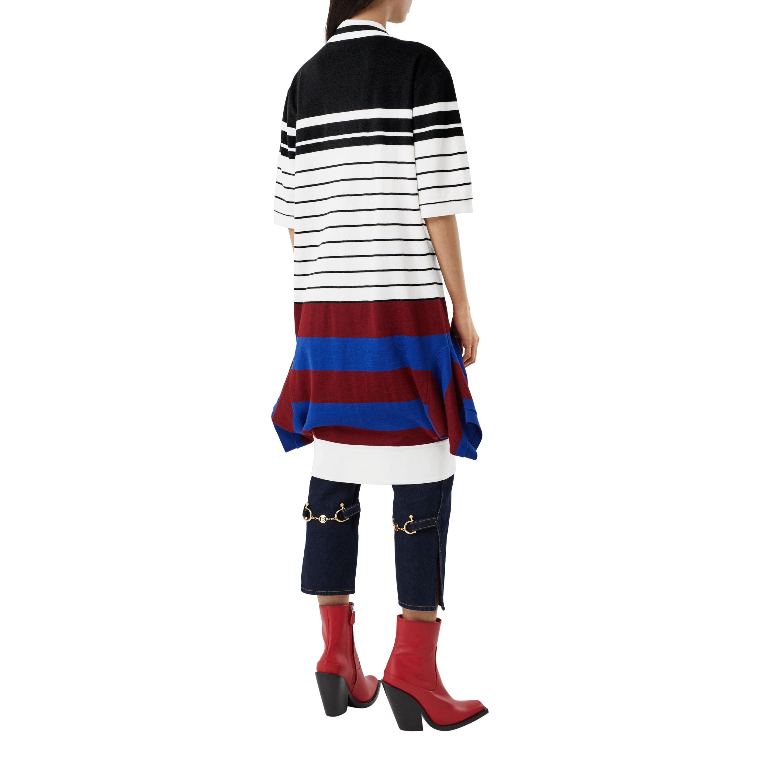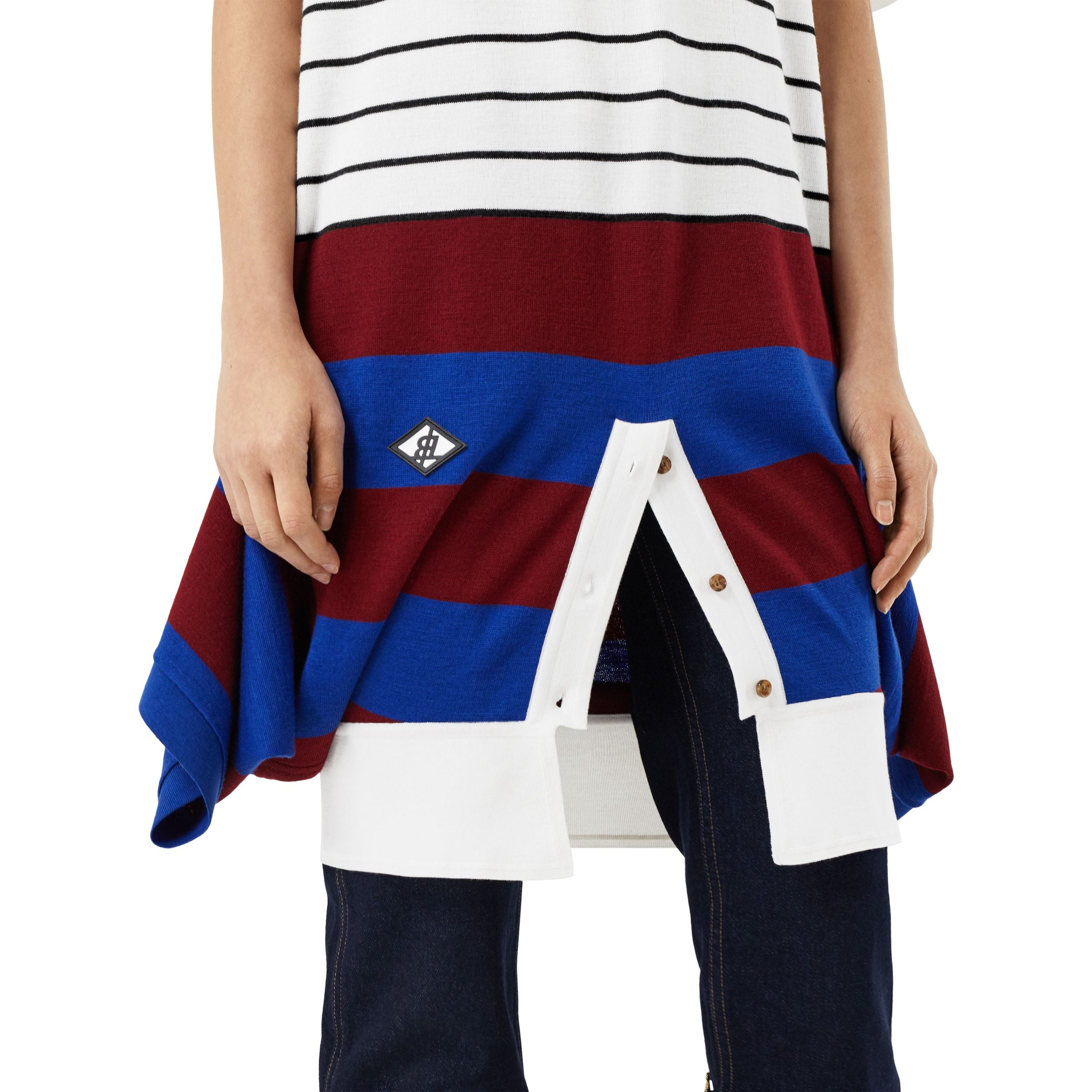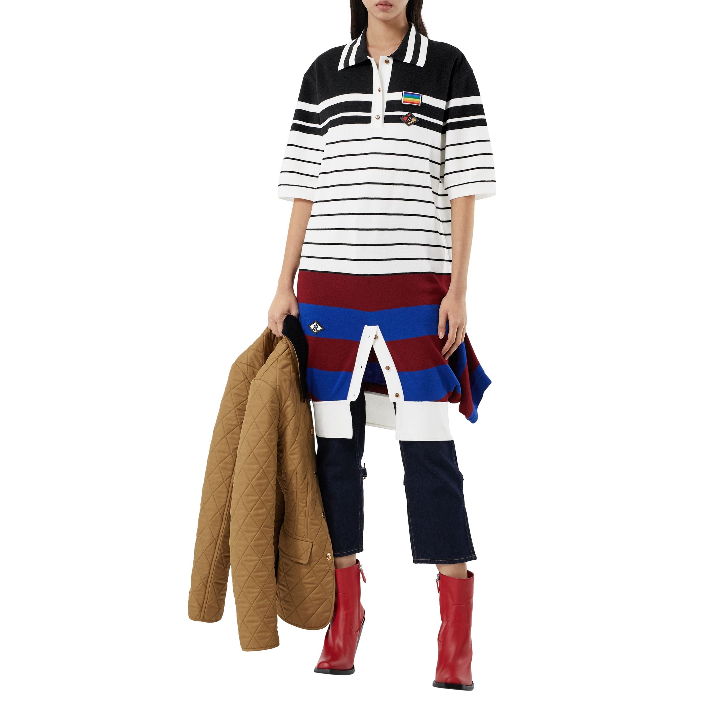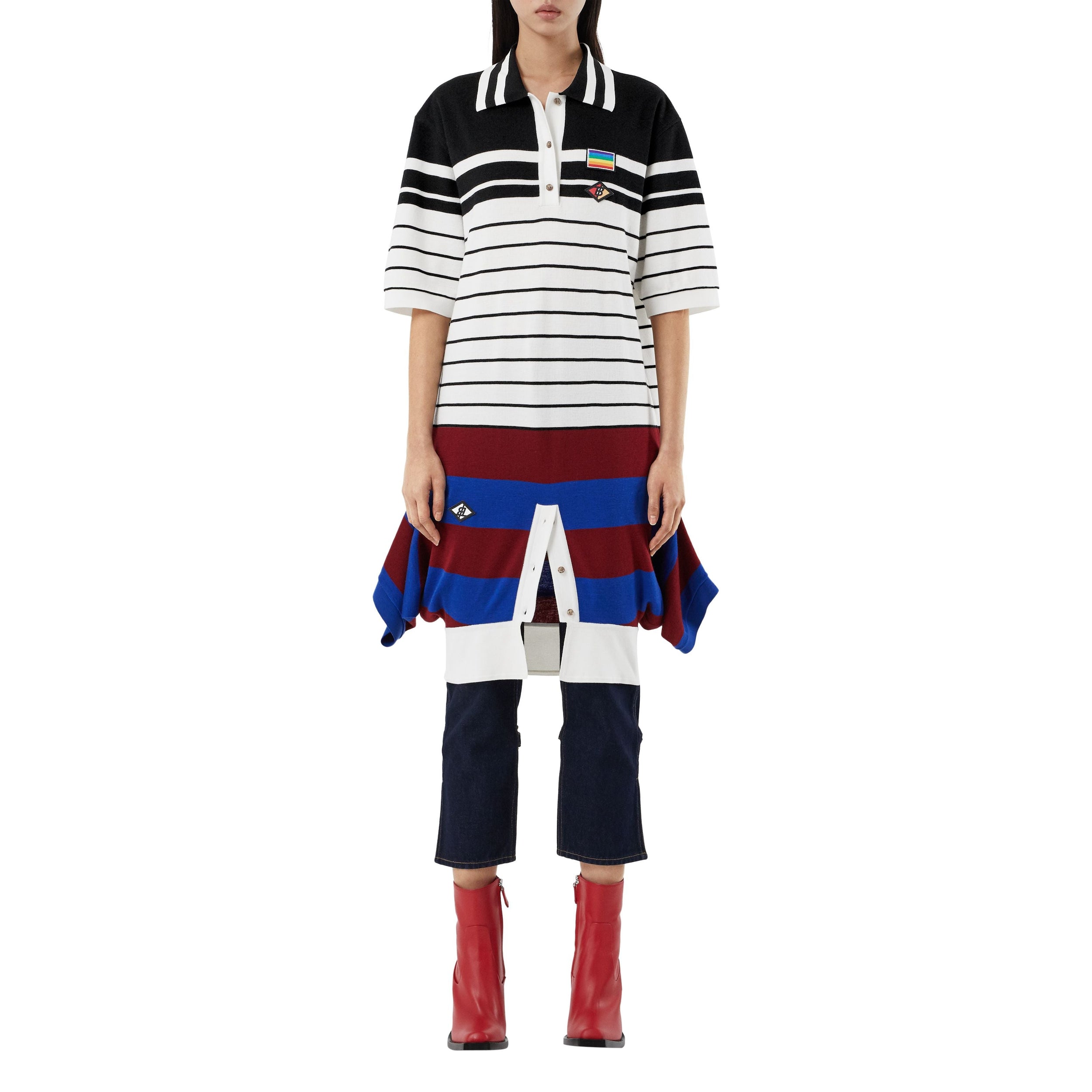 La pièce sportswear incontournable est revisitée en robe en laine mérinos rayée, sublimée de logos appliqués inspirés de la culture britannique des années 1990.