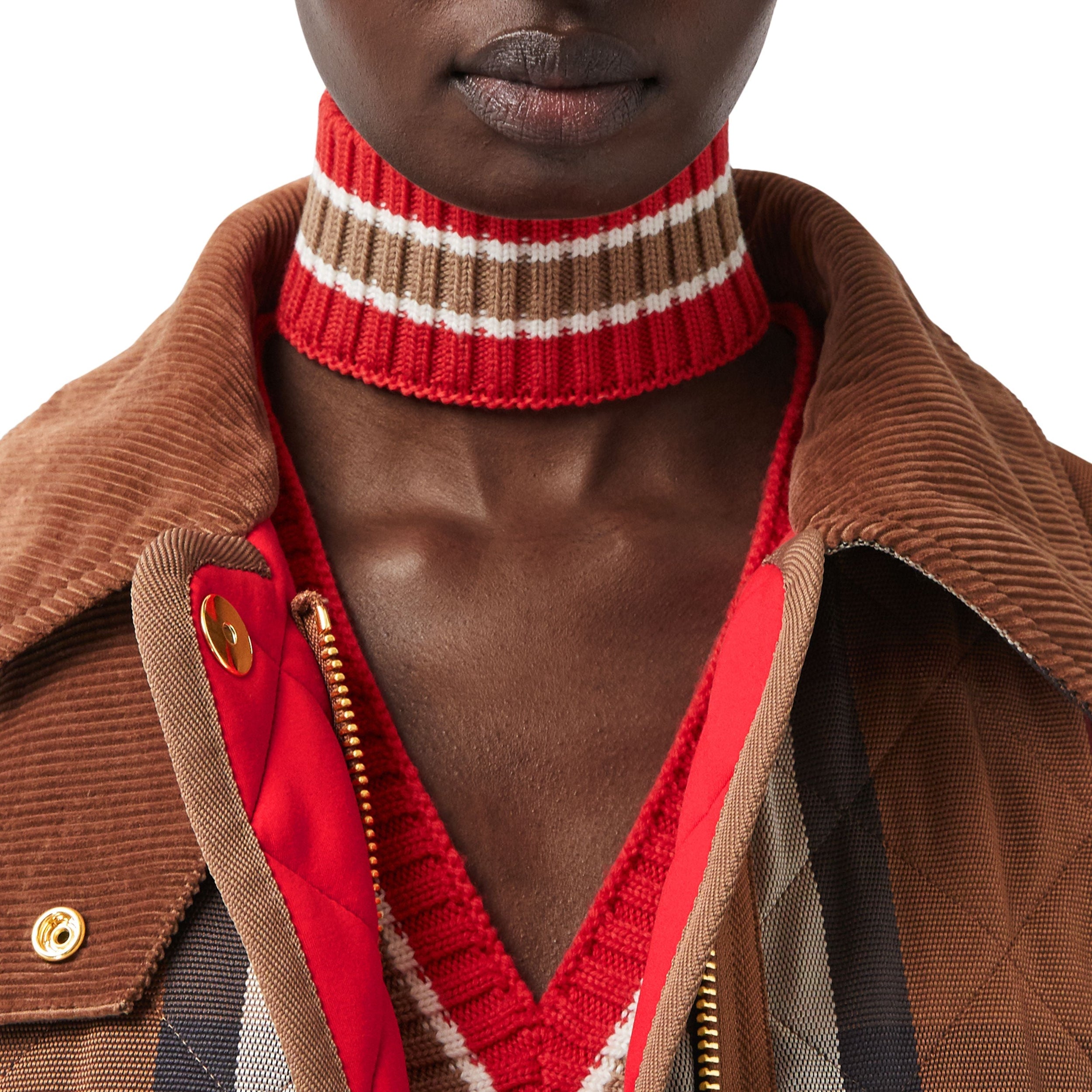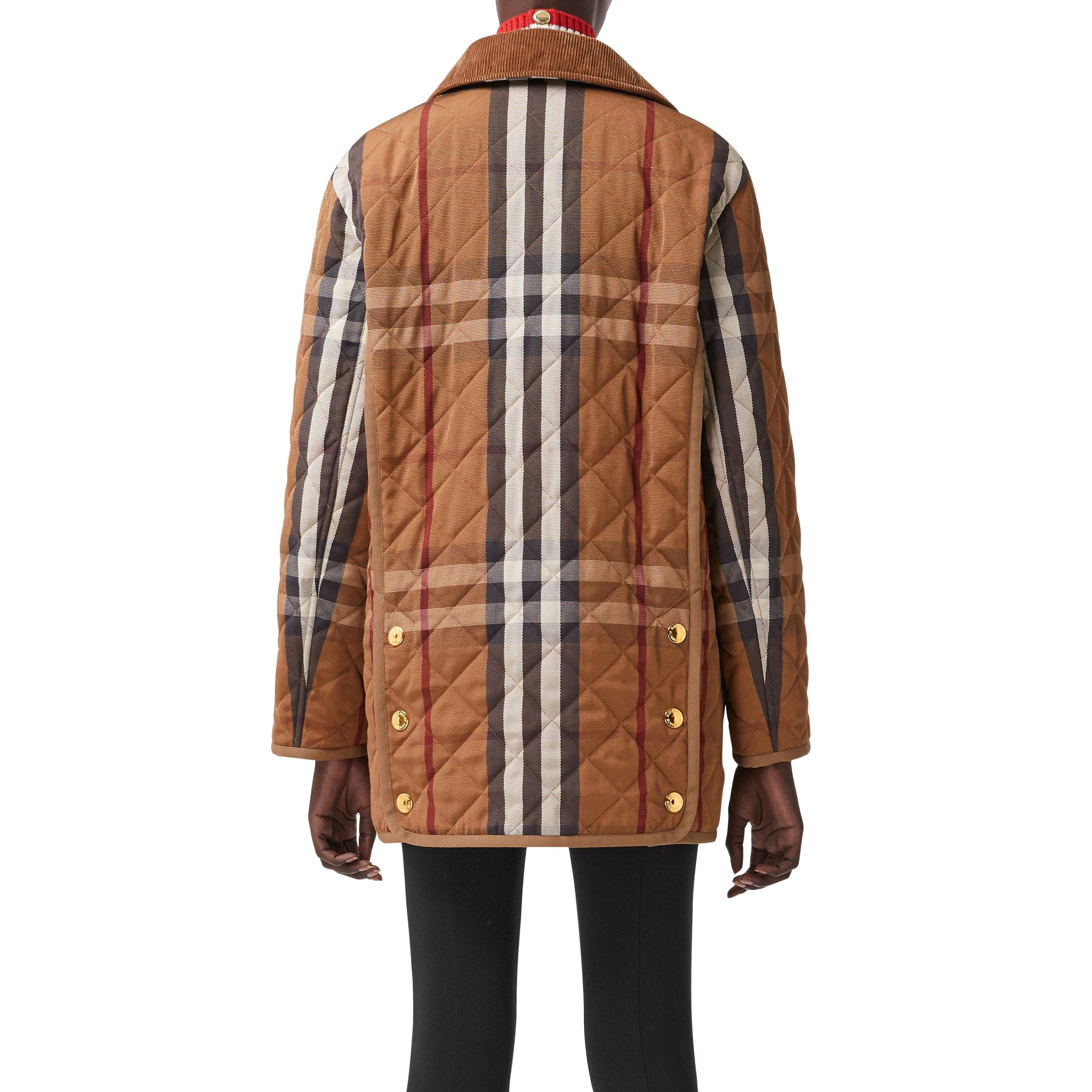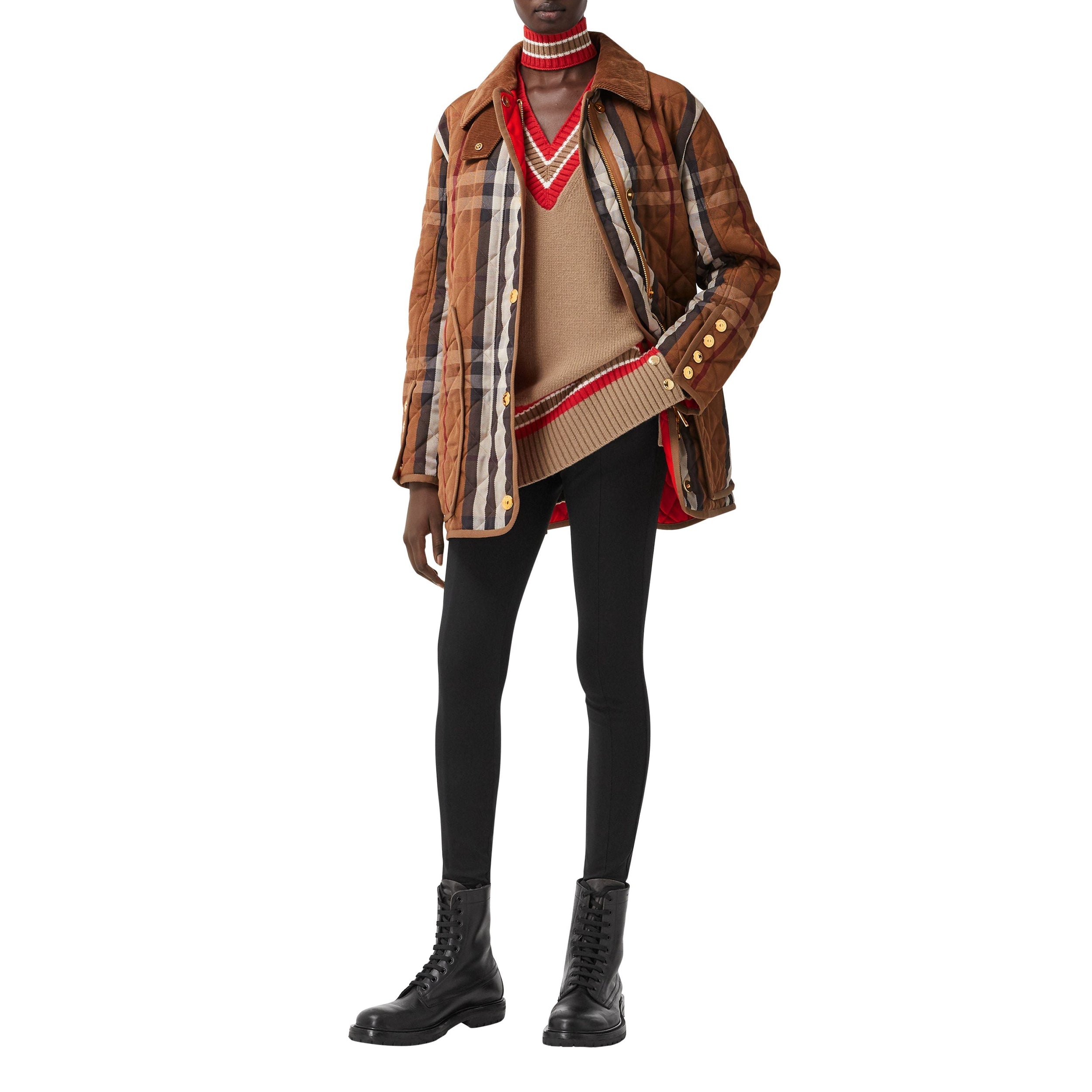 Cette veste de campagne matelassée est confectionnée en coton technique à motif check. La pièce est agrémentée d'un col en velours côtelé et d'une doublure de couleur différente.