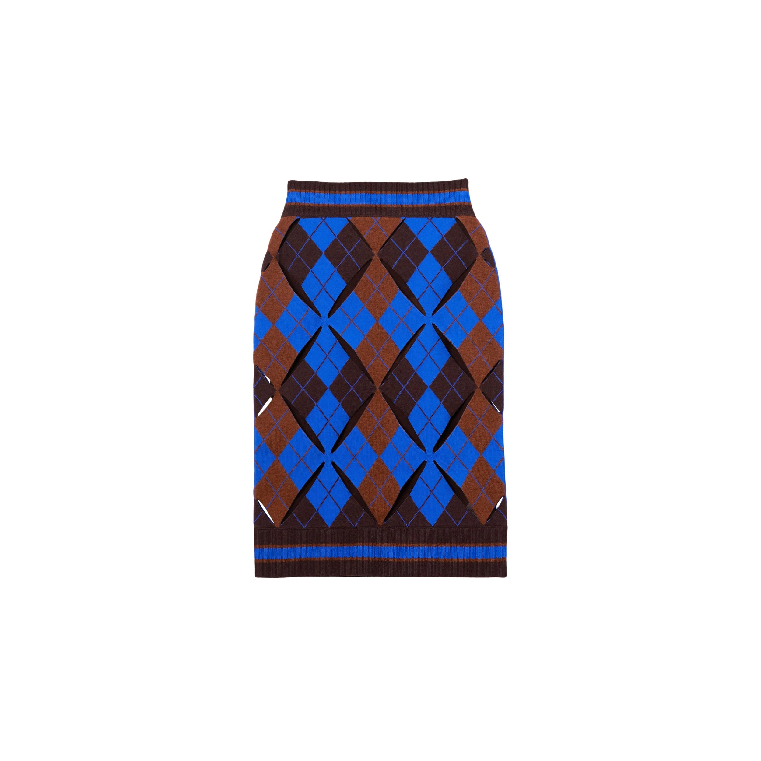 Cette jupe crayon tricotée en laine technique est ornée d'un motif argyle tissé en jacquard. La pièce est agrémentée de découpes et de larges bordures en maille côtelée.
