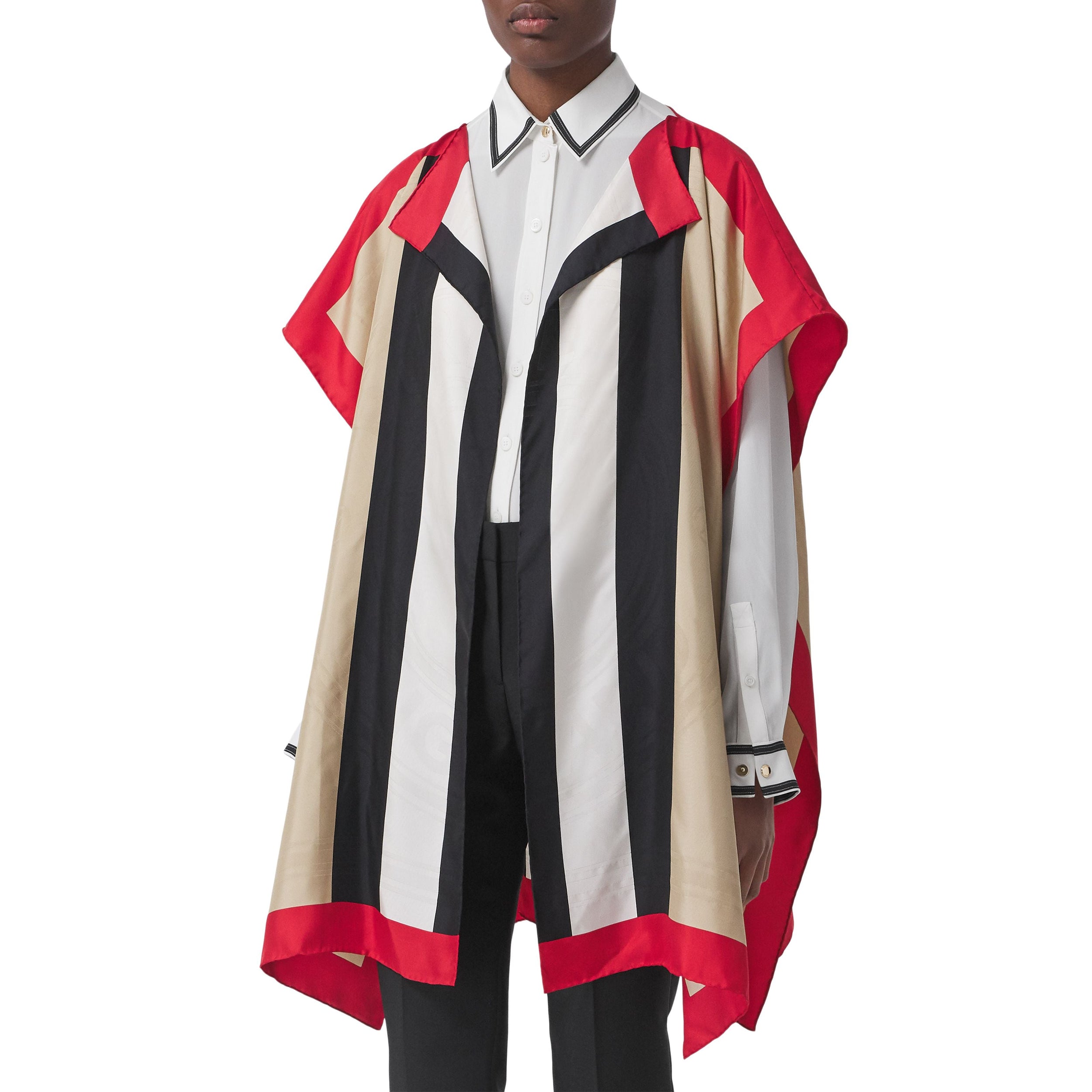 Cette cape élégante est confectionnée à partir de deux foulards en sergé de soie tissé en Italie. La pièce est sublimée d'une version graphique de nos rayures iconiques en sérigraphie.