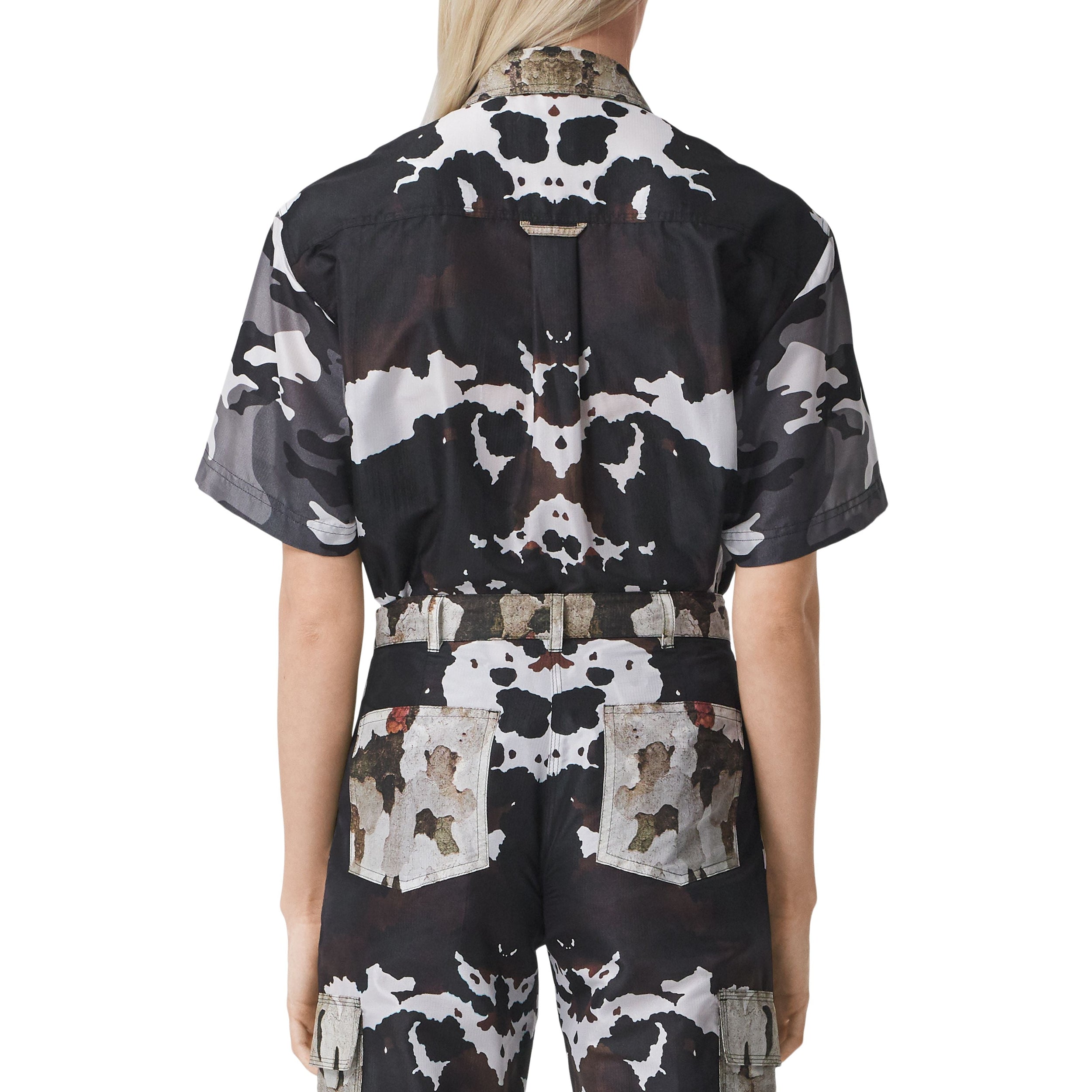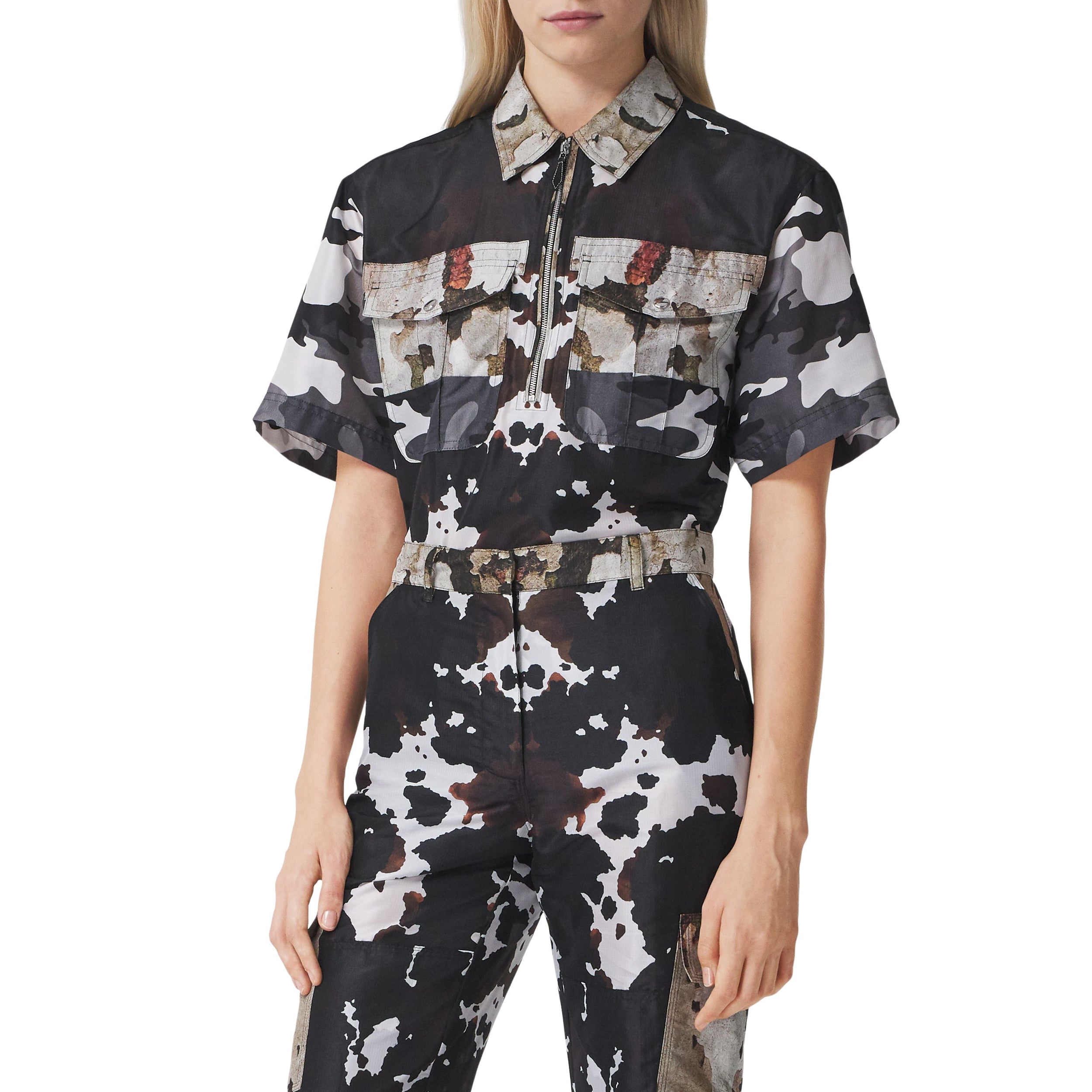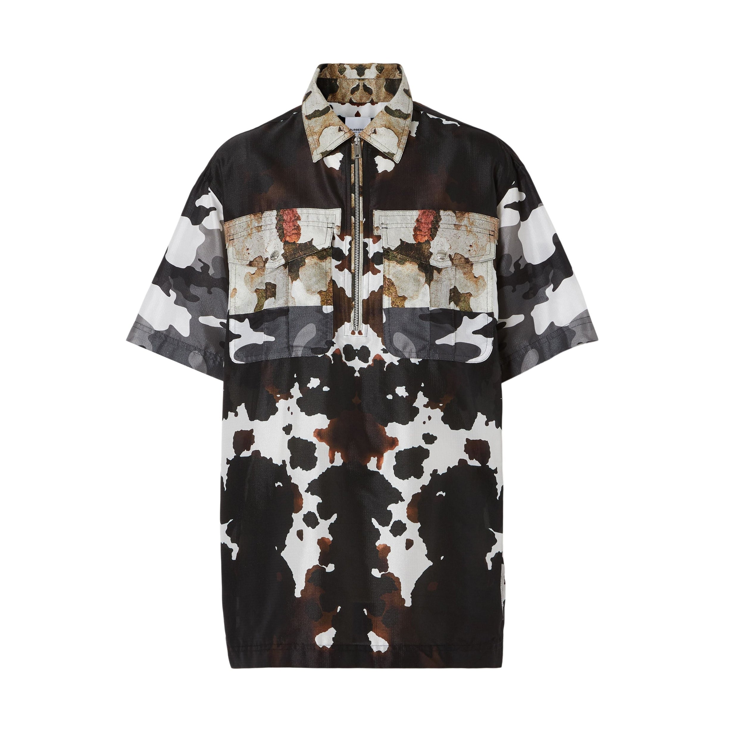 Cette chemise à manches courtes est animée d'imprimés camouflage de couleurs différentes. La pièce est dotée d'une patte semi-zippée utilitaire et de poches à rabat.