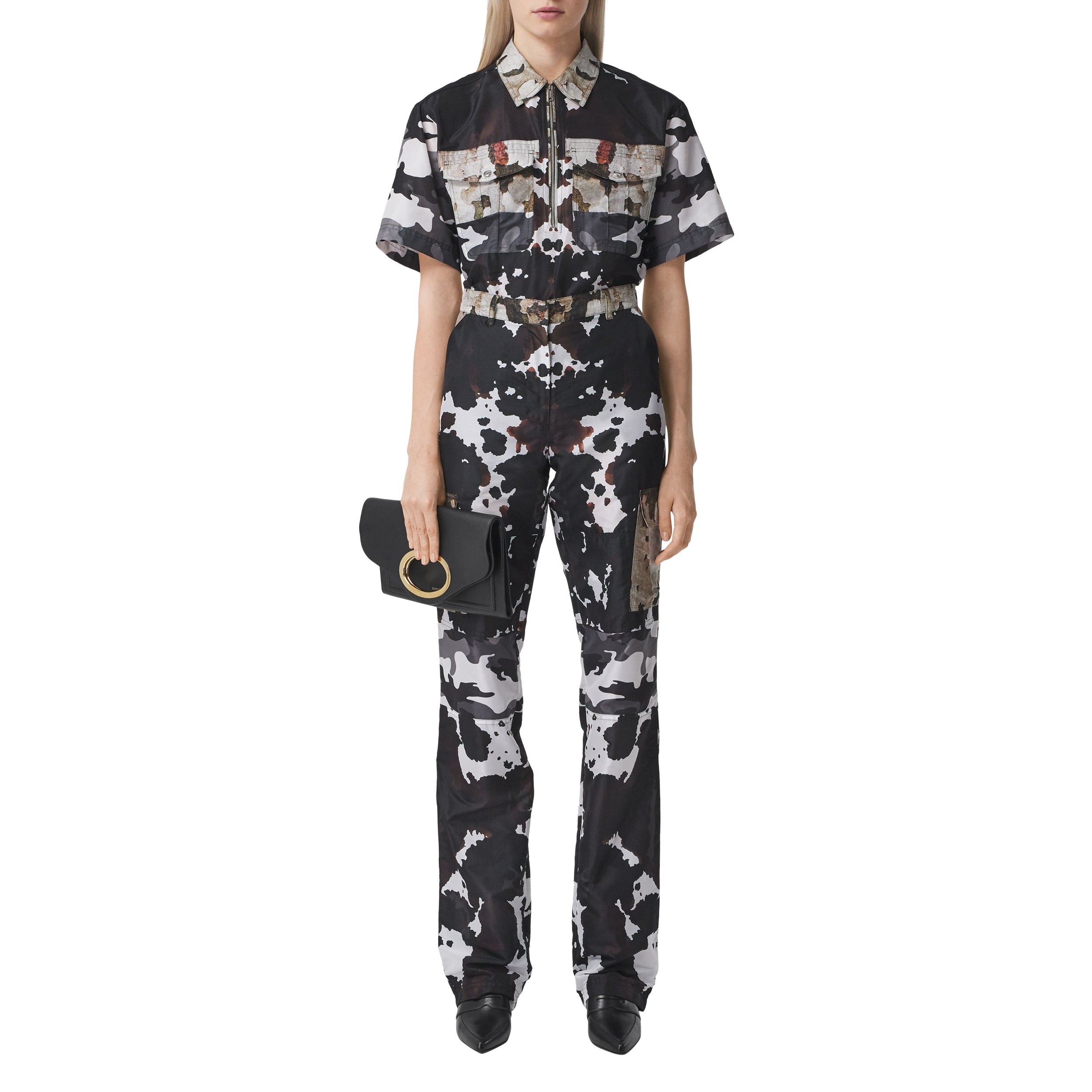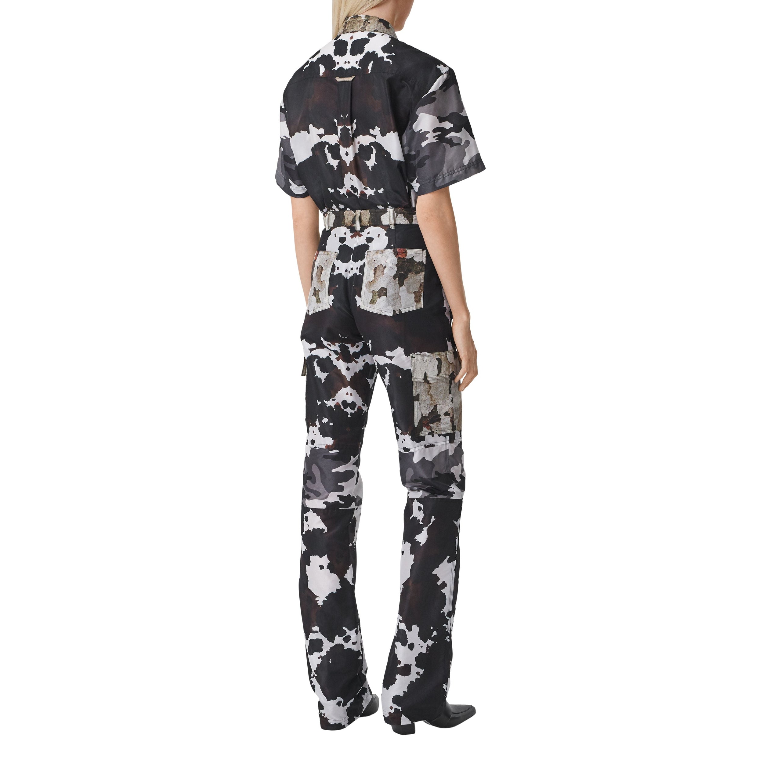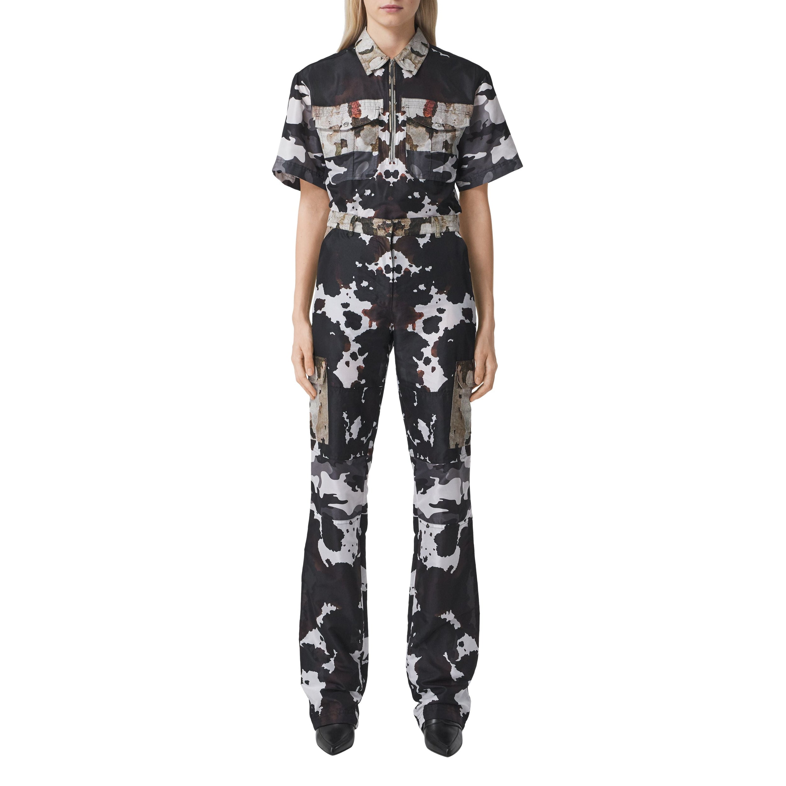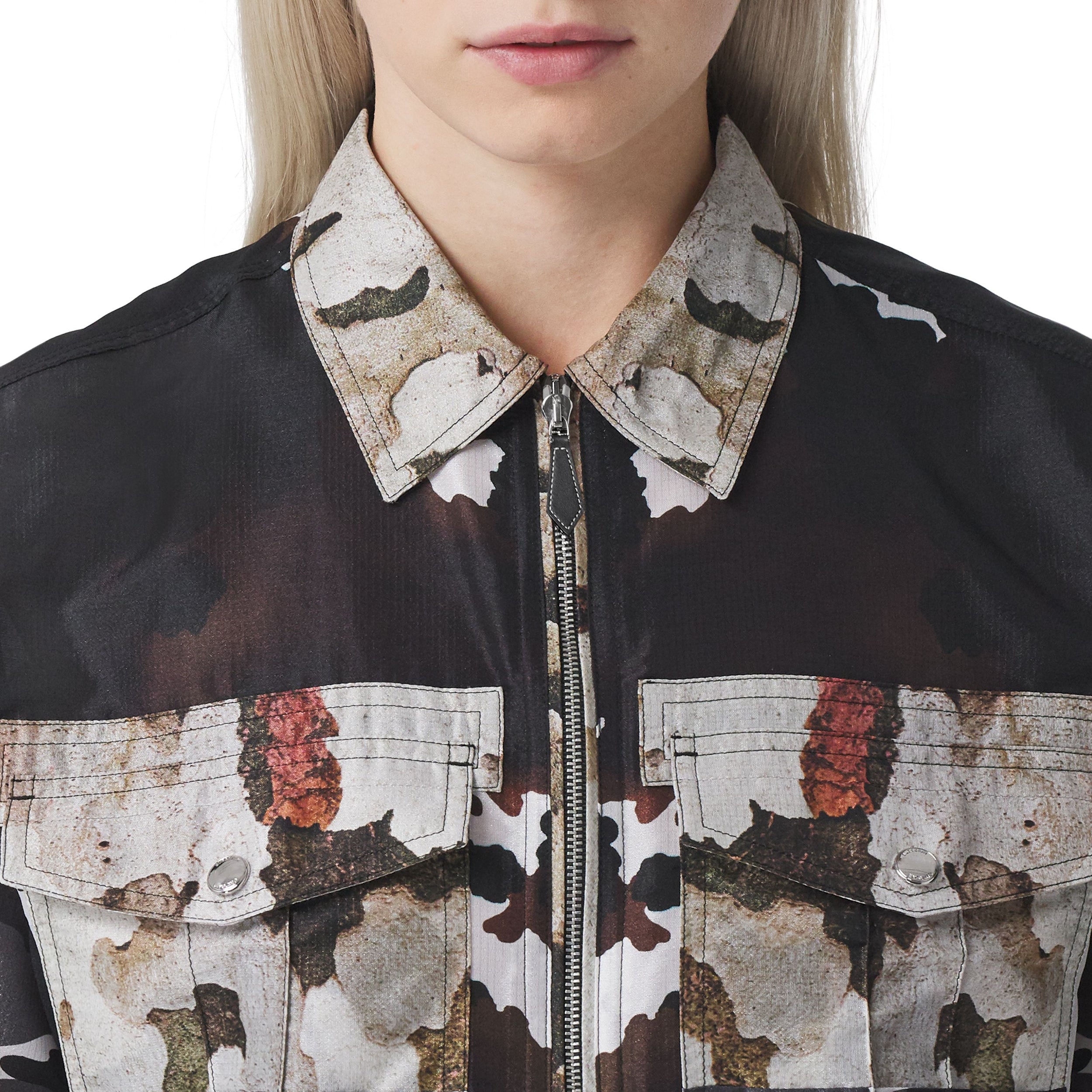 Cette chemise à manches courtes est animée d'imprimés camouflage de couleurs différentes. La pièce est dotée d'une patte semi-zippée utilitaire et de poches à rabat.
