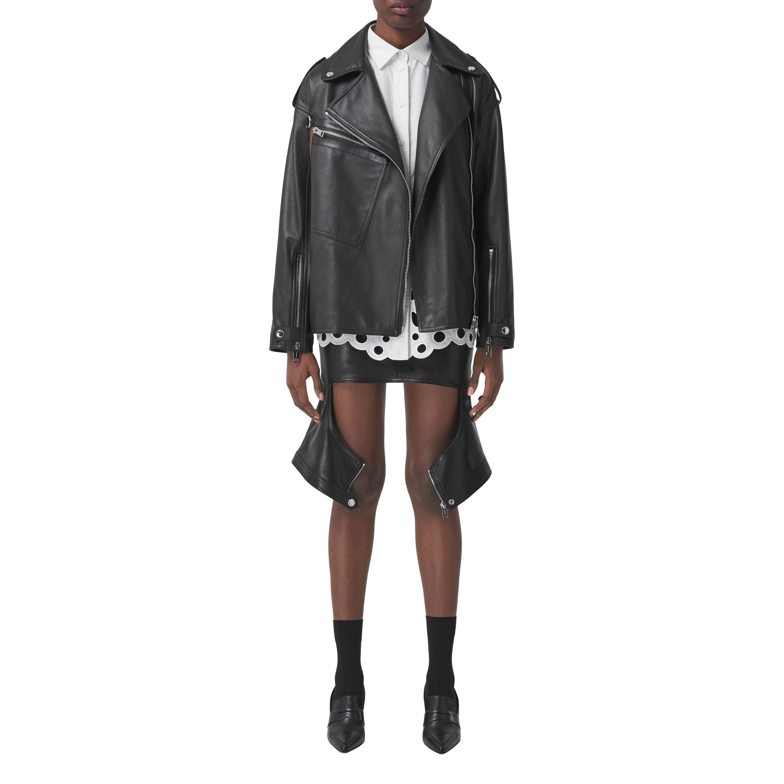 Cette minijupe confectionnée en Italie en cuir d'agneau stretch souple est revisitée de découpes et de zips polis.
