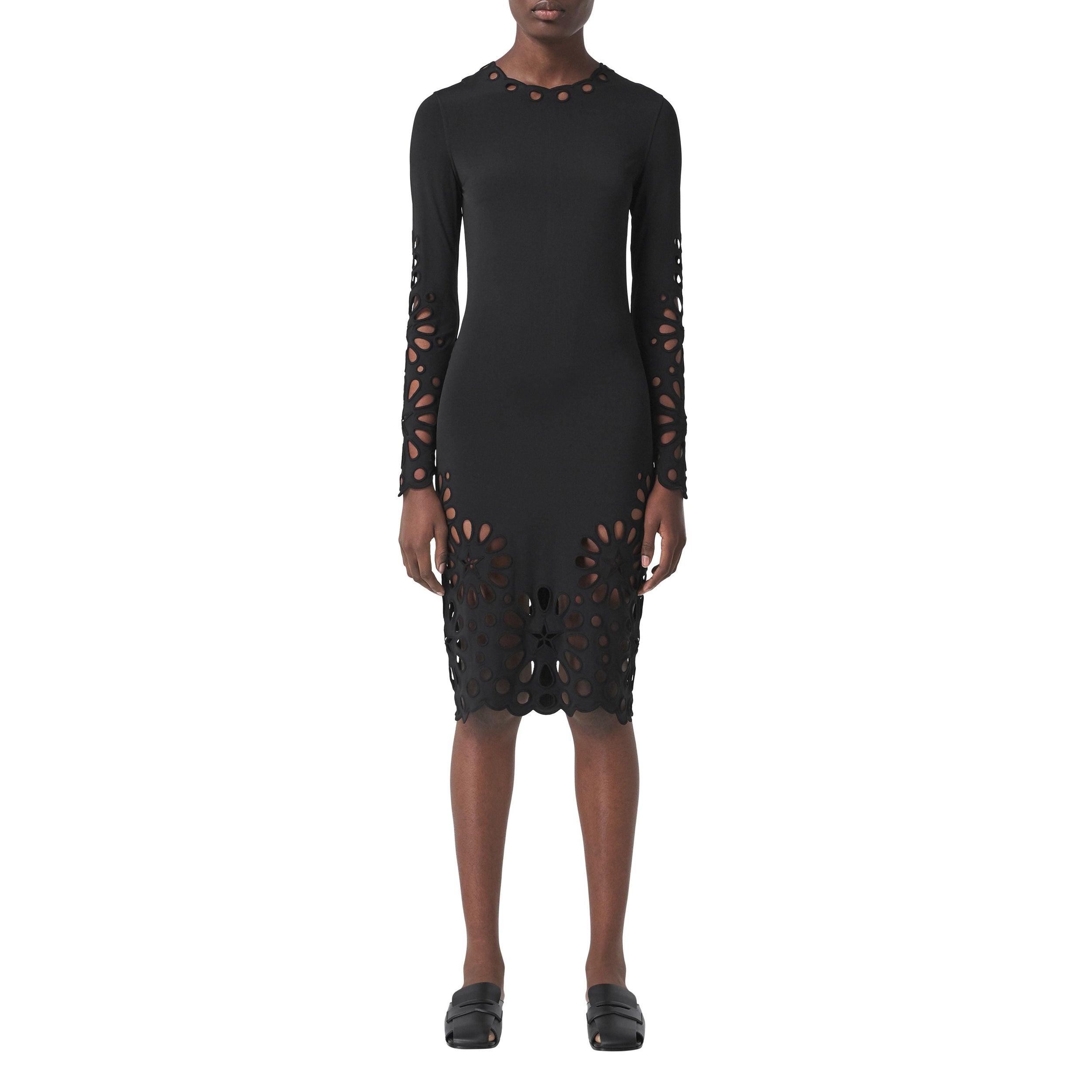 Cette robe à manches longues en jersey stretch confectionnée en Italie est sublimée de broderies anglaises surdimensionnées.