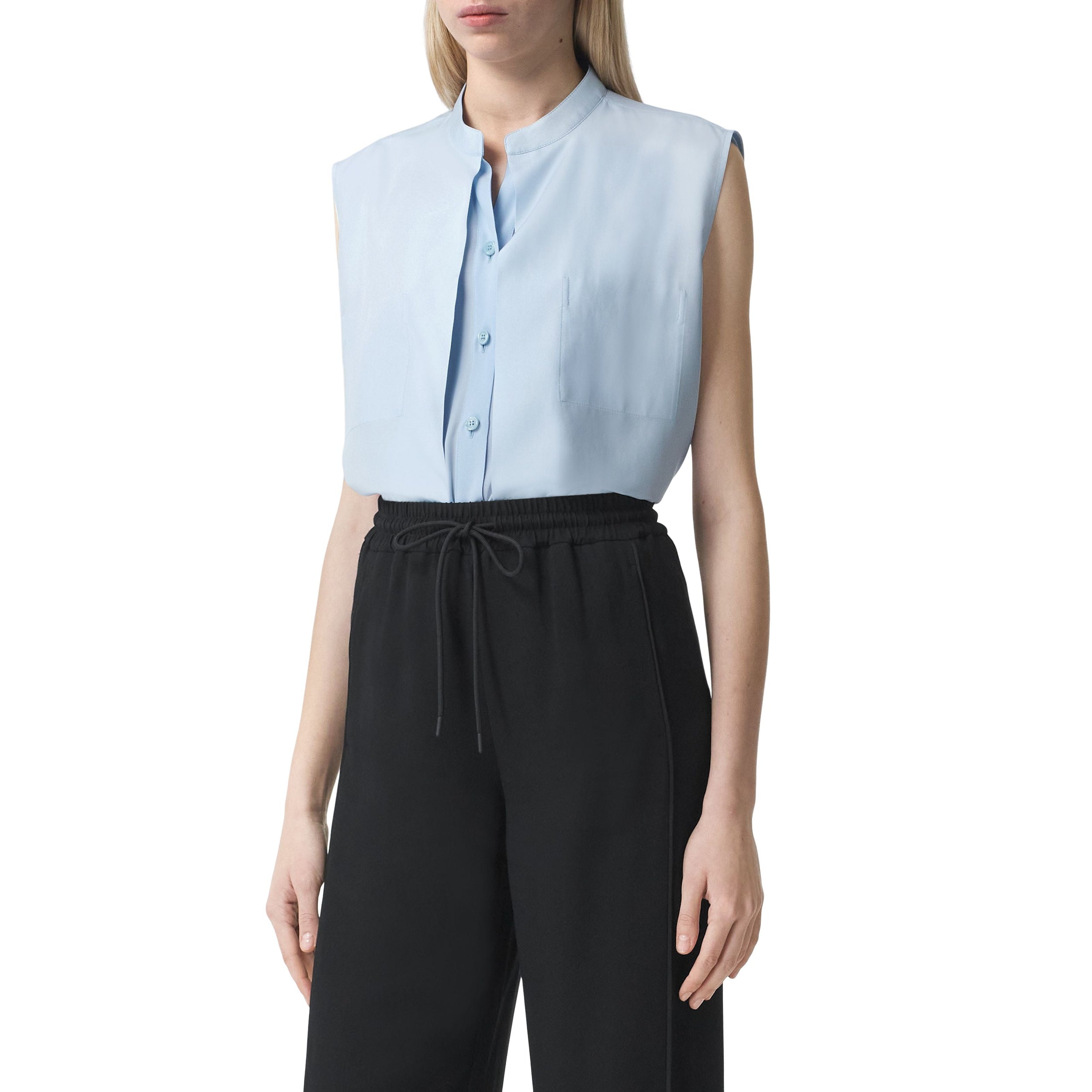 Cette chemise sans manches double épaisseur est confectionnée en crêpe de soie de Chine fluide. La pièce est agrémentée d'un col officier, de poches poitrine plaquées et de notre logo.