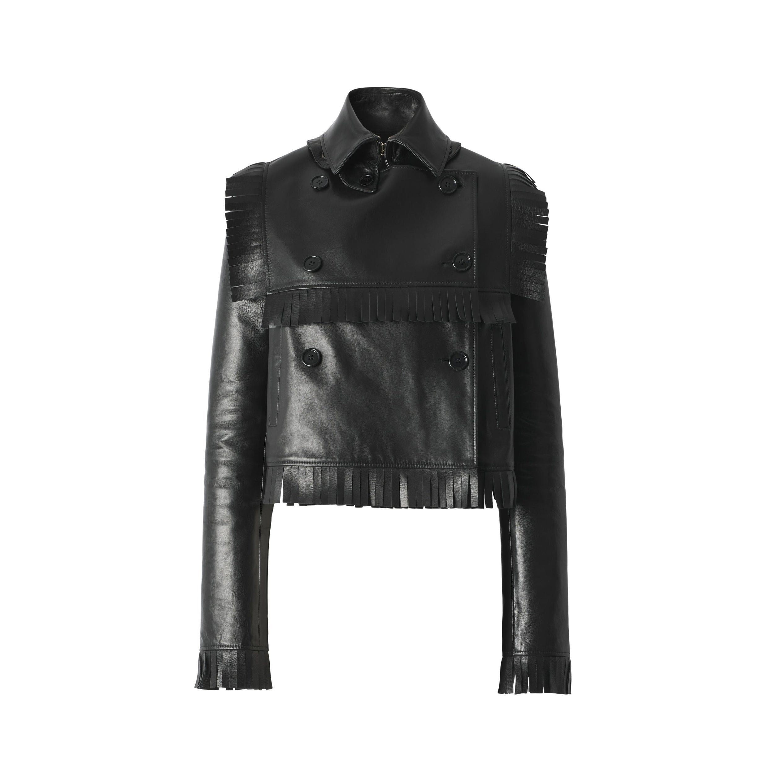 Trench-coat court sublimé par des franges et un col en pointe amovible.