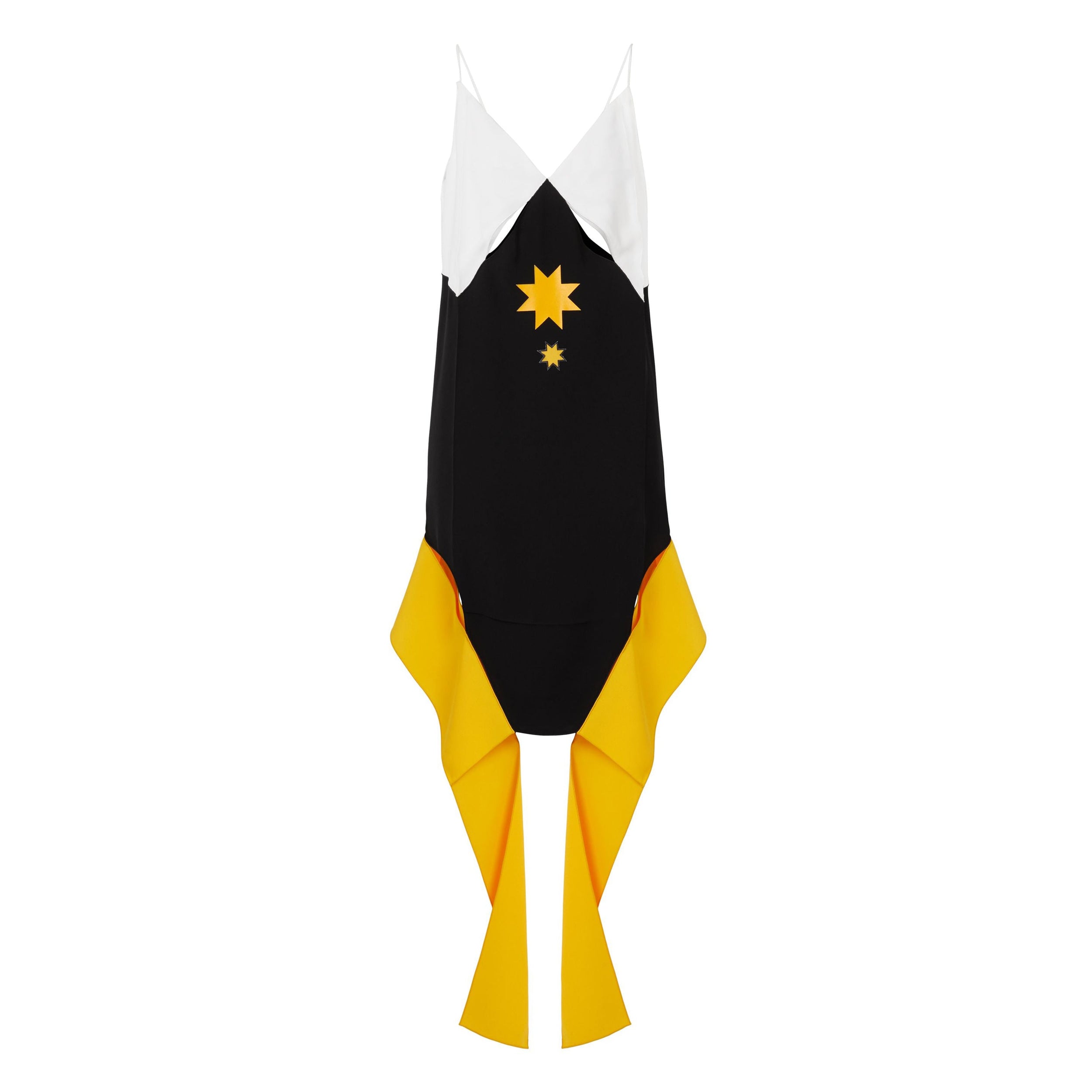 Cette robe combinaison en satin est sublimée d’un imprimé géométrique et de panneaux surdimensionnés au niveau de la base. Le modèle fait partie de la collection femme Automne-Hiver 2021 signée Riccardo Tisci, une interprétation audacieuse de la féminité moderne célébrant la liberté d'expression.