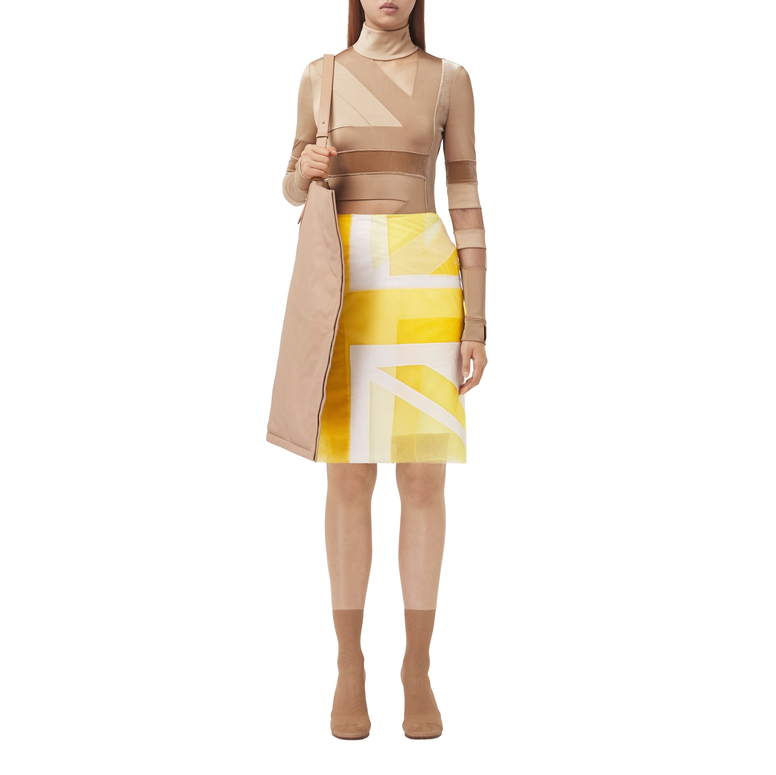 Cette jupe confectionnée en Italie en tulle et soie arbore un jeu délicat sur les textures et la transparence. La pièce est ornée d'un drapeau en intarsia. Le modèle fait partie de la collection femme Automne-Hiver 2021 signée Riccardo Tisci, une interprétation audacieuse de la féminité moderne célébrant la liberté d'expression.