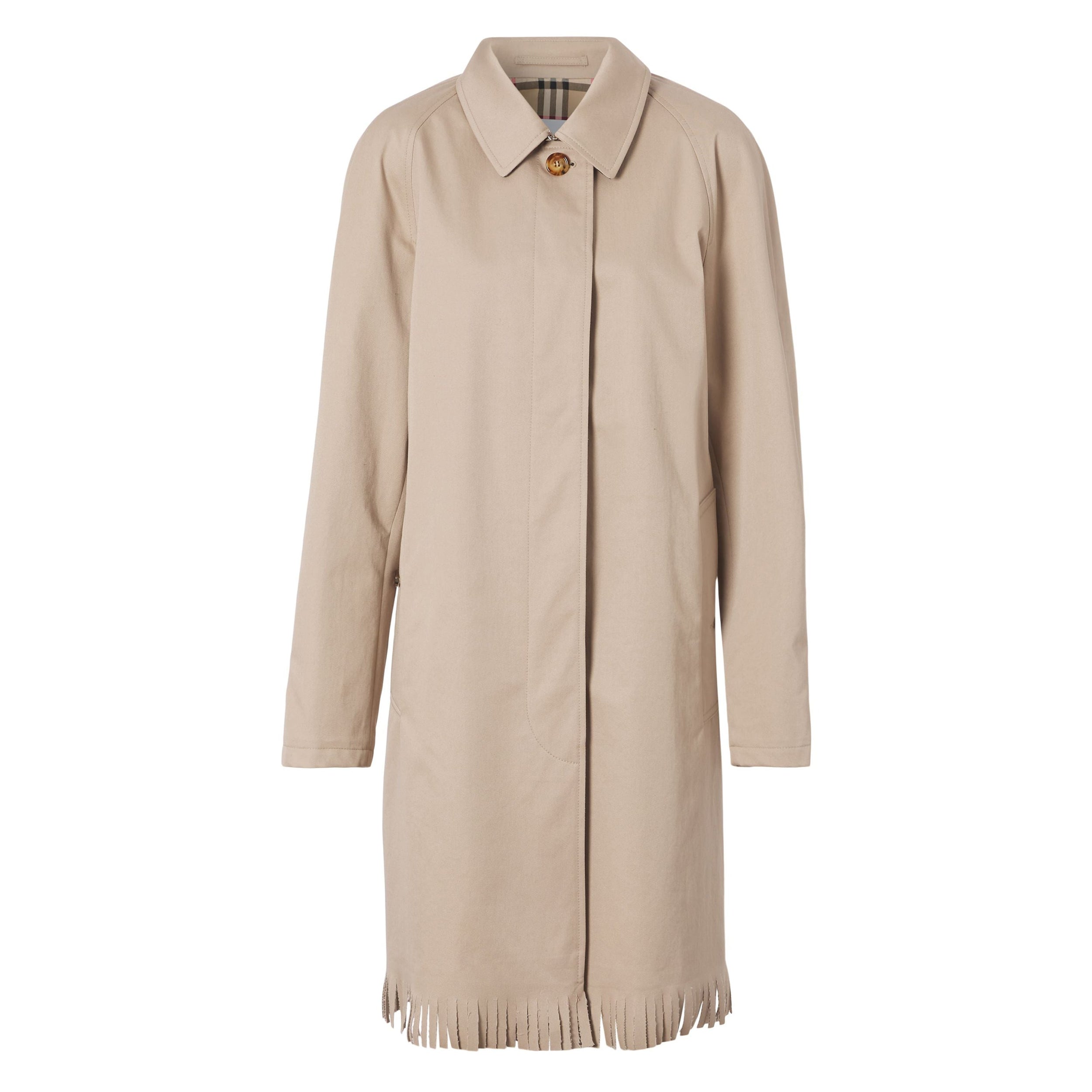 Notre Trench Camden en gabardine de coton est revisité d'une base à franges. Légèrement déstructurée, la pièce présente un motif Vintage check sur le dessous du col et sur la doublure pour une touche de contraste.