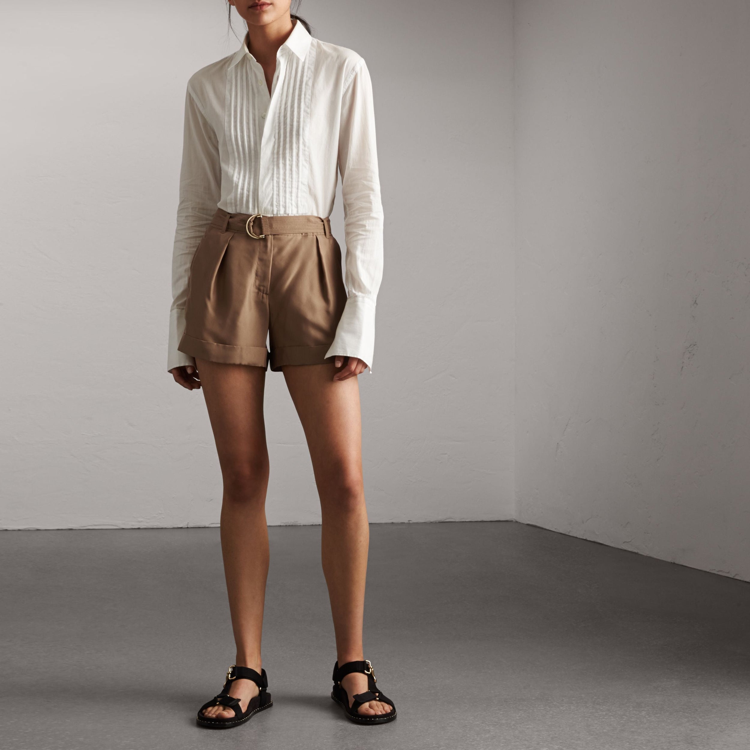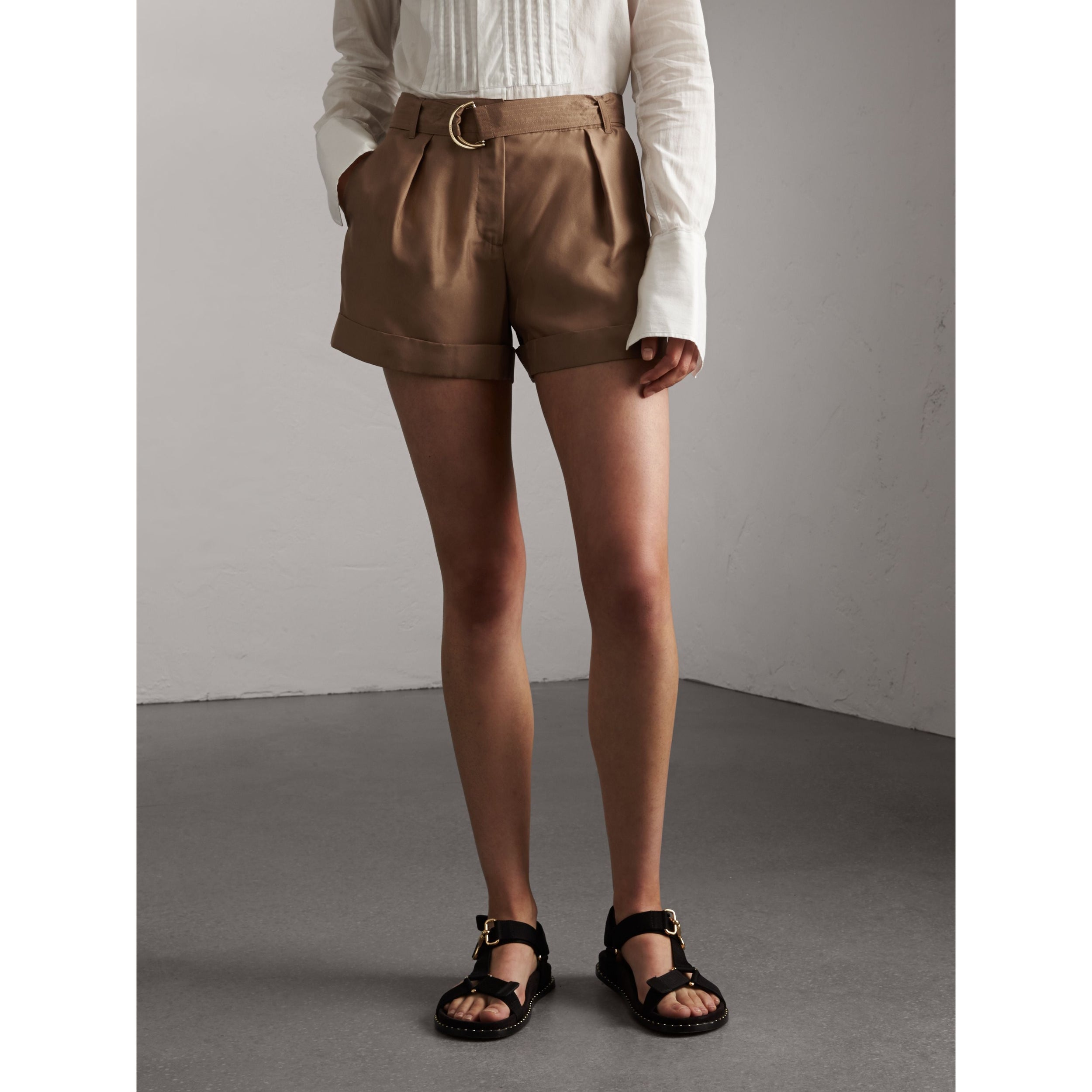 Short en soie orné de revers apparents et de détails à motif check sur l'envers. Ce modèle ceinturé se mariera aussi bien à un t-shirt blanc qu'à une chemise légèrement structurée.